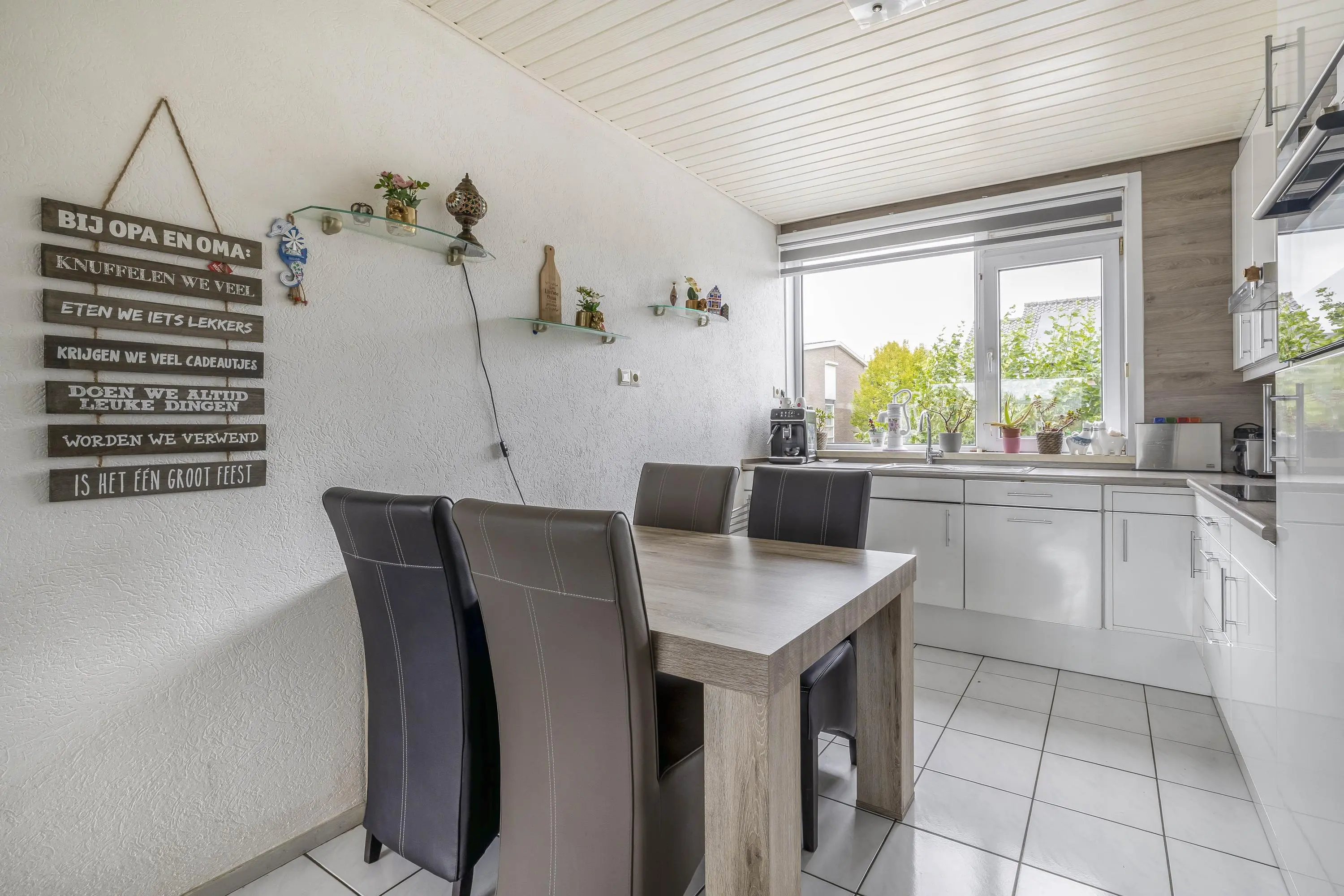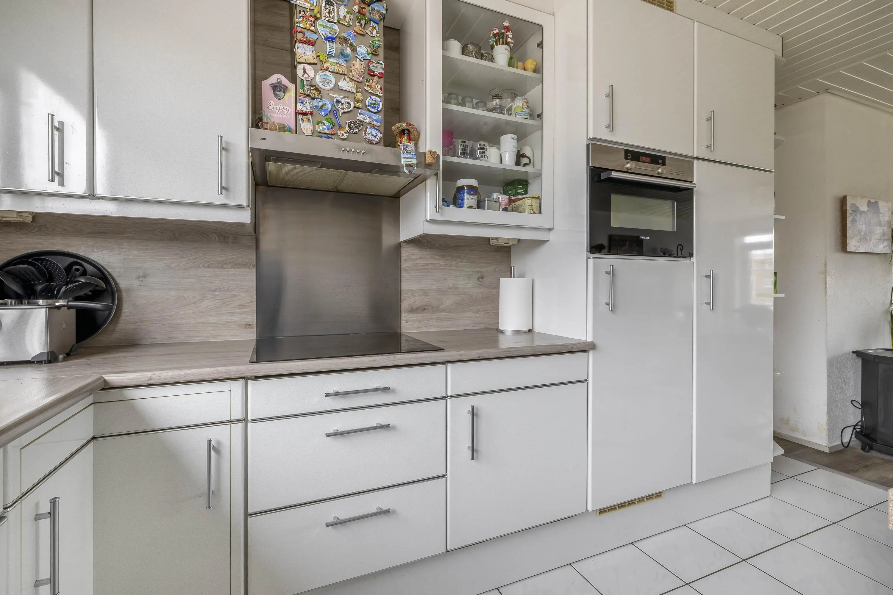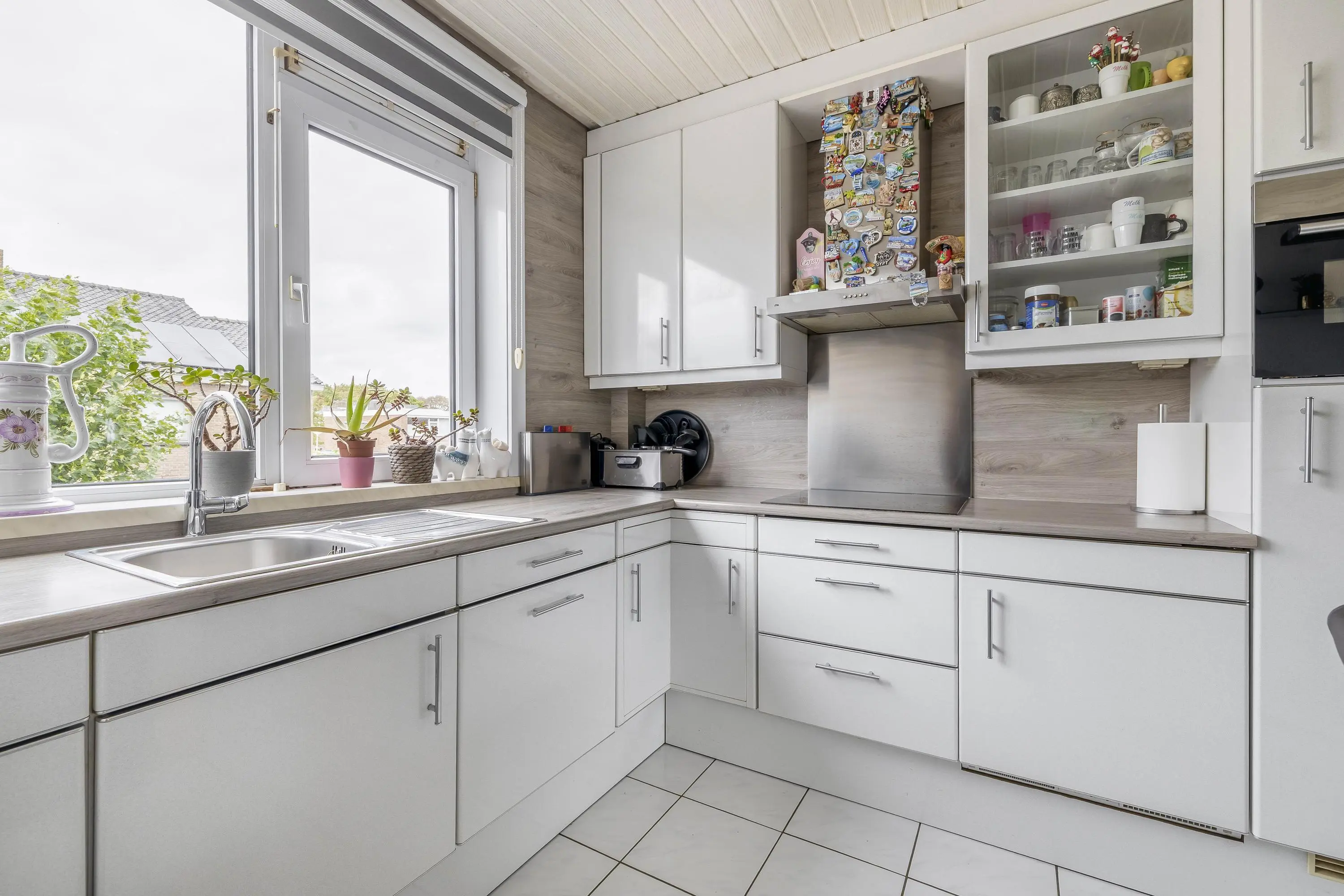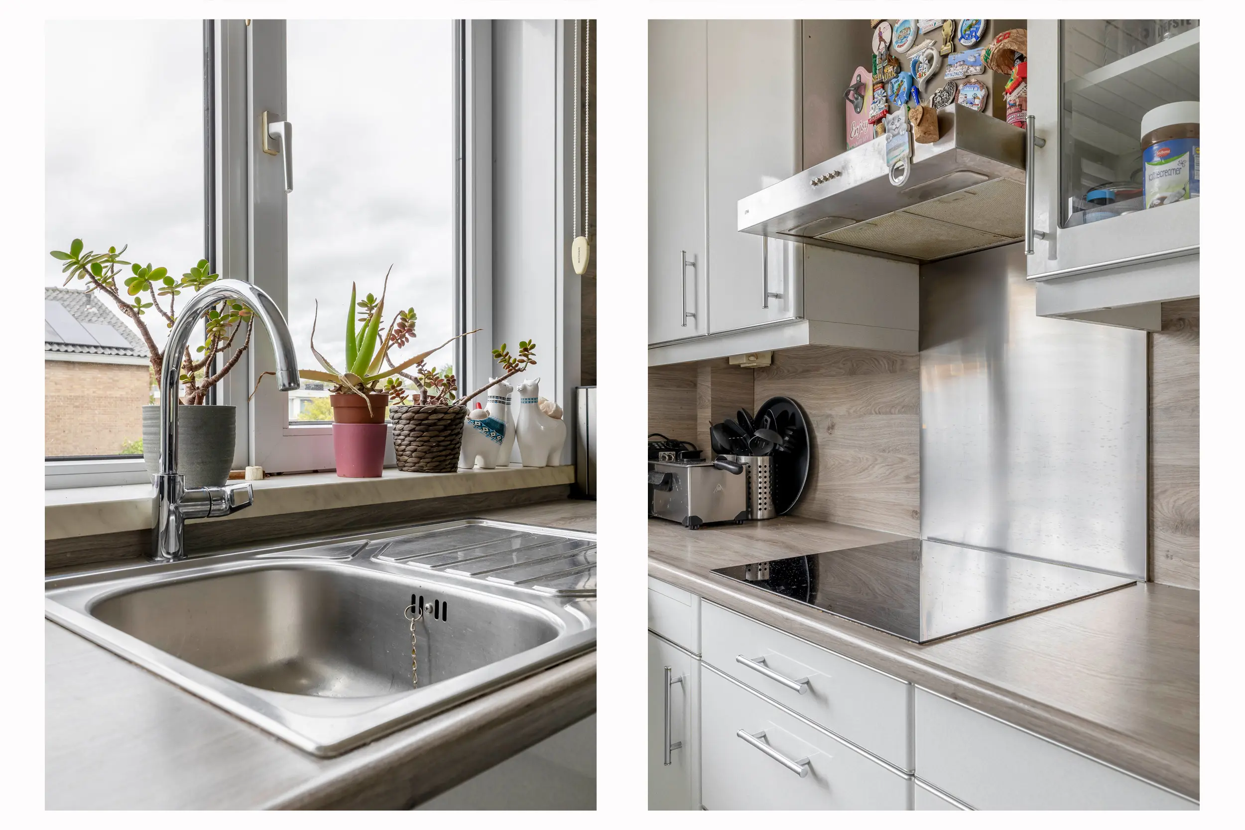 De open keuken ligt aan de voorzijde van de woning. Er komt veel daglicht binnen door het grote raam boven het werkblad. De keuken bestaat onder andere uit een inductie kookplaat, afzuigkap, combimagnetron, koelkast en een vriezer.