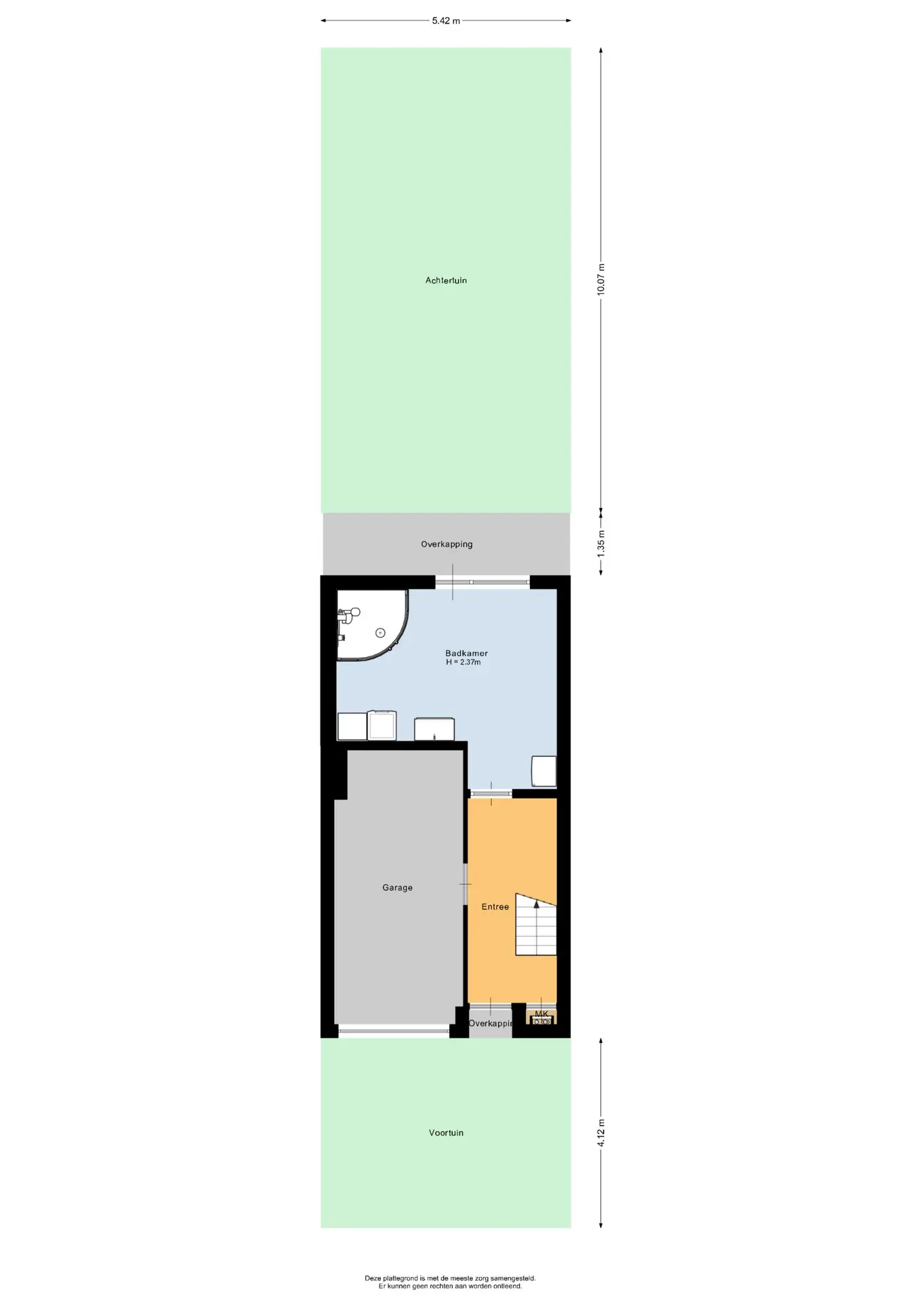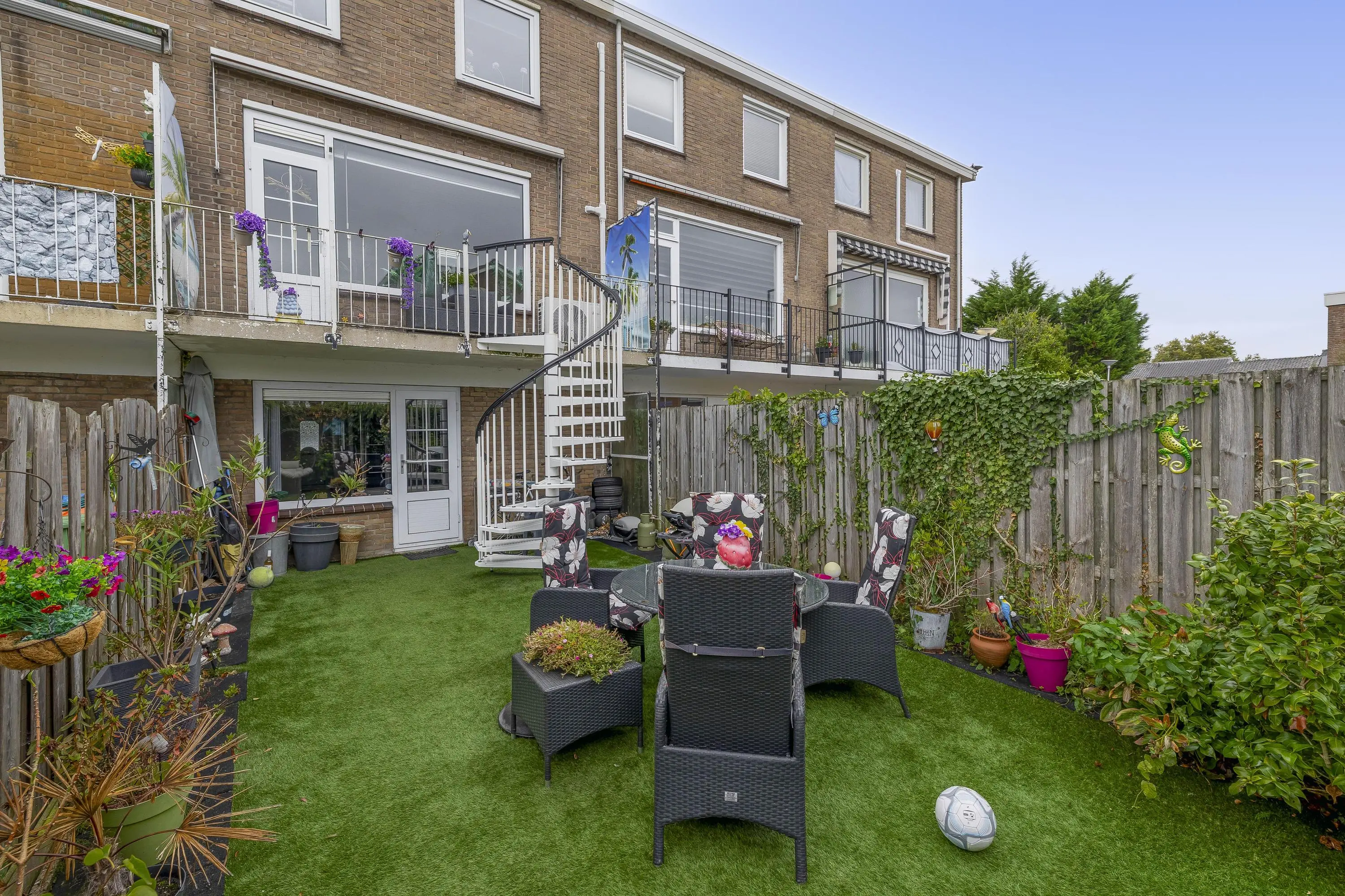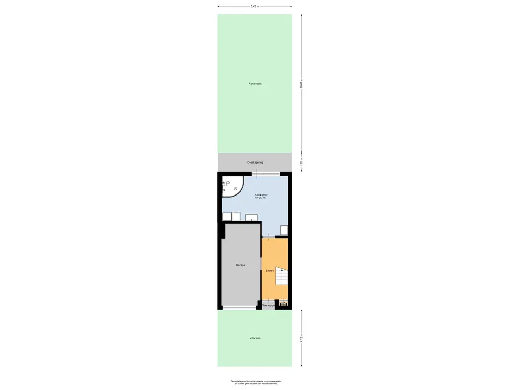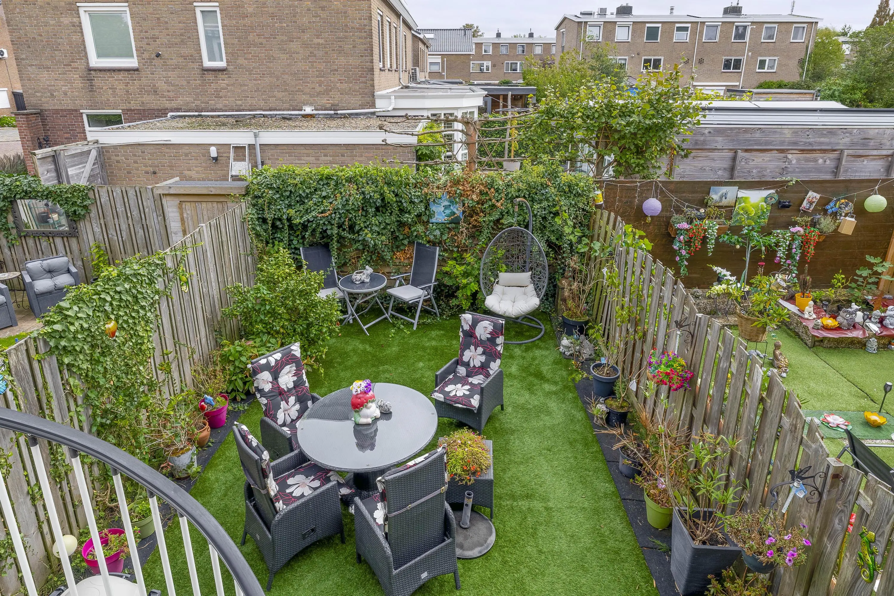 De voortuin biedt de mogelijkheid om te parkeren op de eigen oprit en geeft toegang tot de inpandige garage. De achtertuin ligt op het zonnige zuidoosten. Hierdoor kunt u hier optimaal genieten. Vanwege de vaste trap naar het balkon bent u ook zo weer in de living.