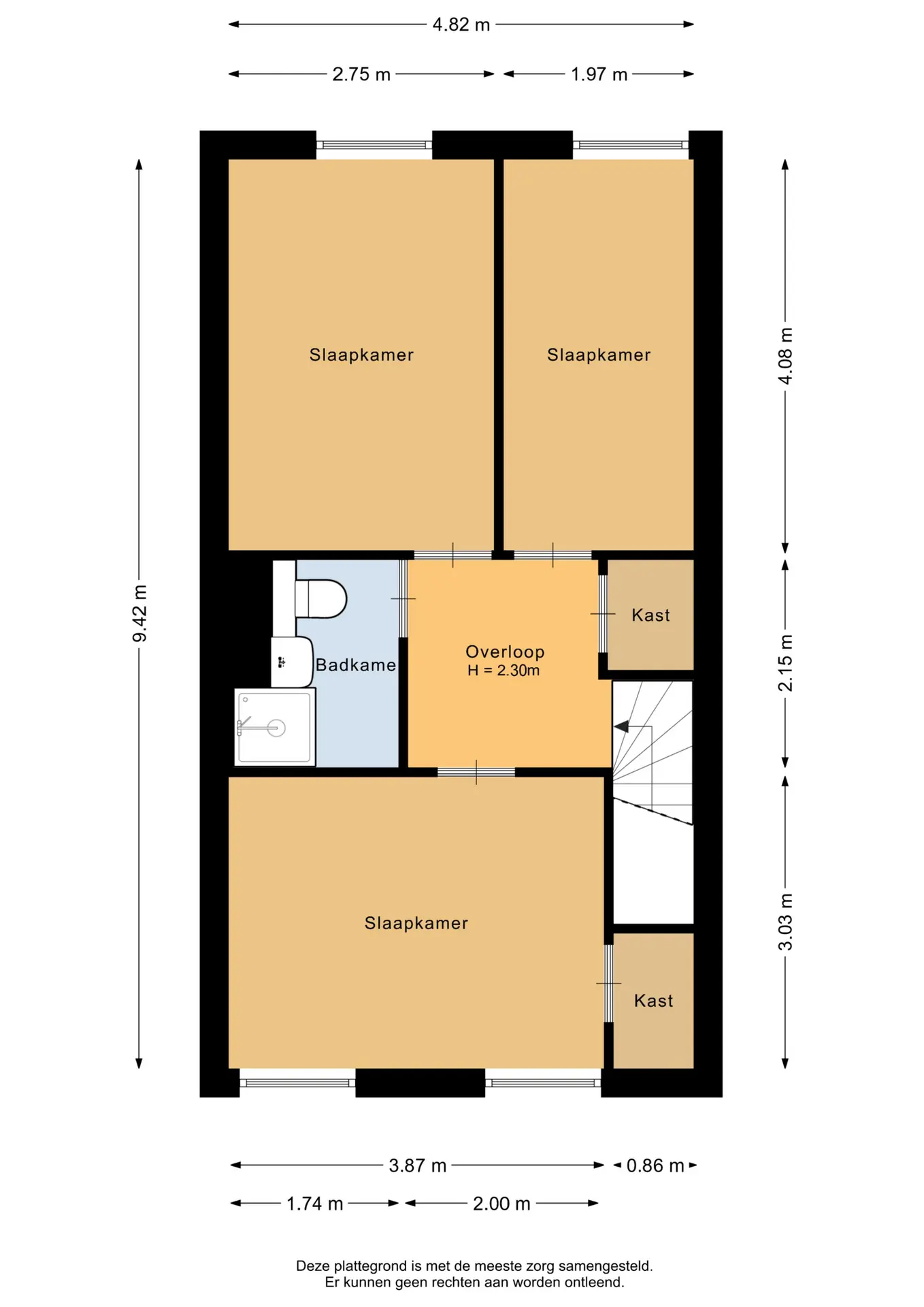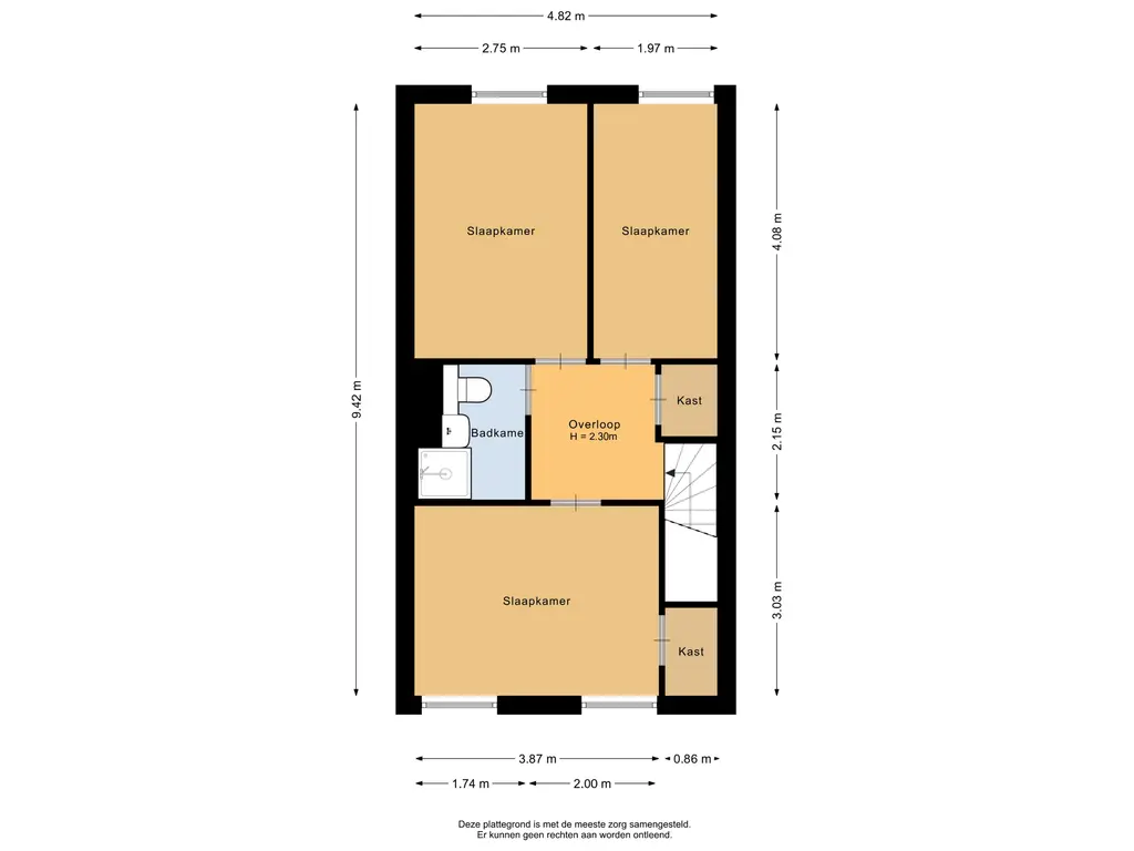 De grootste slaapkamer bevind zich aan de voorzijde van het huis en heeft een oppervlakte van circa 12m² en beschikt over 2 ramen waardoor er veel natuurlijk licht naar binnen komt. De 2 slaapkamers aan de achterzijde van het huis hebben een oppervlakte van respectievelijk 11m² en 8m² en 1 van de kamers is voorzien van airconditioning.