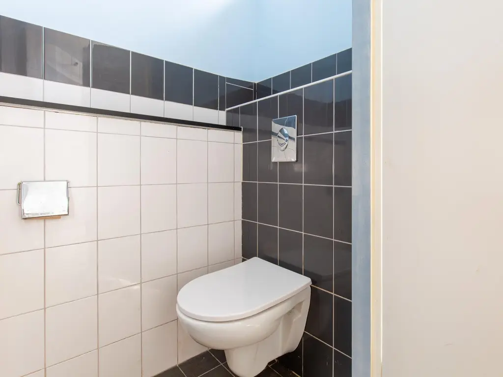 De badkamer verkeert in een matige staat en bestaat uit een douche, toilet en wastafelmeubel.