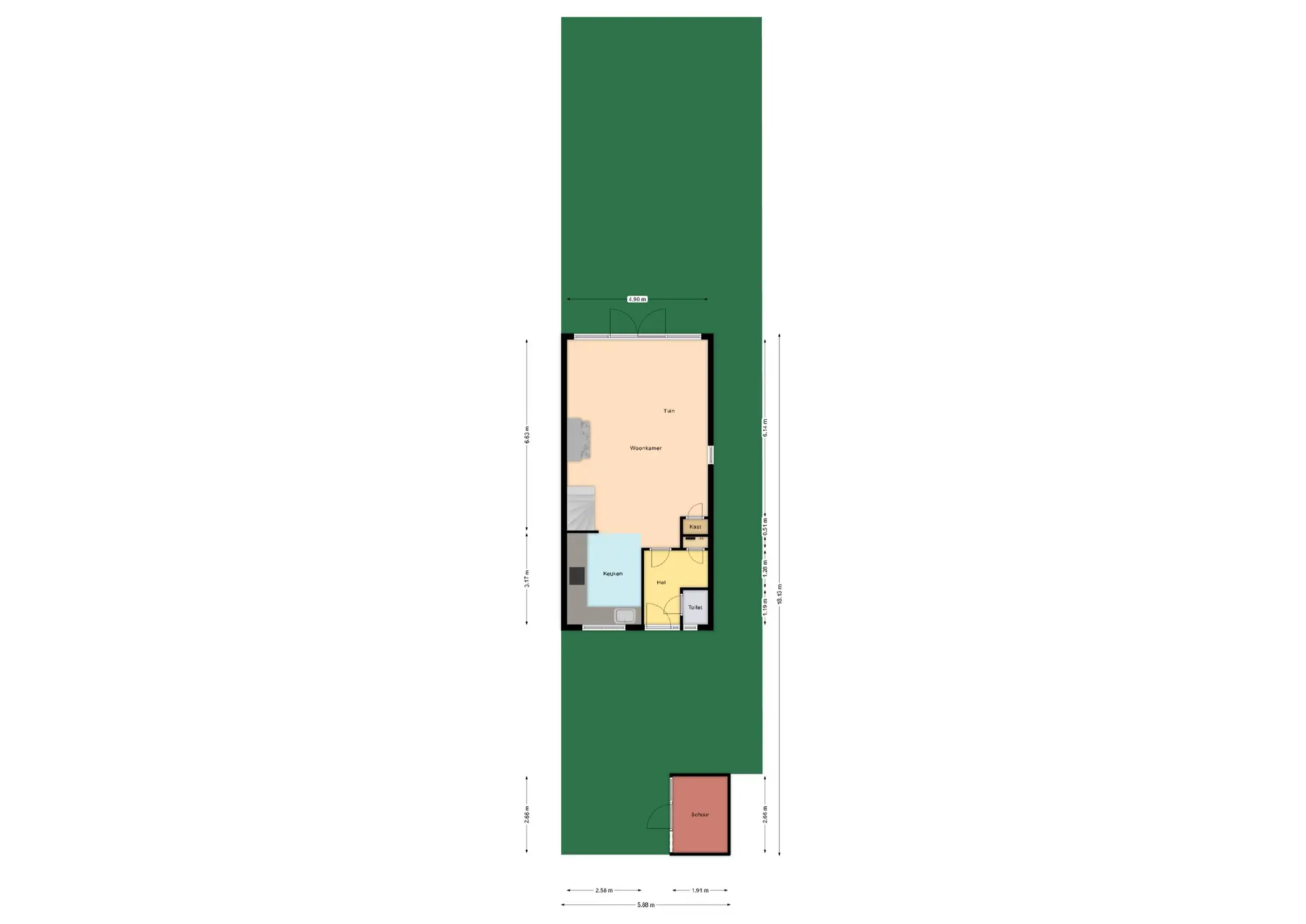 Entree/hal met de meterkast en het toilet. Vervolgens is er toegang tot de ruime, tuingerichte woonkamer van circa 32m². Hier is een open haard aanwezig en er is een vaste kast. Middels de openslaande deuren is er toegang tot de diepe achtertuin.
