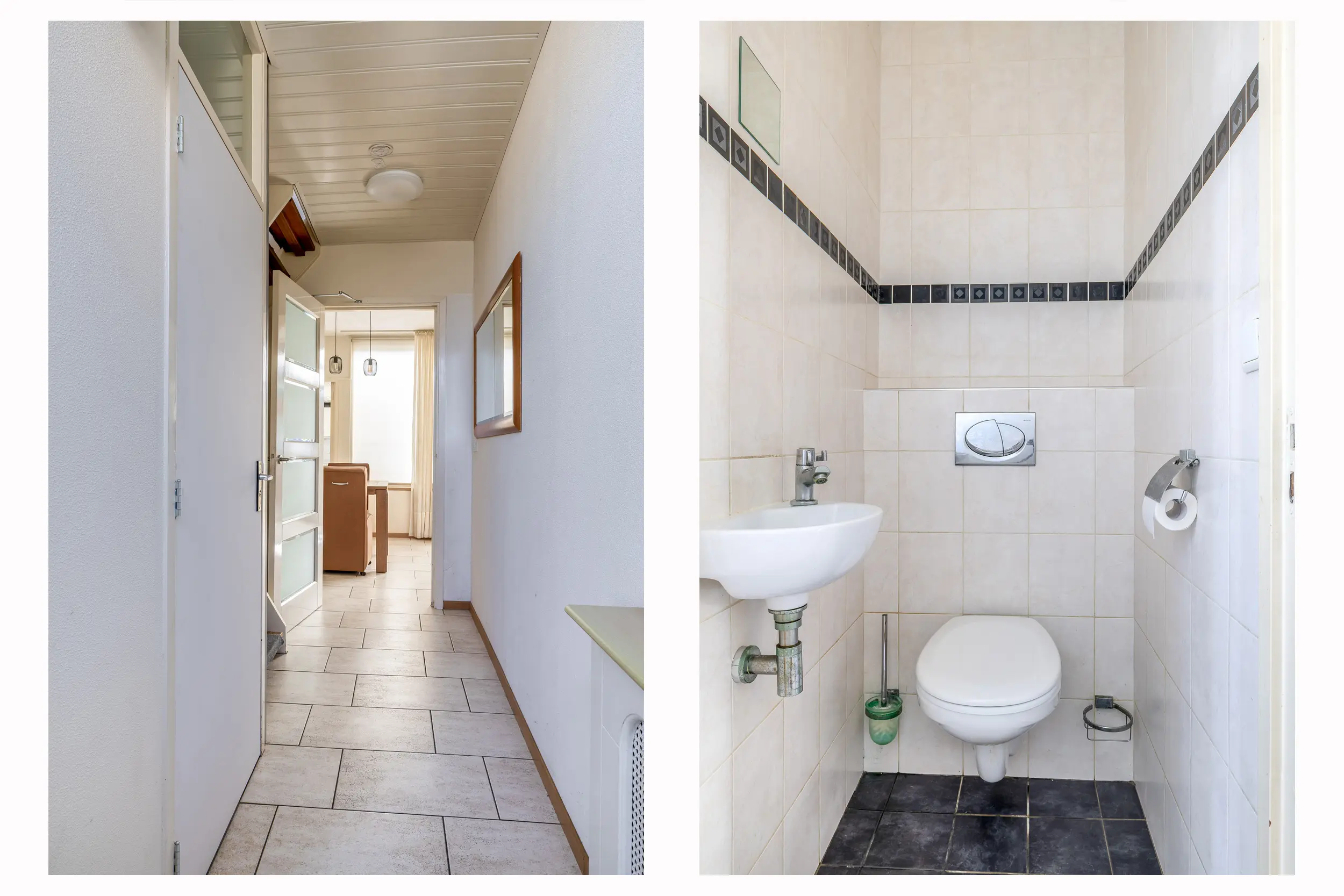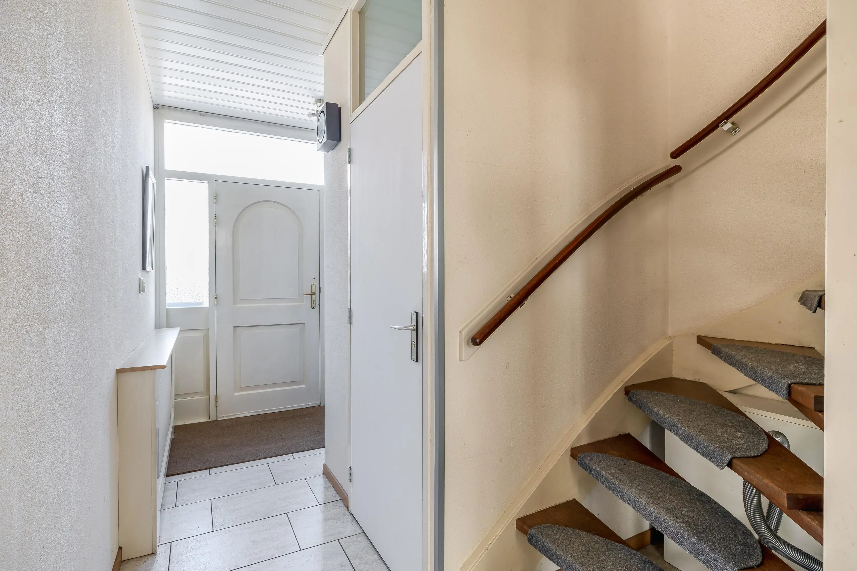 De entree komt uit in een lichte hal met meterkast, trapopgang naar de eerste verdieping en een toilet met fonteintje. De hal is voorzien van een plavuizenvloer met vloerverwarming, welke doorloopt over de gehele begane grond.