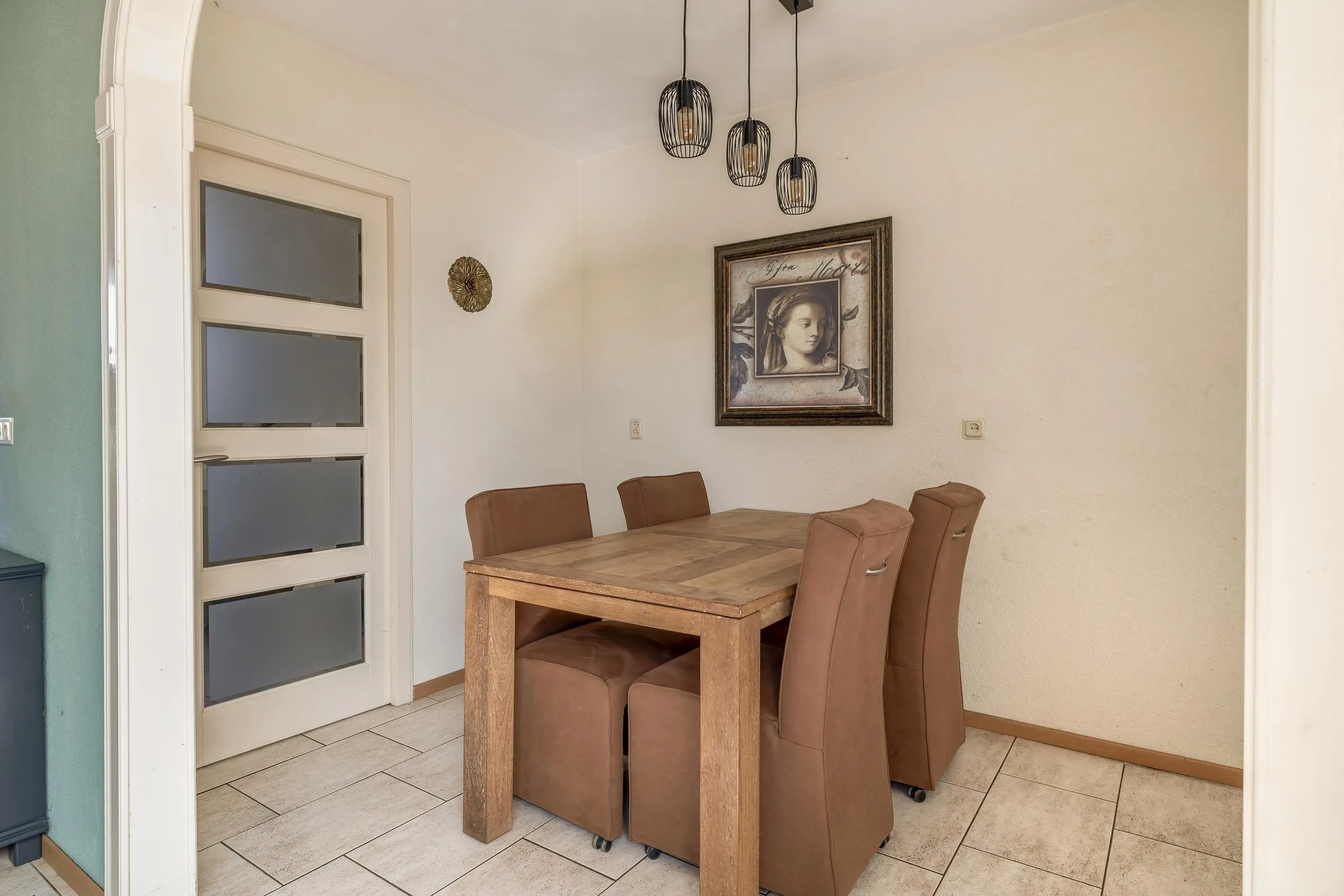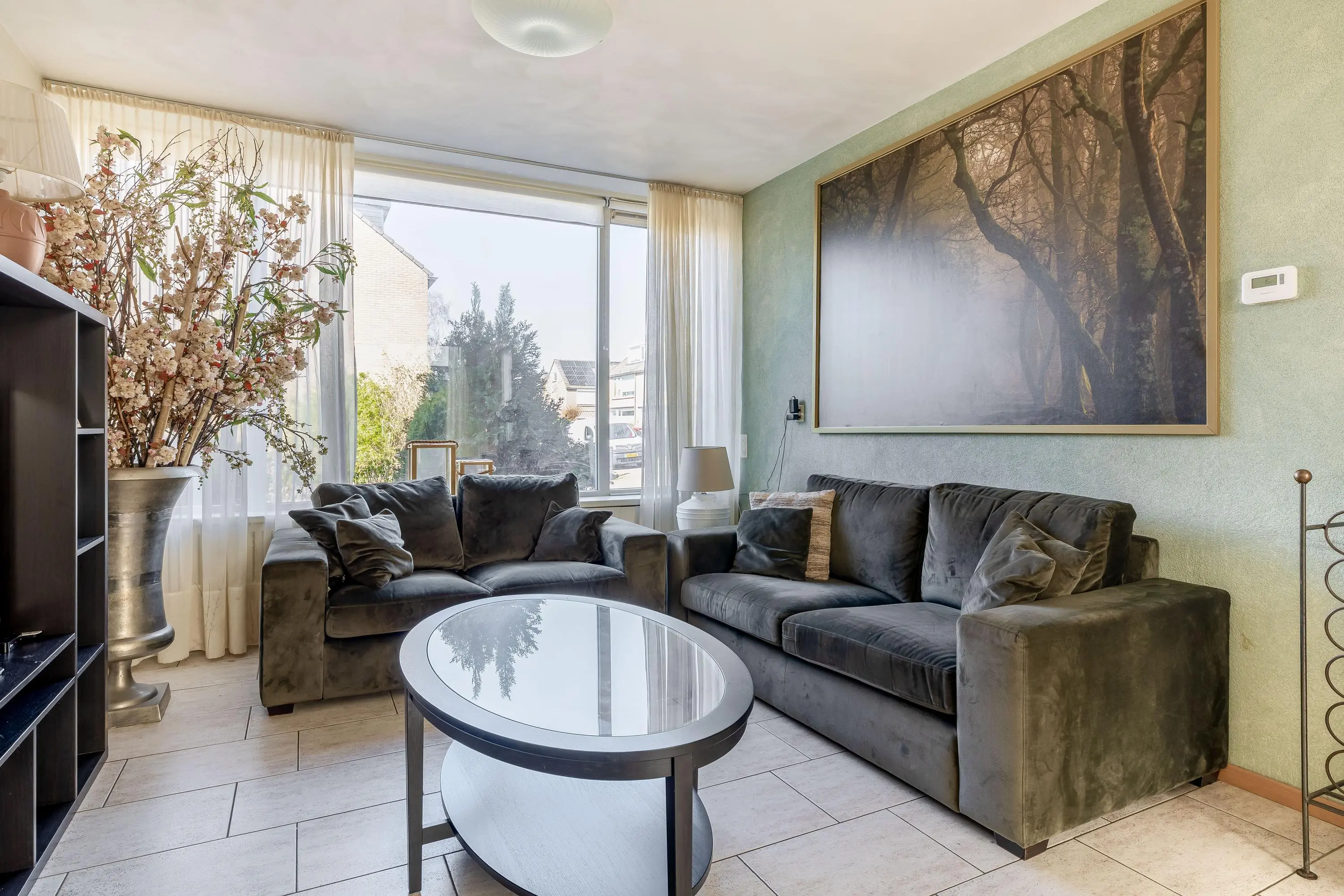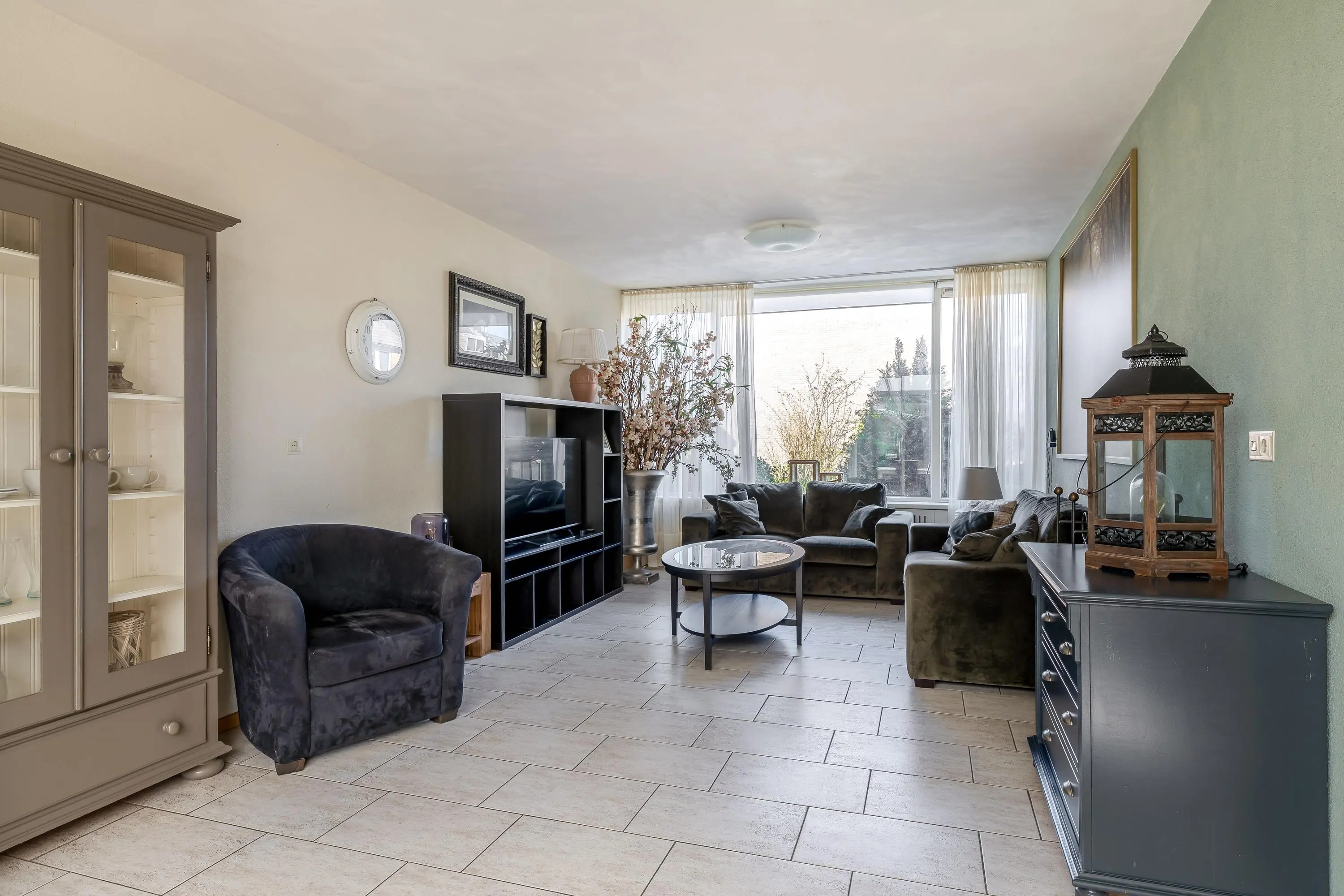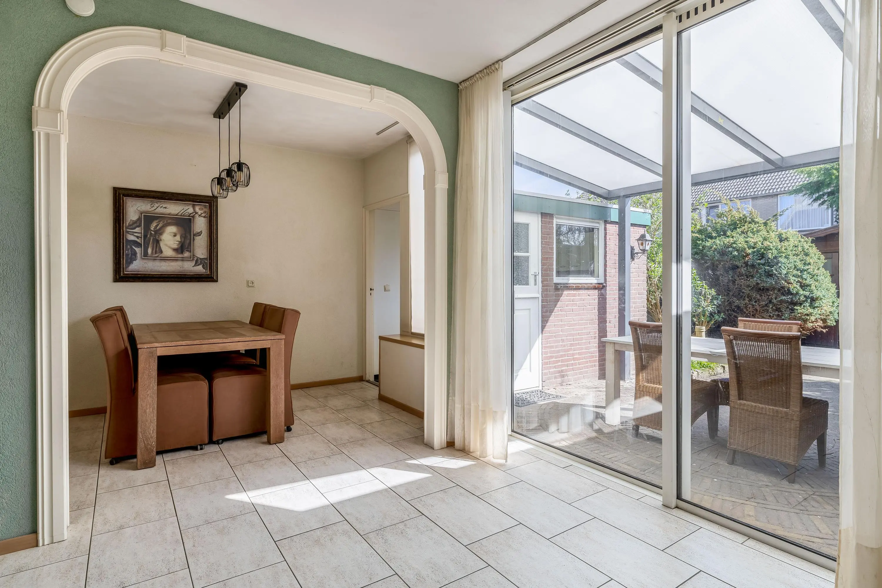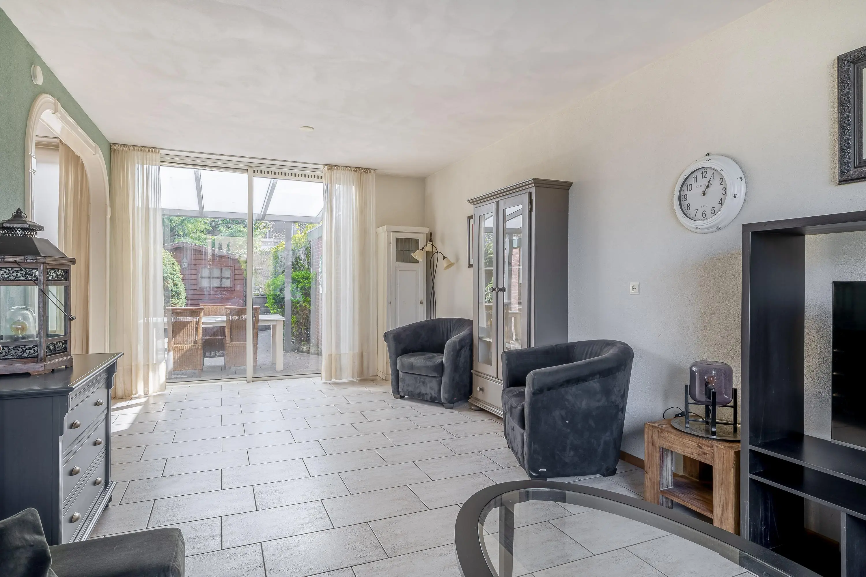 De woonkamer is ruim opgezet en meer dan 8 meter diep. Dankzij de grote ramen aan de voor- en achterzijde is er veel daglicht, al biedt het zonnescherm aan de voorzijde de mogelijkheid om het licht naar wens te reguleren. De ruimte biedt volop mogelijkheden voor een comfortabele zithoek en staat via een toog in open verbinding met de eetkamer.