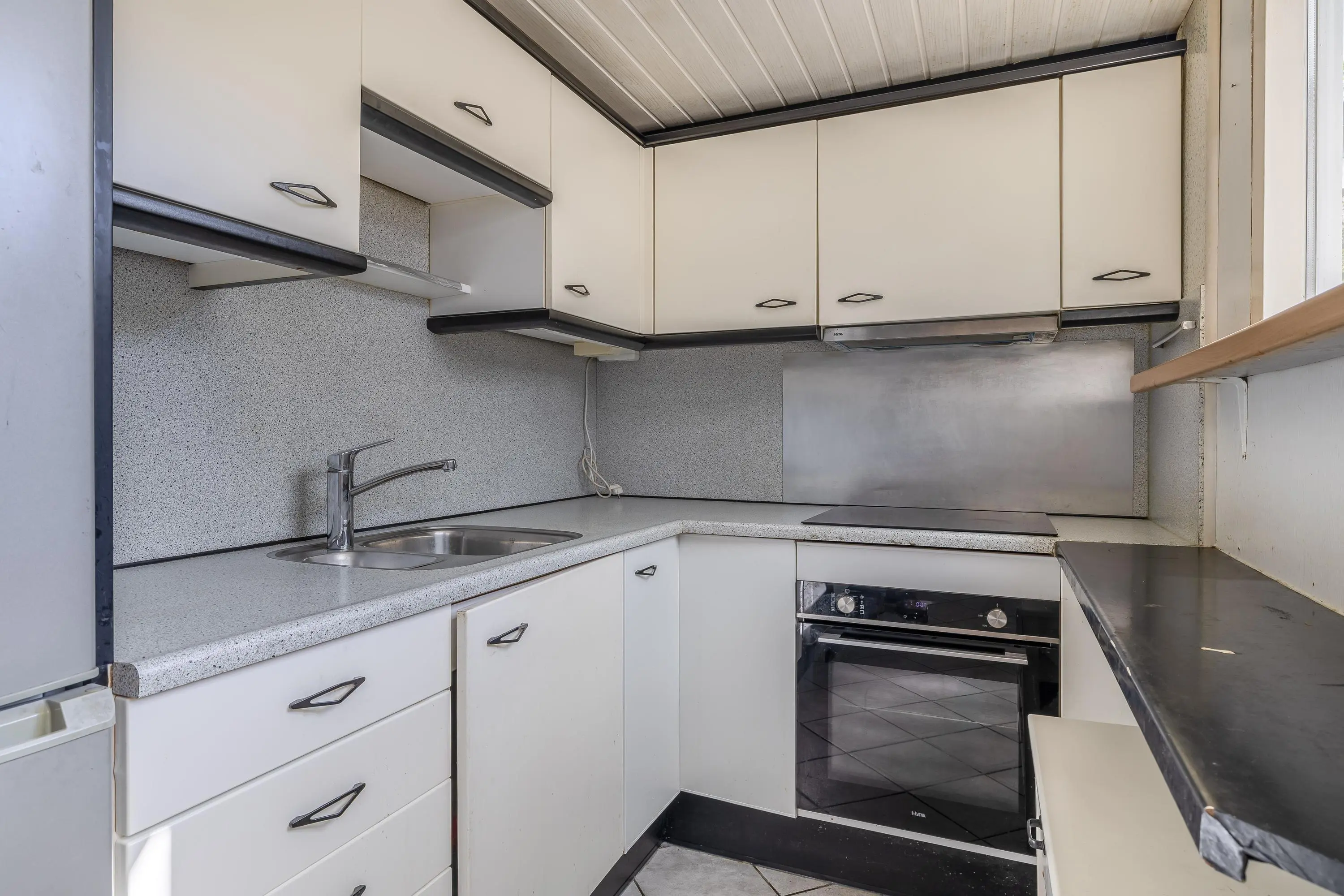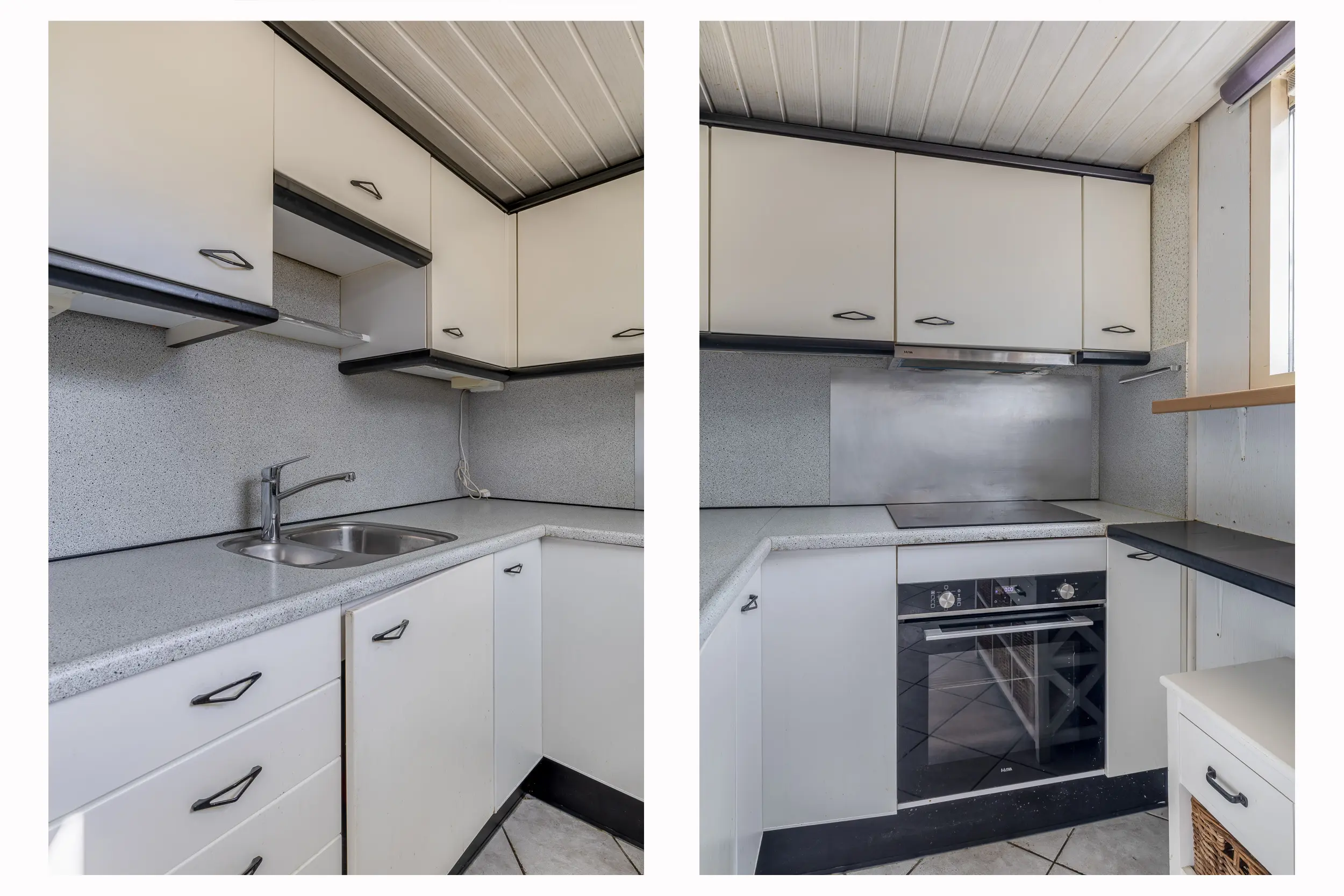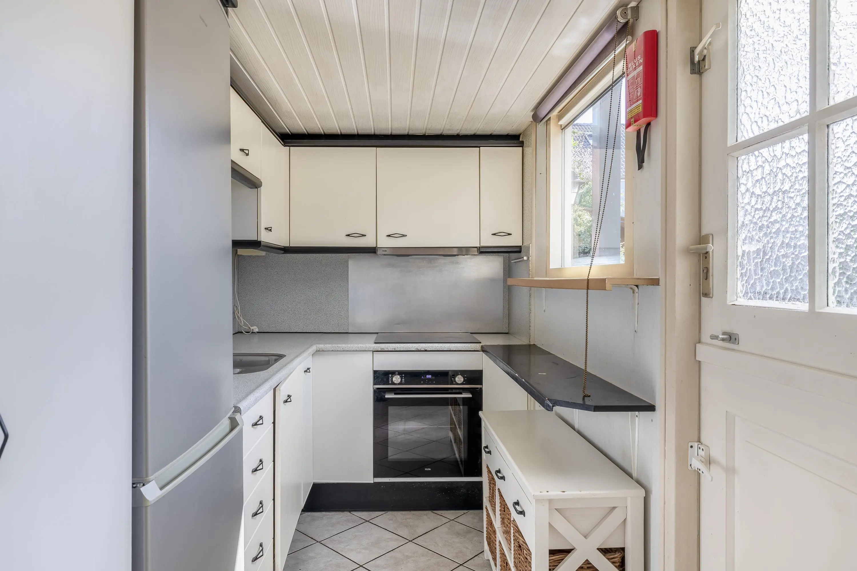 De keuken grenst aan de eetkamer en is praktisch ingericht, met onder andere een kookplaat met afzuigkap, oven en koel-vriescombinatie. De keuken is afgewerkt met een andere plavuizenvloer. Via de deur is er direct toegang tot de tuin en het terras onder de overkapping.