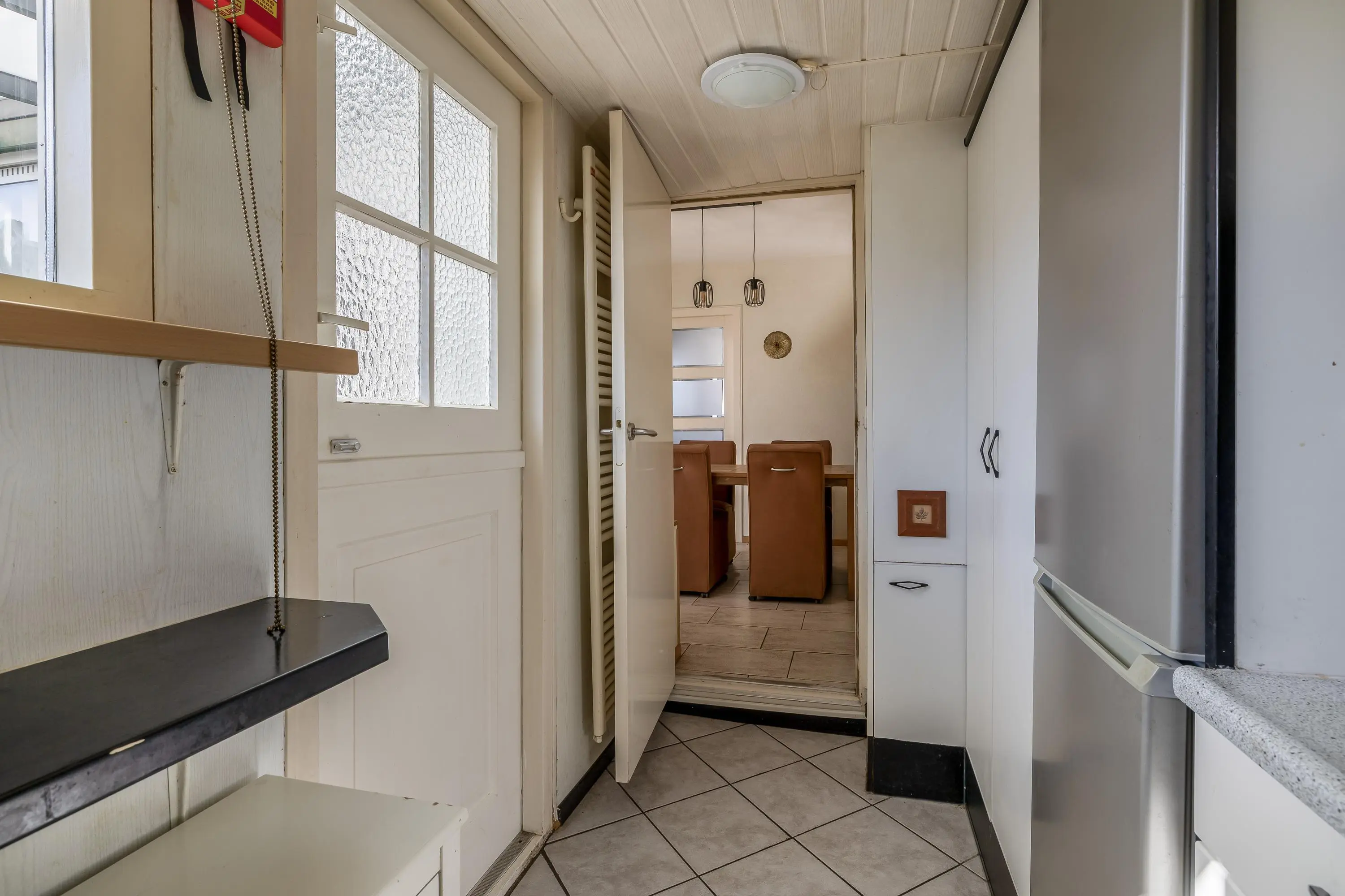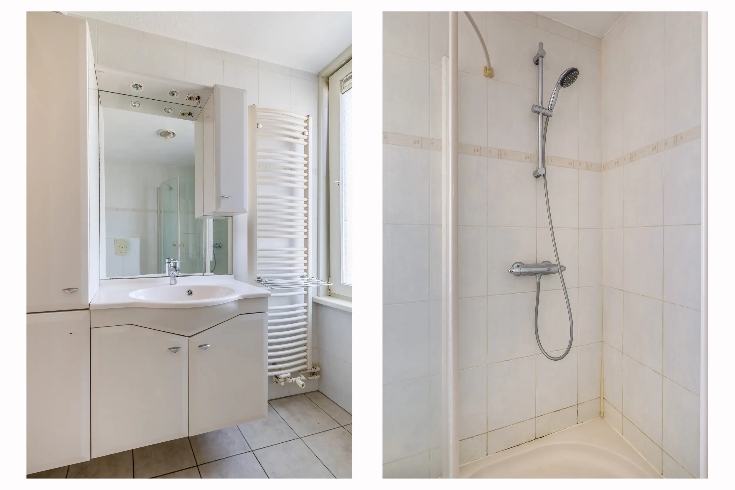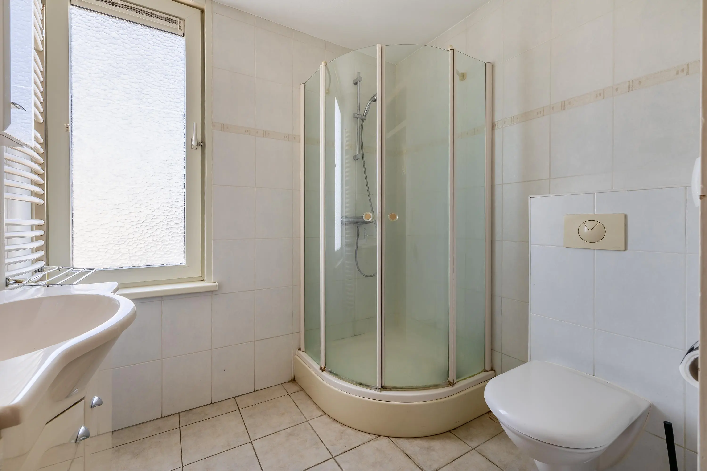 De badkamer is volledig betegeld en is praktisch ingedeeld met een douche, wastafel en een toilet. Het aanwezige raam zorgt voor daglicht en natuurlijke ventilatie.
