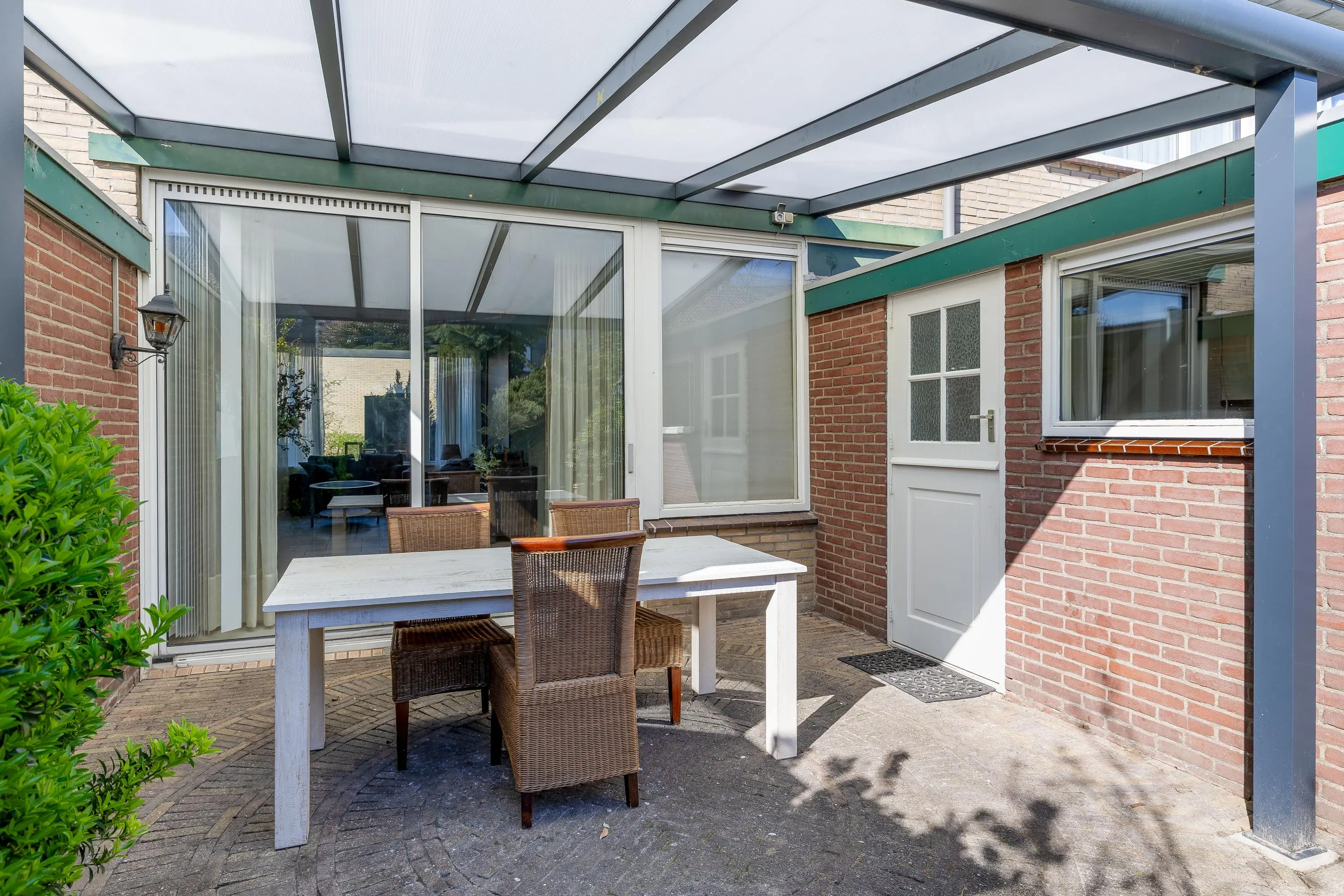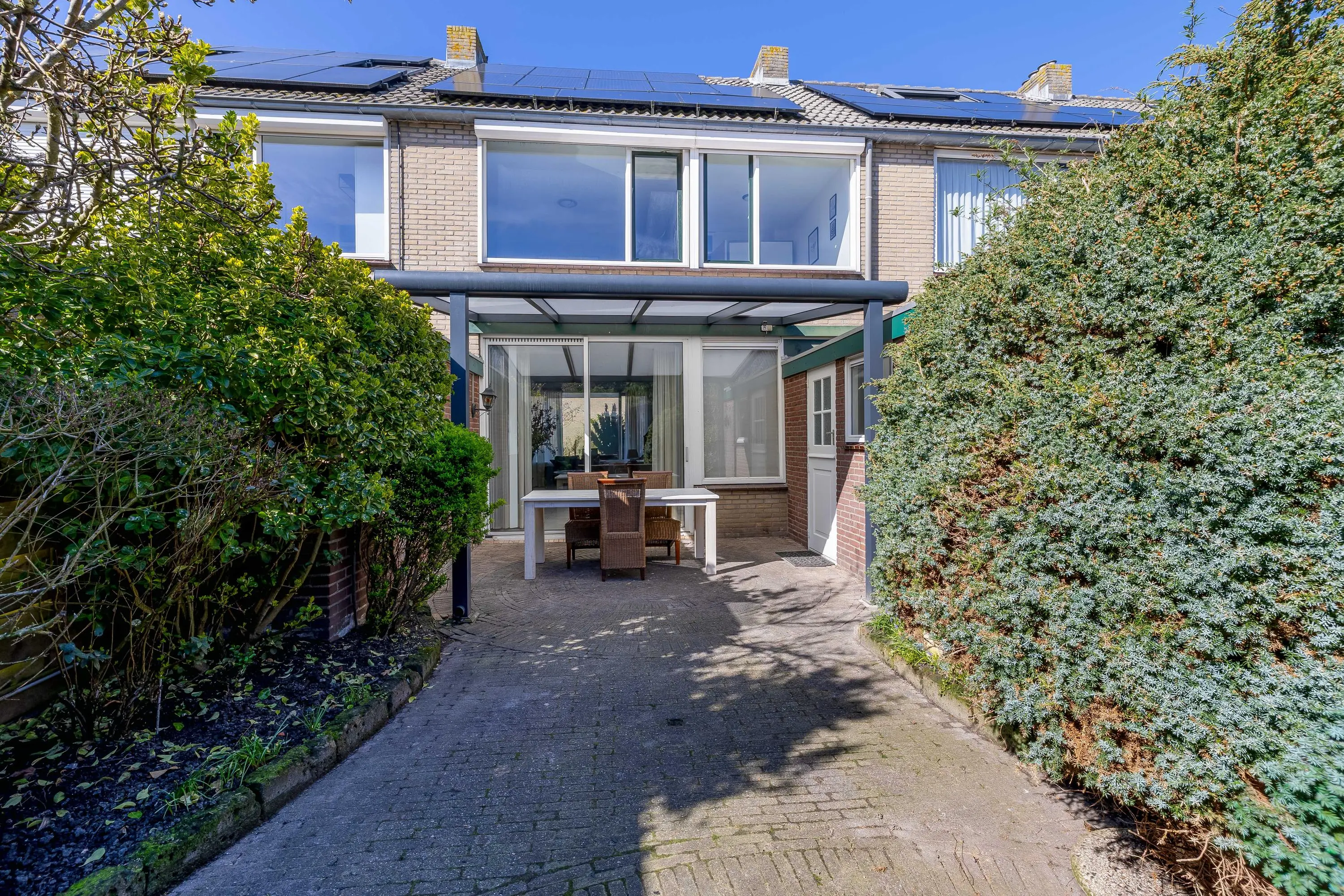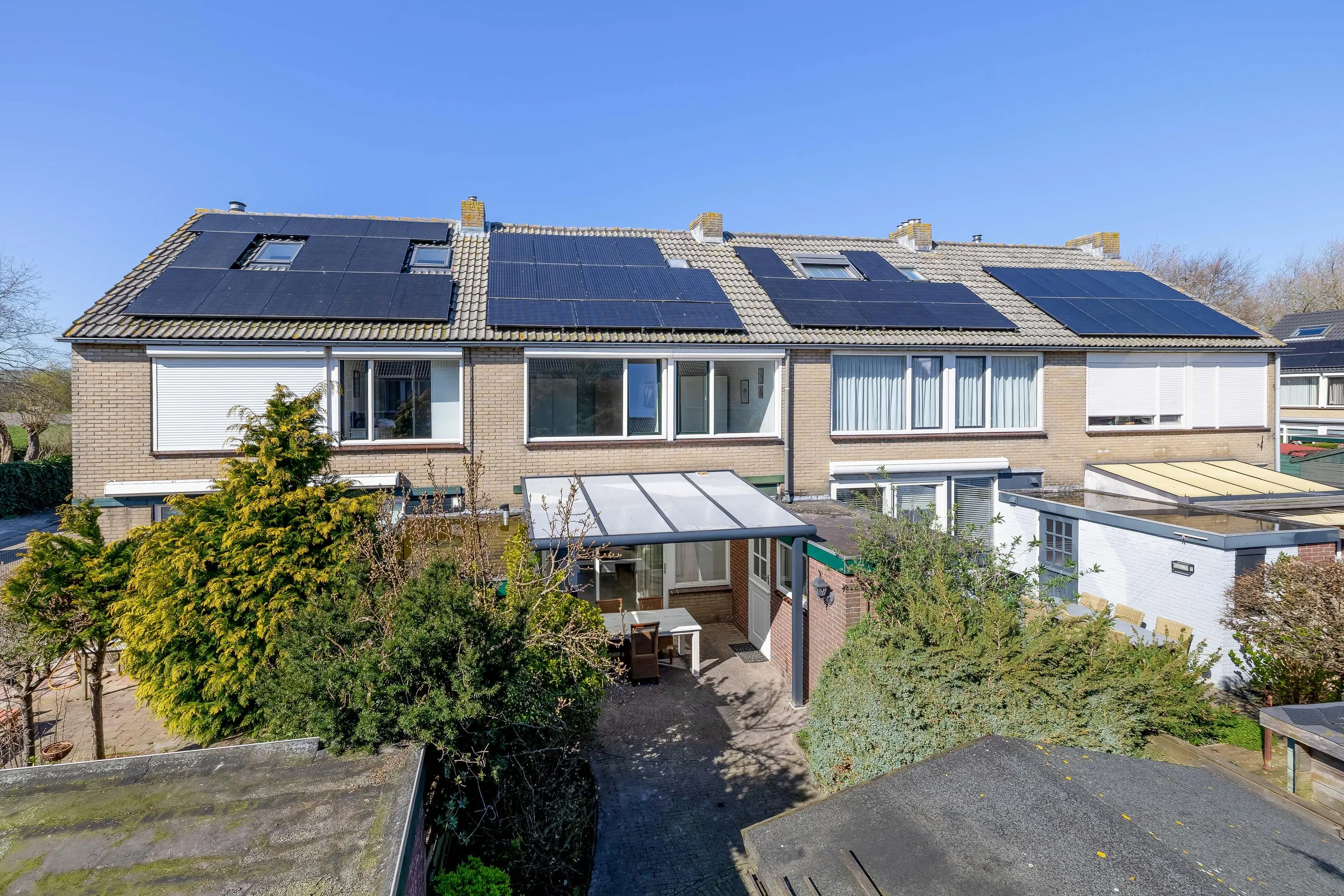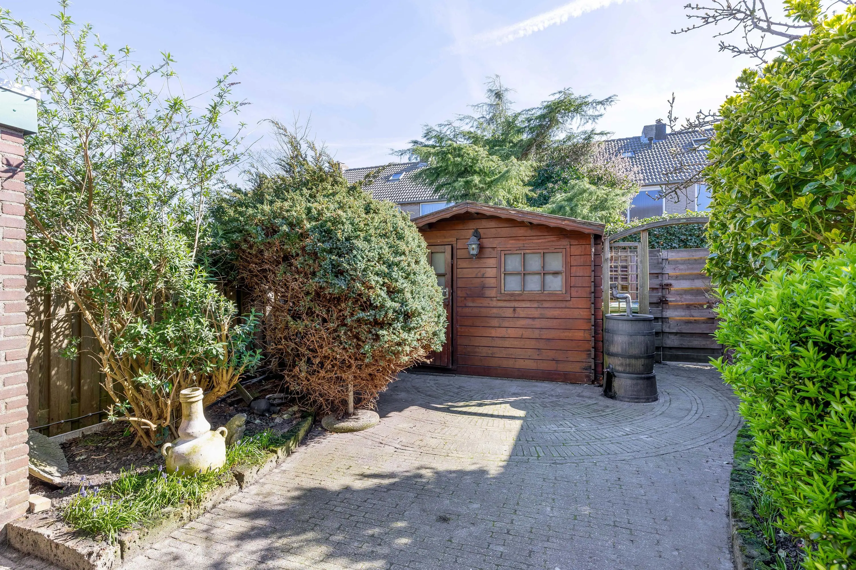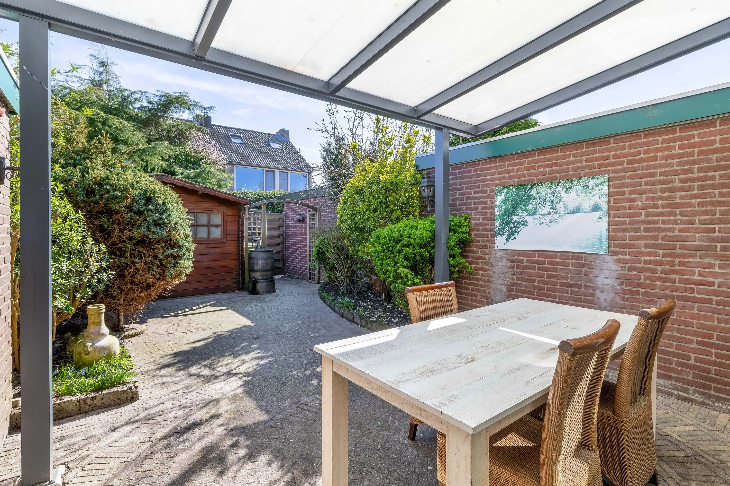 De achtertuin is eveneens bestraat en voorzien van borders met groen, waardoor een mooie balans ontstaat tussen onderhoudsvriendelijkheid en sfeer. Direct aan de achtergevel is een stijlvolle aluminium overkapping geplaatst, zodat u al vroeg in het jaar van het buitenleven kunt genieten. Achterin de tuin staat een praktische houten berging van circa 4,5m², voorzien van elektra. De tuin is bovendien eenvoudig bereikbaar via een achterom.
