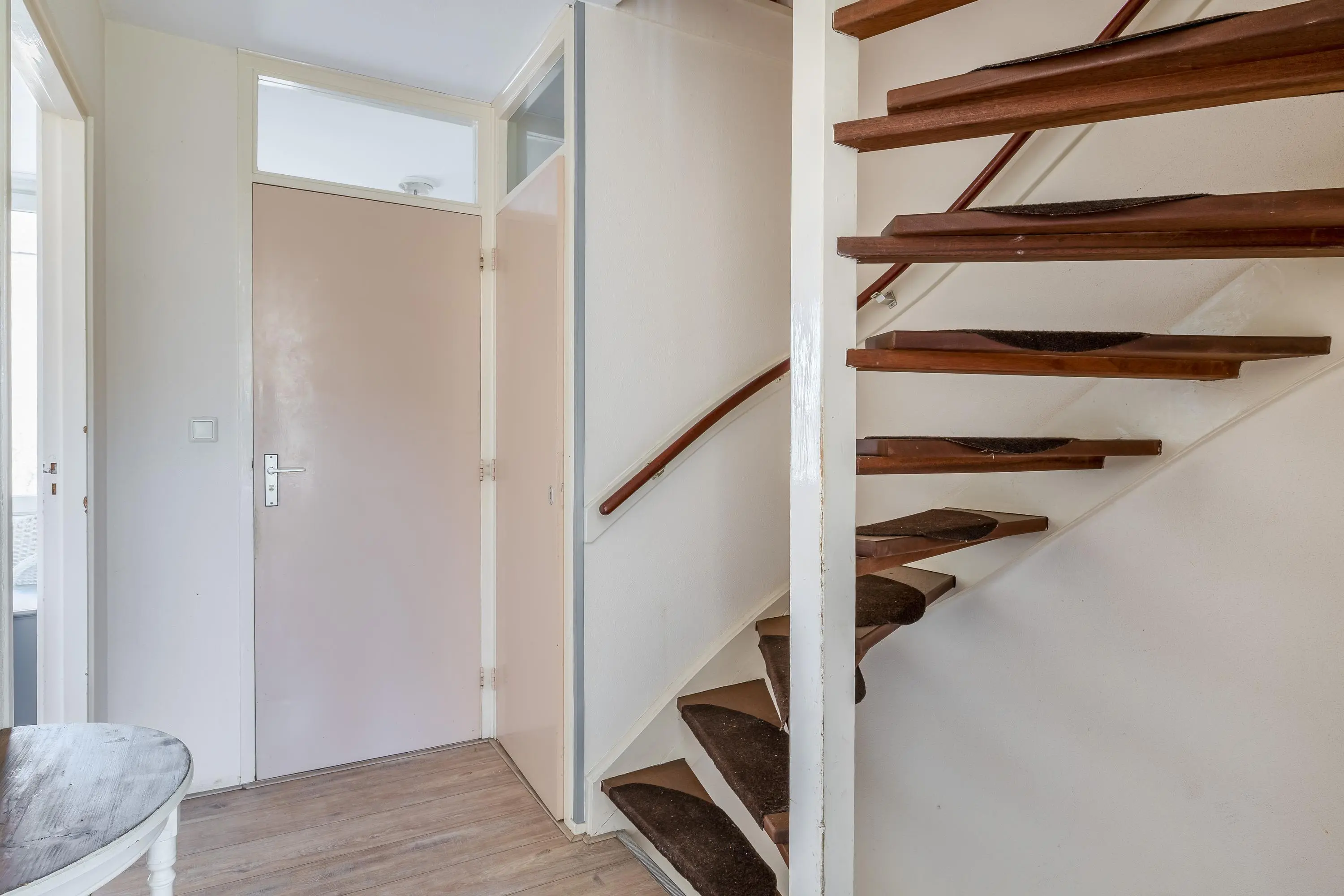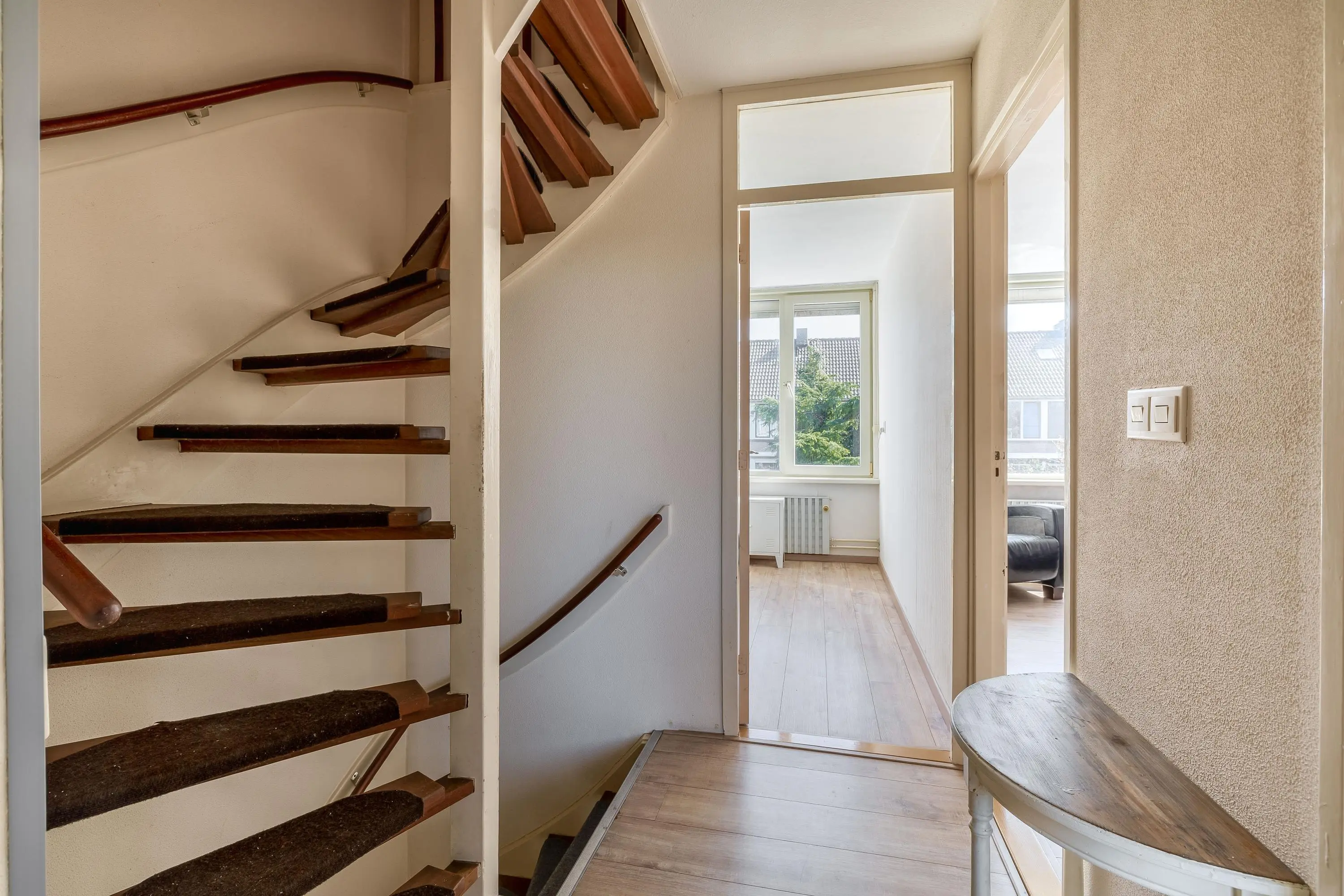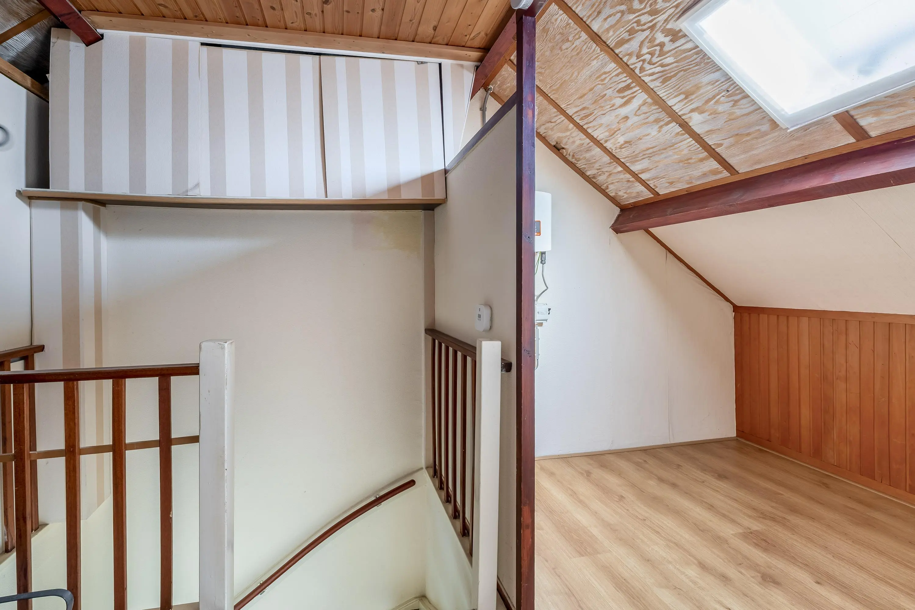 Via een vaste trap is de tweede verdieping bereikbaar. De overloop biedt praktische bergruimte en is voorzien van de cv-opstelling en een laminaatvloer.
