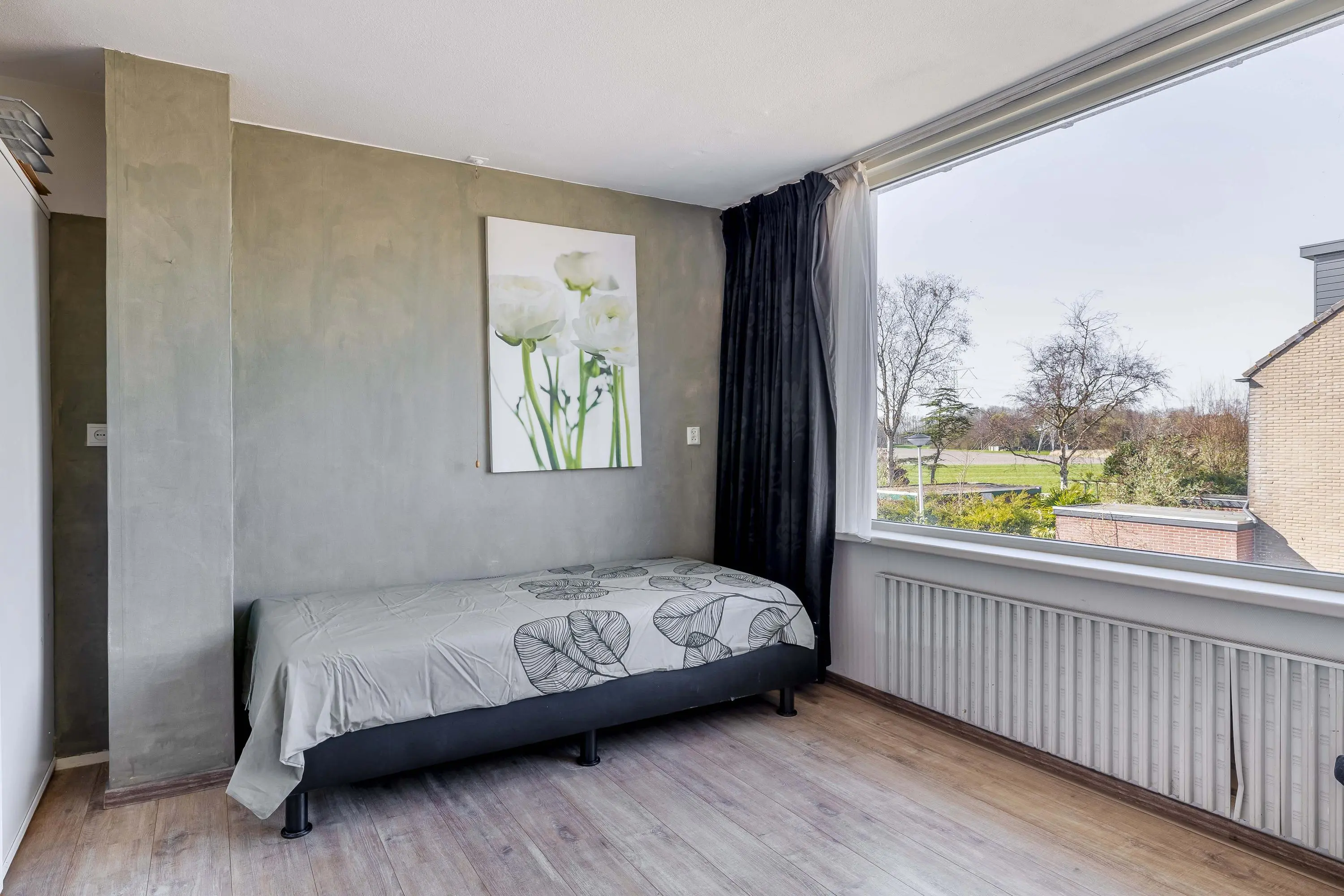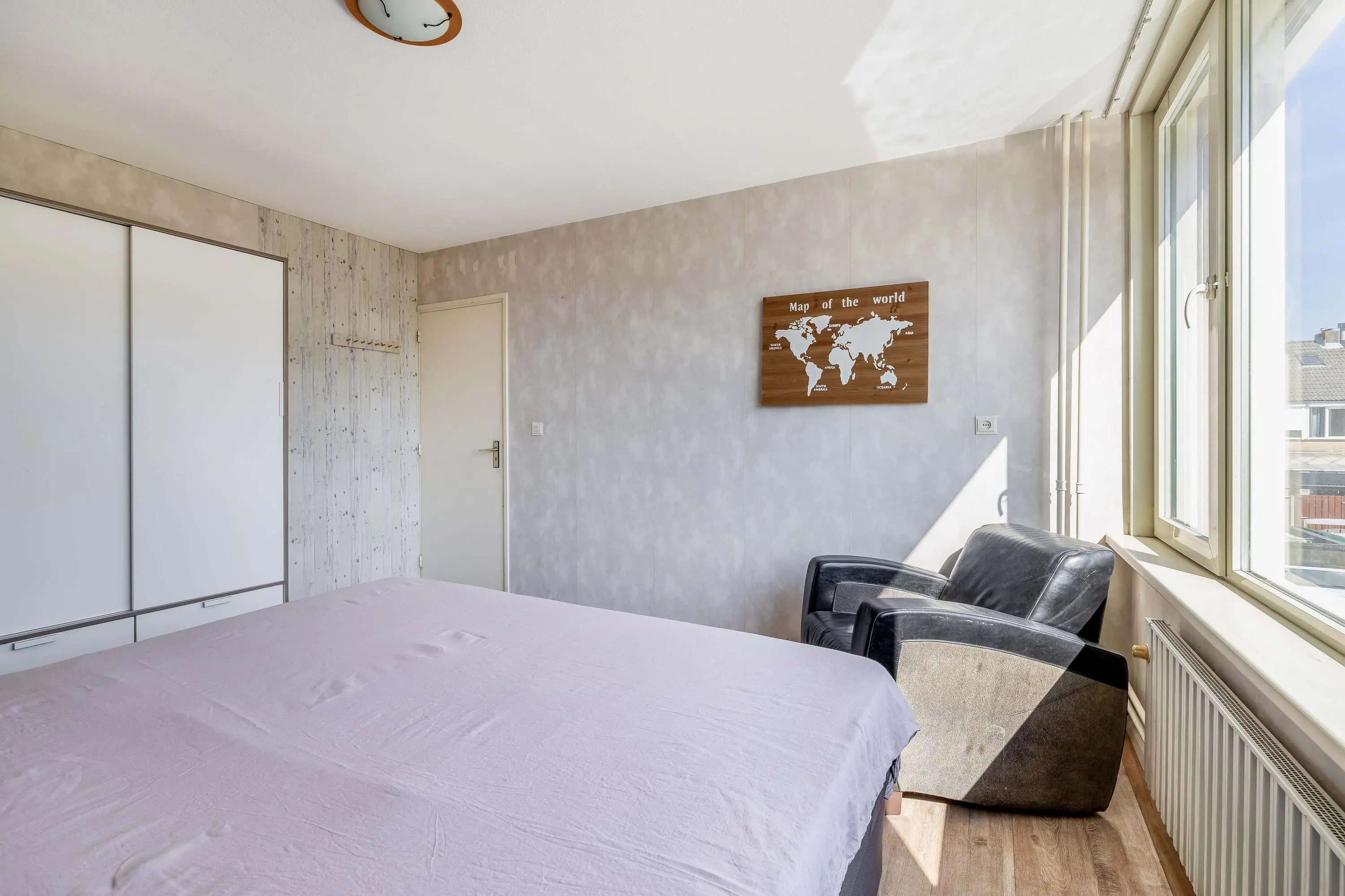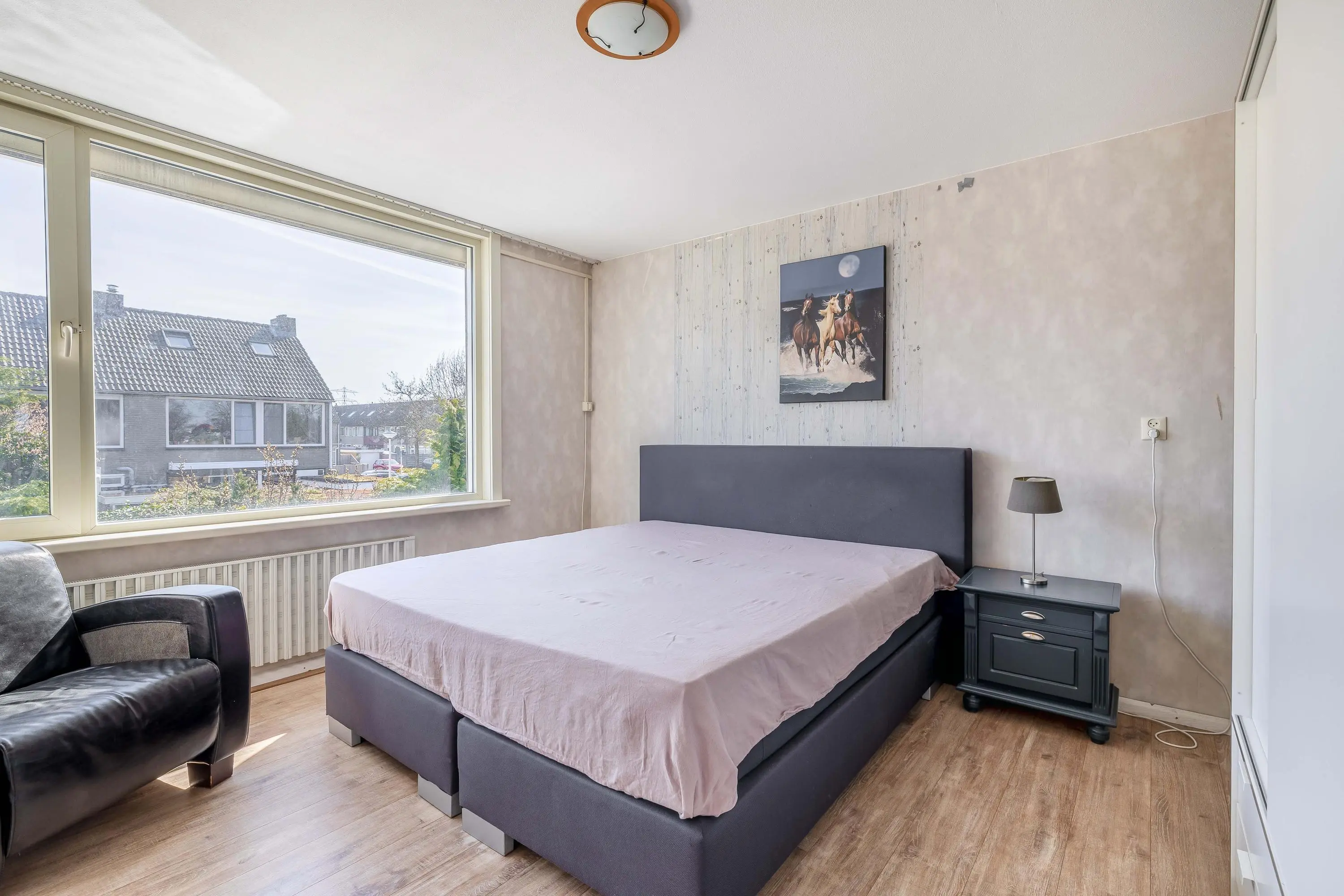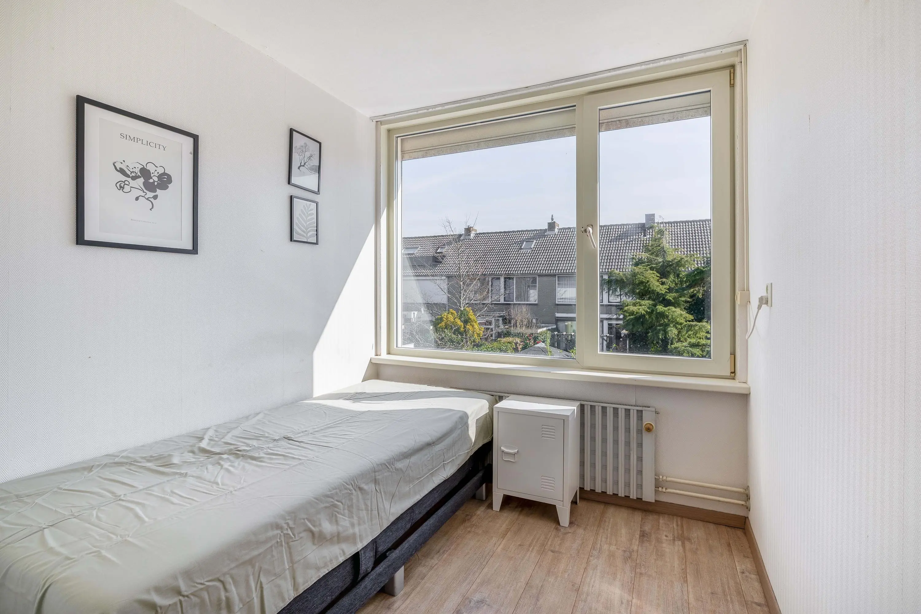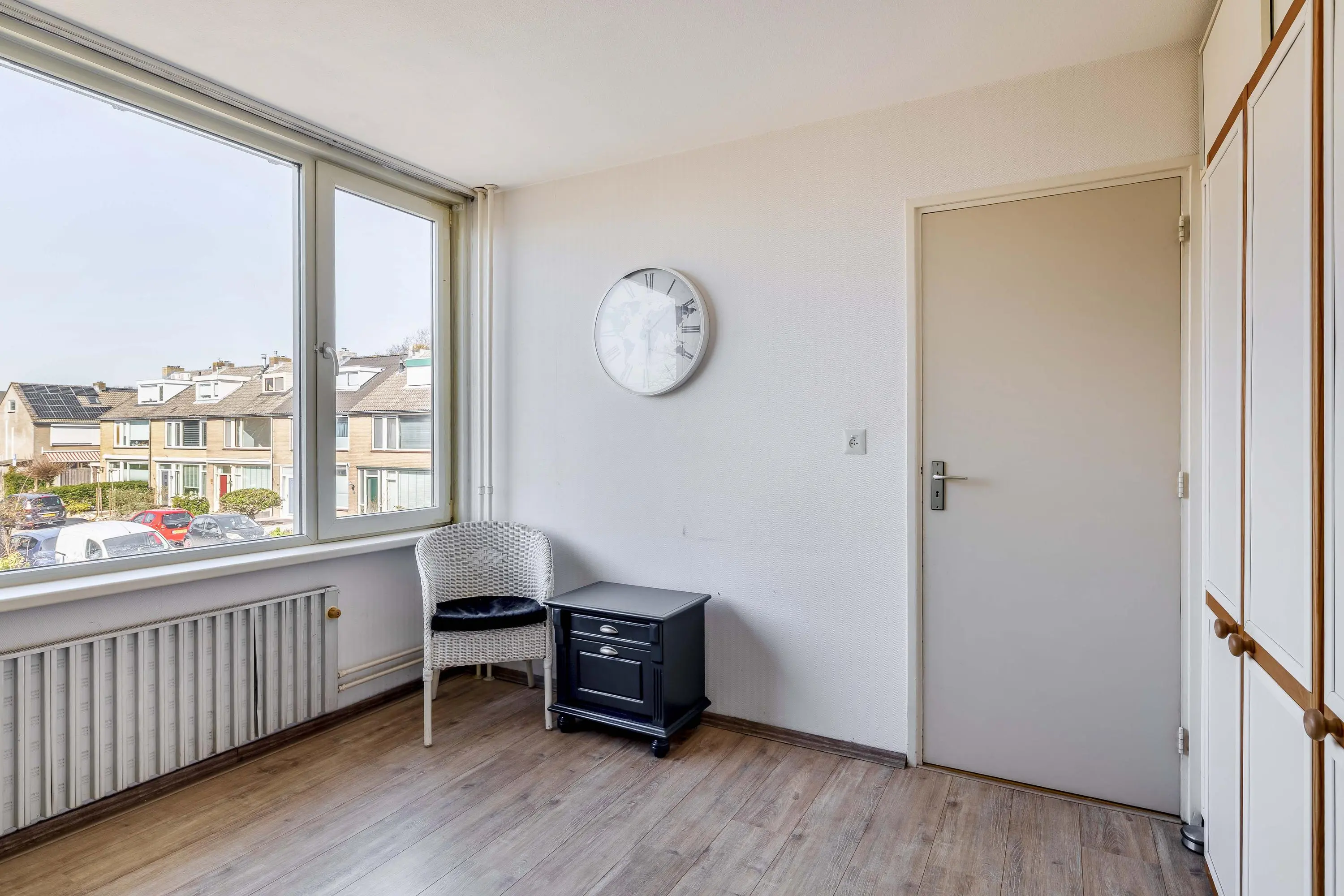 Aan de achterzijde ligt een ruime hoofdslaapkamer van circa 14,5m² met voldoende plek voor een tweepersoonsbed en kasten. Aan de voorzijde bevindt zich een tweede slaapkamer van ongeveer 13,5m², voorzien van inbouwkasten. De derde kamer aan de achterzijde is compacter, circa 7m², en geschikt als kinder- of werkkamer of als walk-in closet. De slaapkamers aan de achterzijde zijn voorzien van rolluiken.