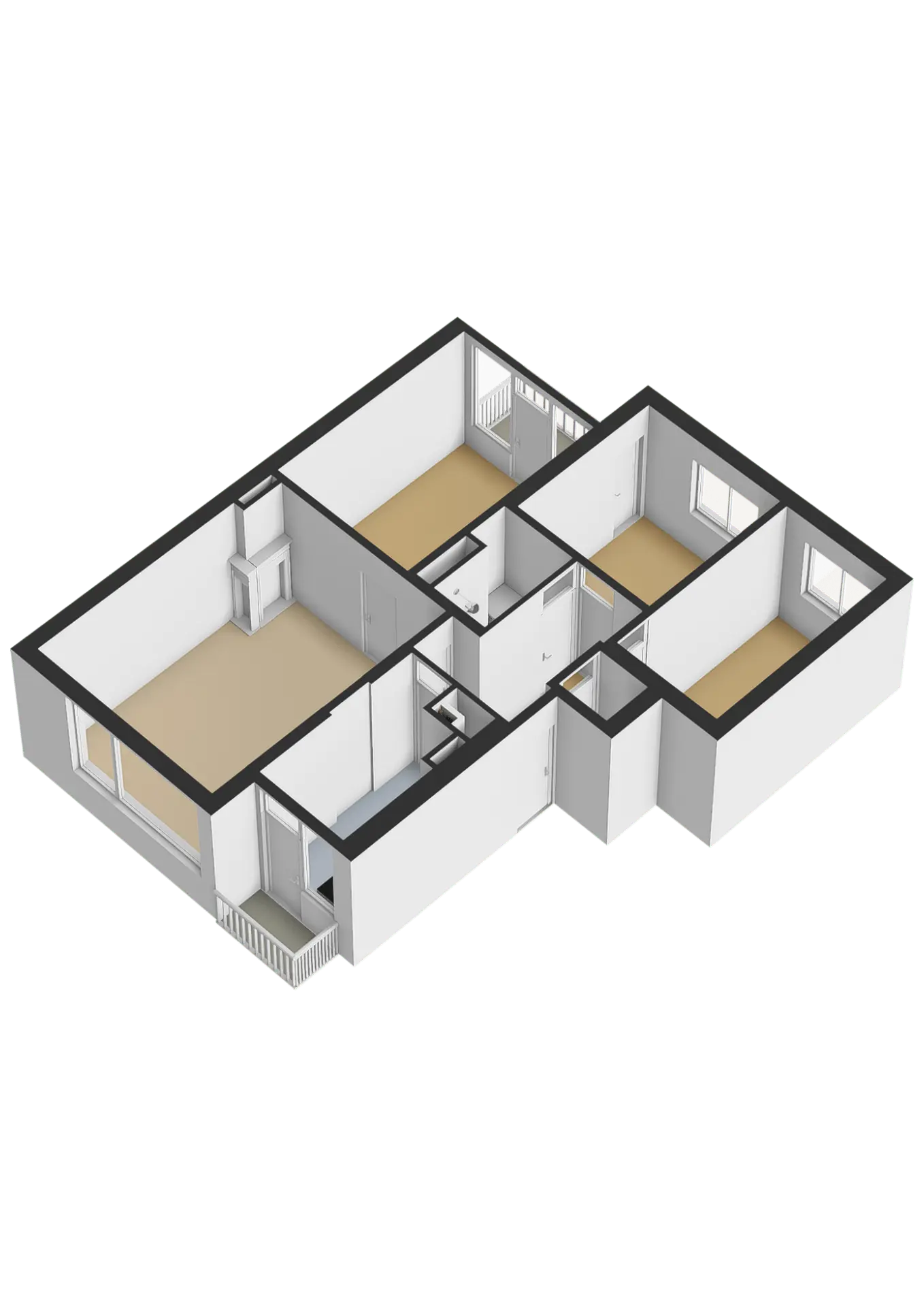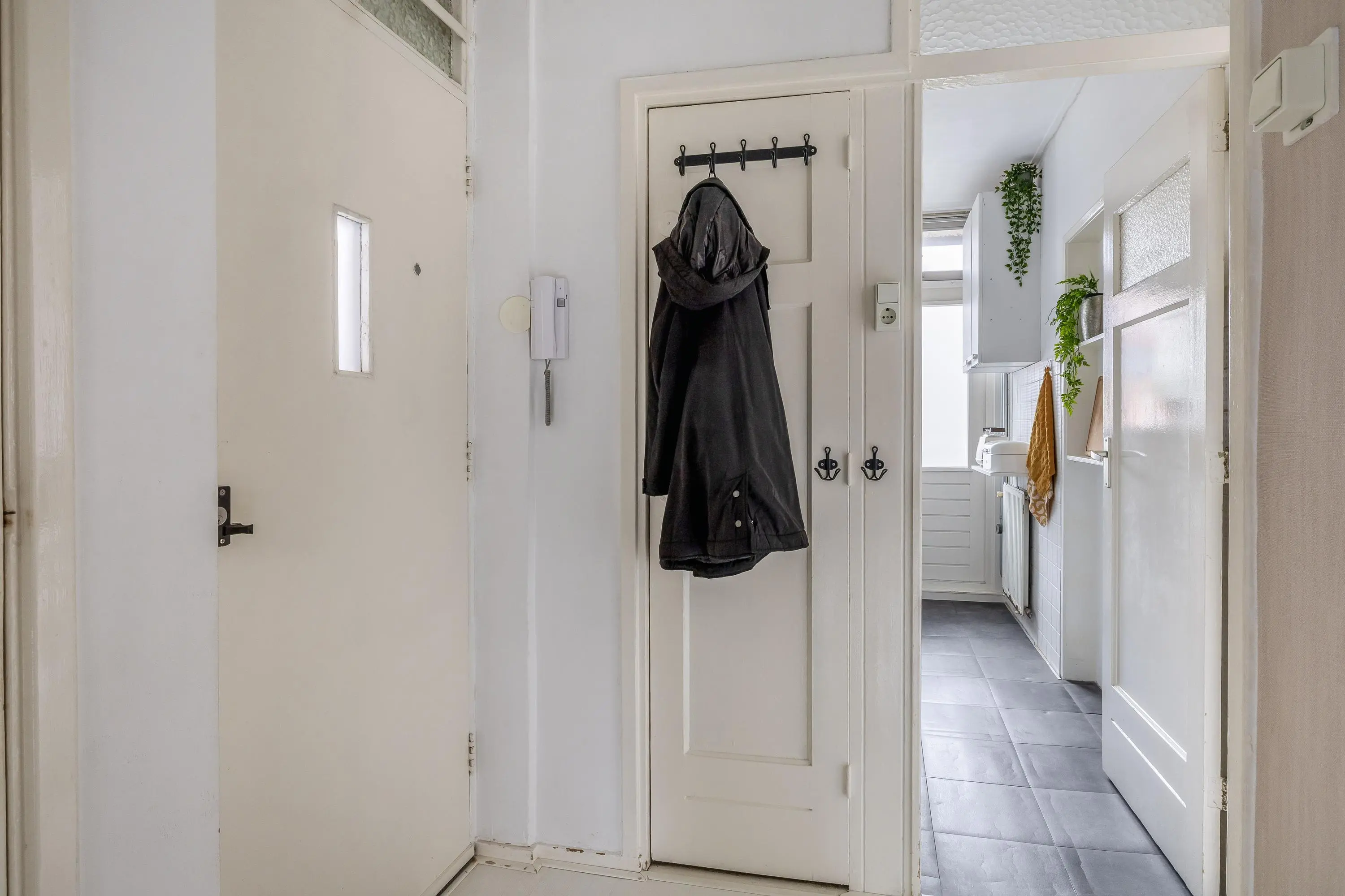 Via het gesloten portiek is het appartement op de derde woonlaag met de trap bereikbaar. De entree in de woning is in de hal. Aan de rechterzijde is als eerste de toiletruimte te vinden. Daarna volgen de eerste 2 slaapkamers. Beide kamers hebben goede afmetingen en zijn erg licht. De badkamer bevindt zich tegenover het toilet en heeft als sanitaire voorzieningen een douche, wastafel met meubel en de wasmachine aansluiting. Rechts van de entree is de meterkast aanwezig, daarna volgt de keuken. De eenvoudige rechte opstelling heeft als apparatuur een gaskookplaat met afzuigkap en oven, spoelbak en voldoende kastruimte. Het eerste balkon op het oosten is ook via de keuken bereikbaar. Dan is de doorgang naar de woonkamer. Een leuke ruimte met aan de voorzijde een grote raampartij met veel lichtinval. Door het goede formaat is er een fijne verdeling mogelijk tussen een eethoek en gezellig zitgedeelte. Als laatste is via de woonkamer de doorgang naar de grootste slaapkamer. Deze is gelegen aan de achterzijde en geeft toegang tot het tweede balkon op het westen. Echt een leuke kans voor de starters op de markt!