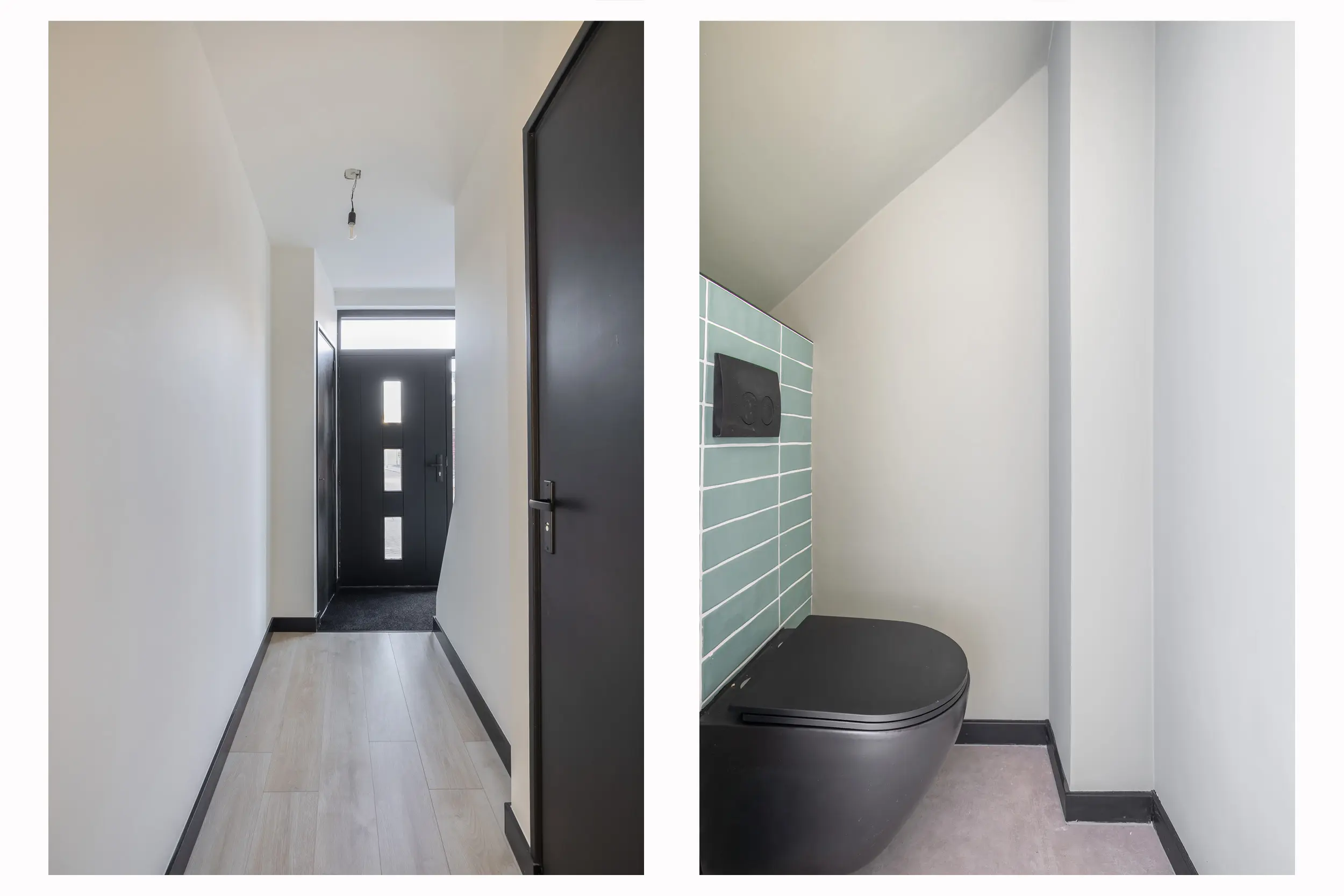 Bij binnenkomst stapt u de lichte hal binnen, voorzien van een nette laminaatvloer die doorloopt over de gehele begane grond. In de hal bevinden zich de meterkast, het separate toilet, de trapopgang naar de eerste verdieping en een stalen deur die toegang biedt tot de leefruimte.
