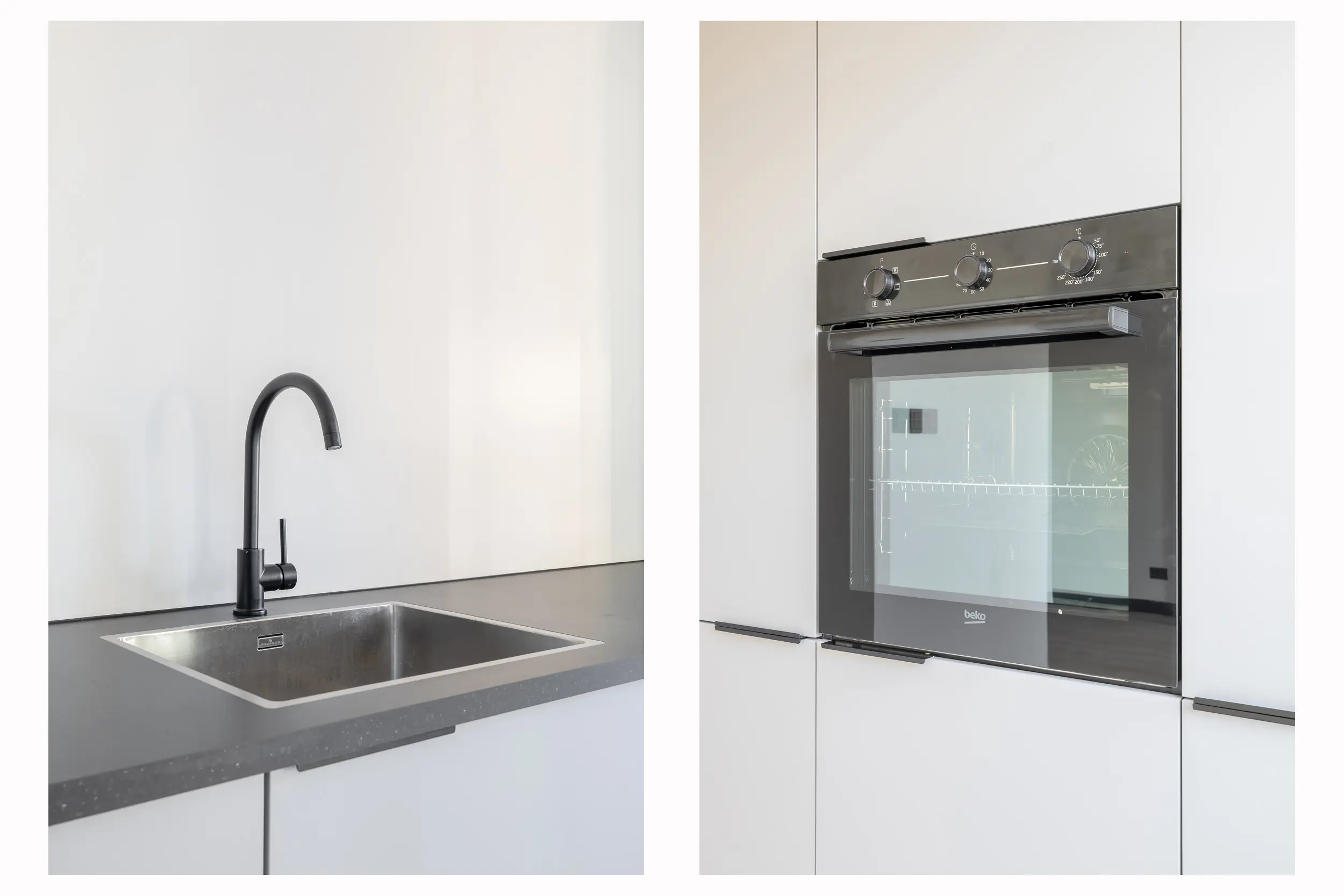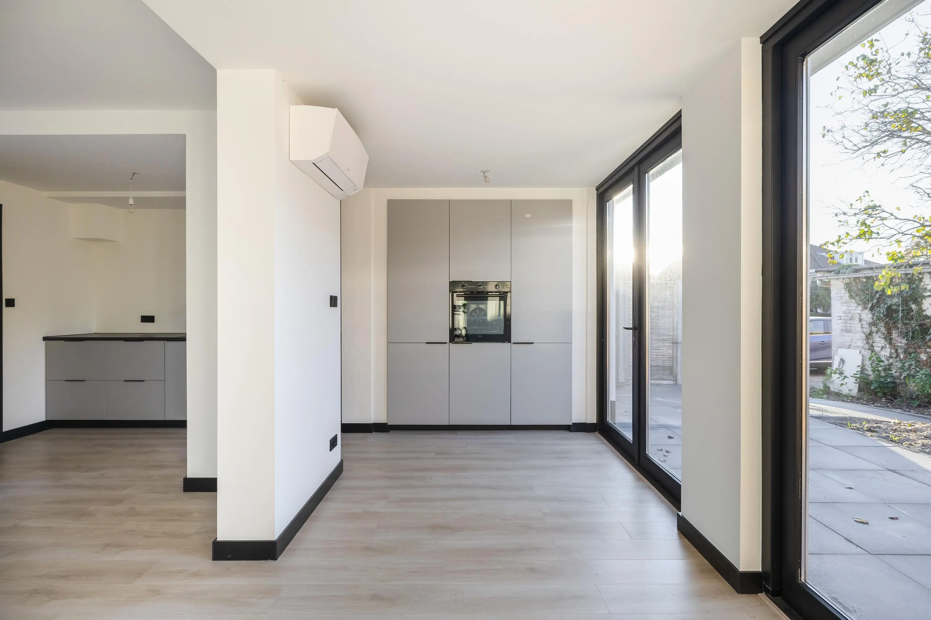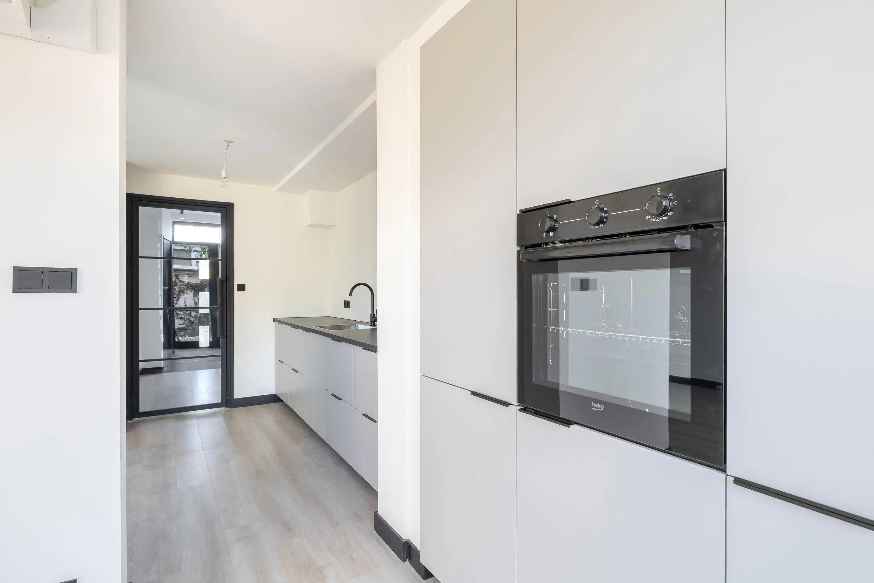 De moderne woonkeuken is in 2025 geplaatst en sluit perfect aan op de afwerking van de rest van de woning. De keuken is uitgerust met een spoelbak, Beko-oven, Ikea-vaatwasser en koelkast, en biedt daarnaast volop opbergruimte.