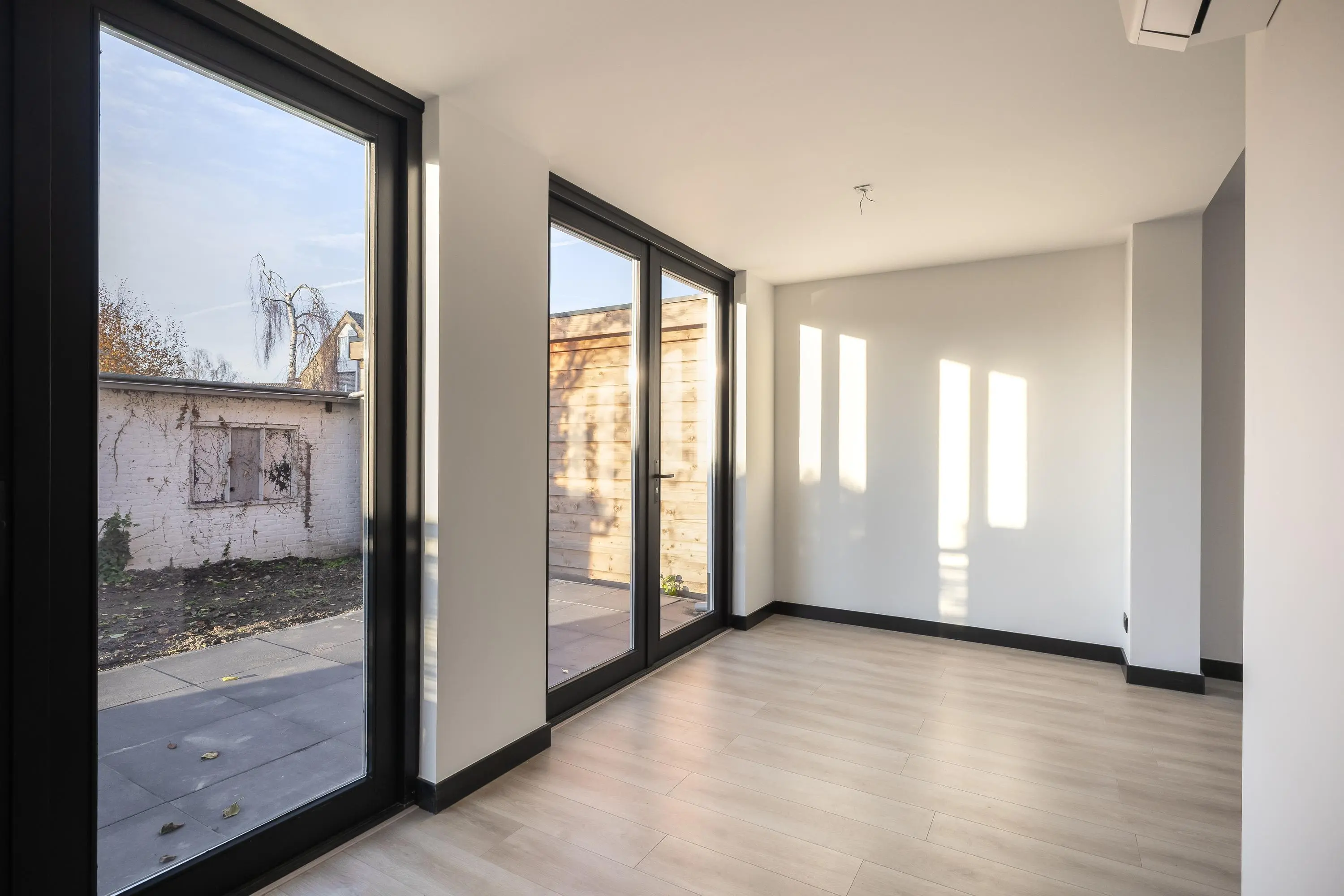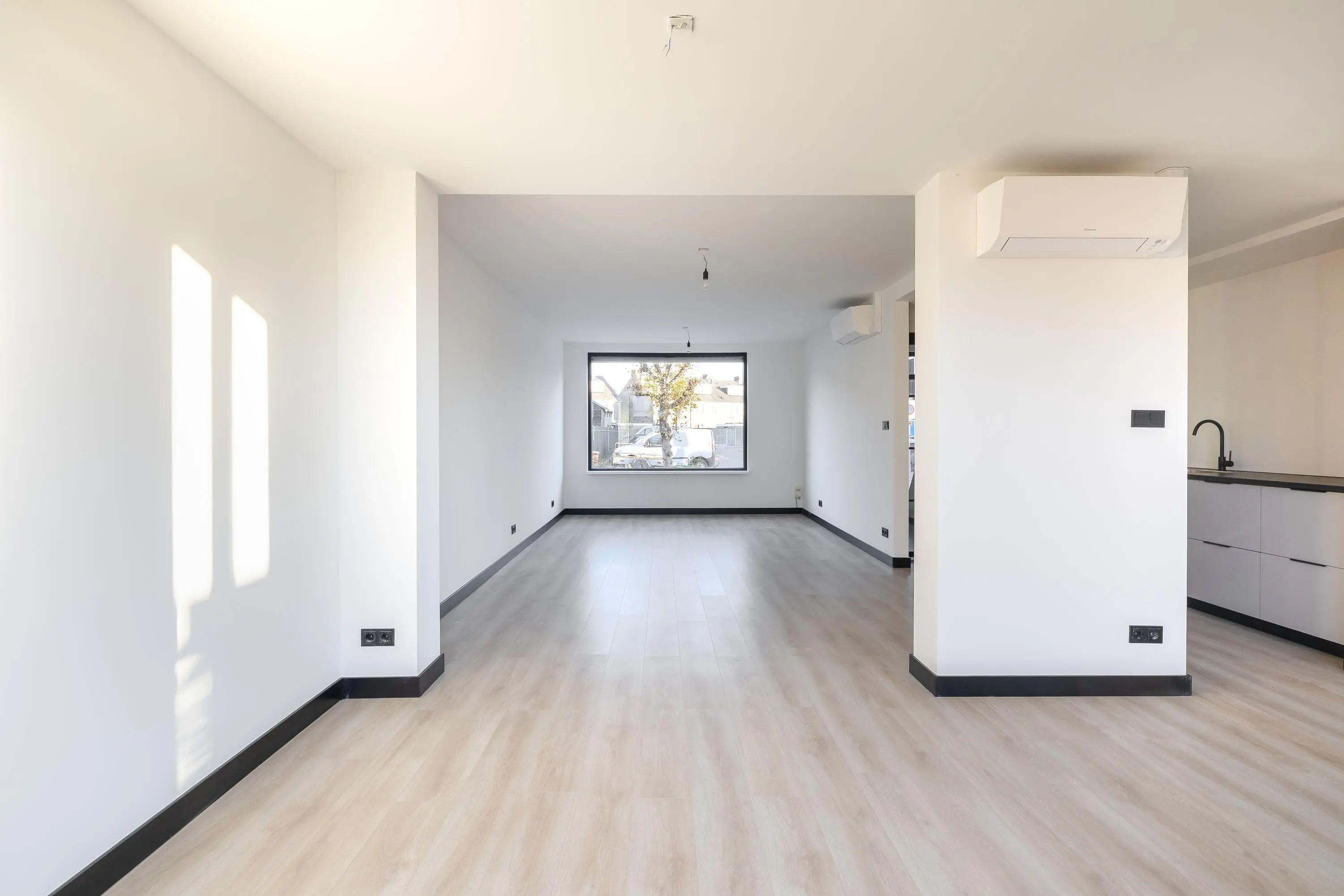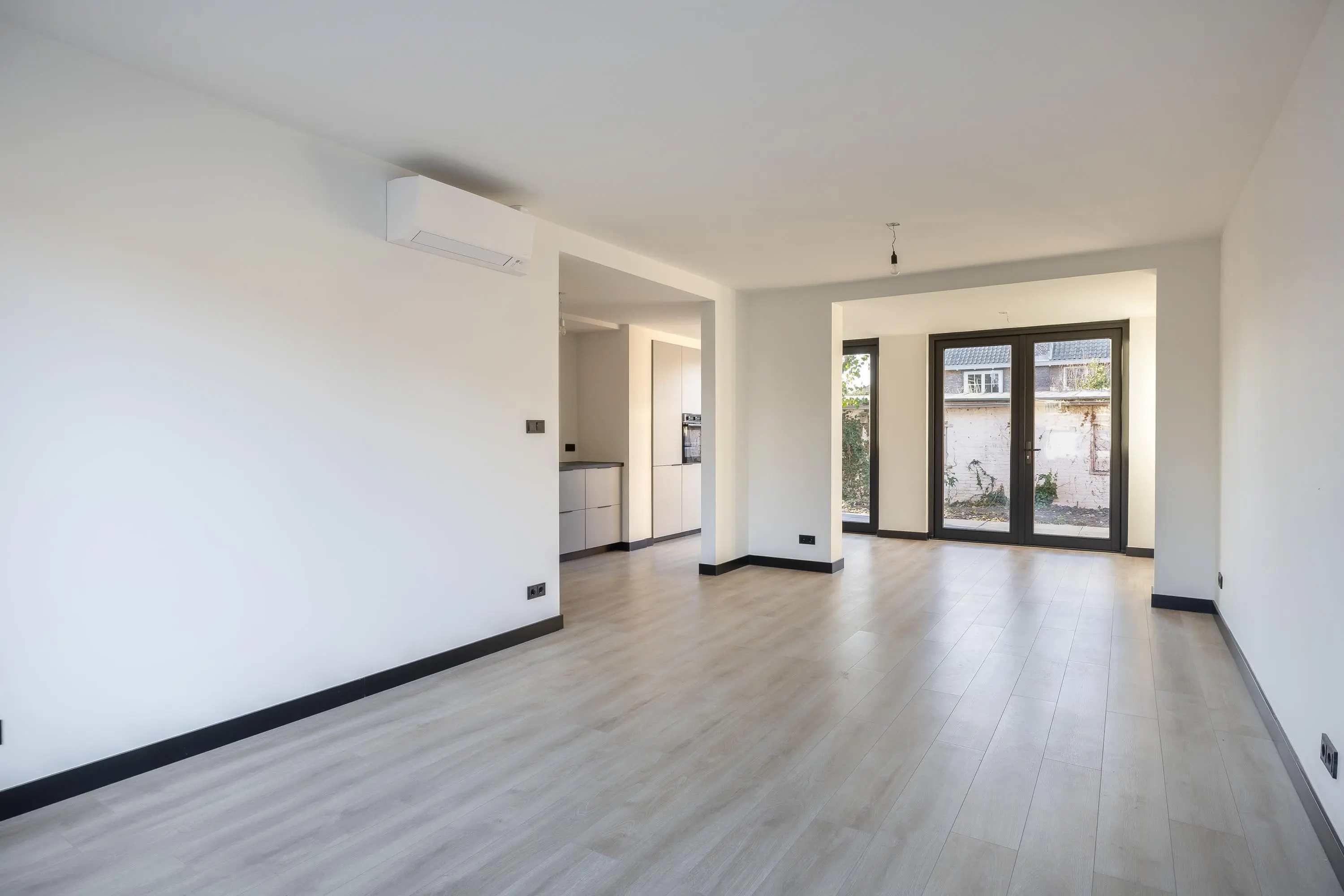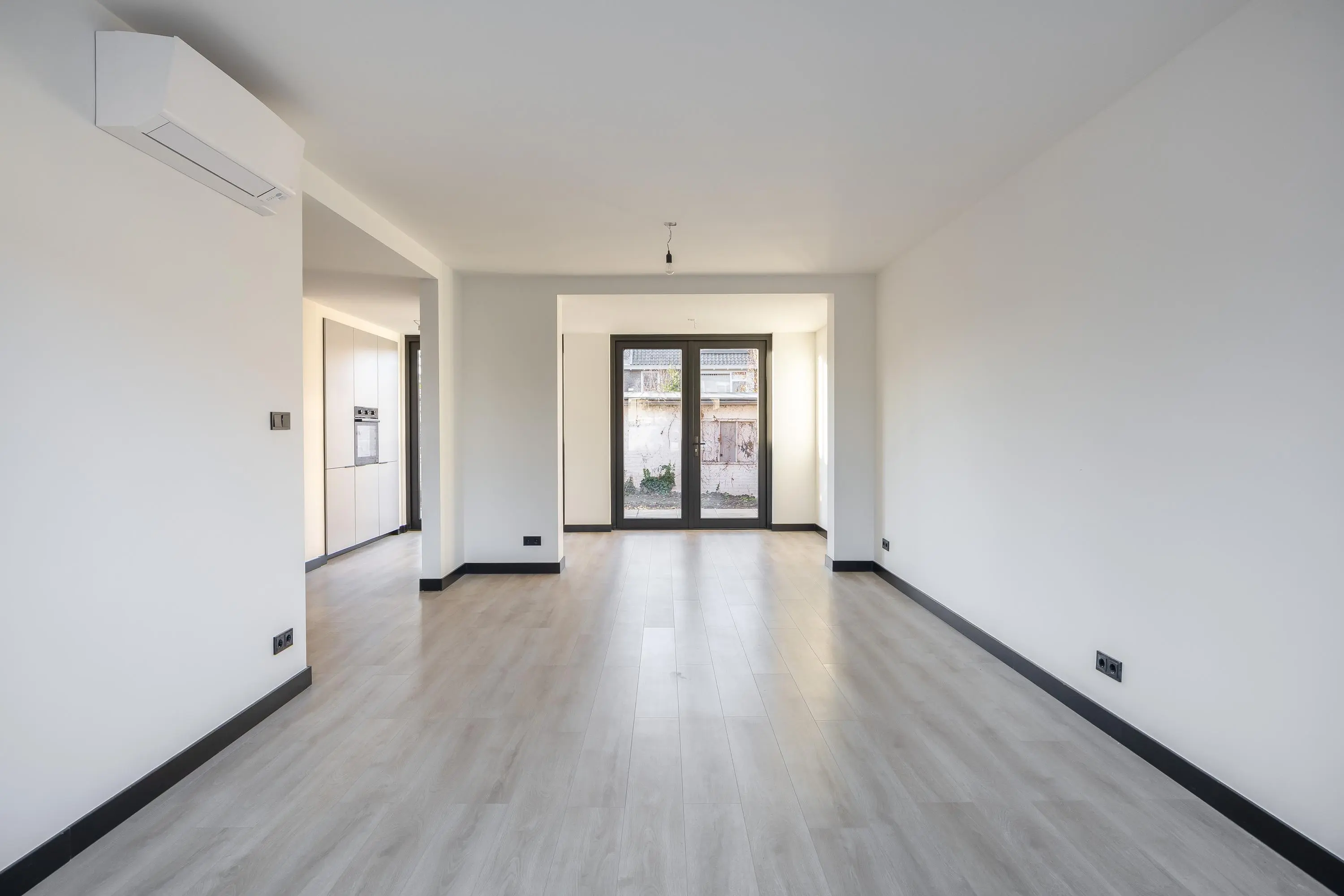 De living is ruim van opzet en profiteert van veel daglicht dankzij het grote raam aan de voorzijde en de dubbele openslaande deuren aan de achterzijde. Door de royale indeling is de begane grond uitstekend in te richten met een comfortabele zithoek en een aparte eethoek. De strak gestucte en gesausde wanden geven de ruimte een eigentijdse uitstraling. Daarnaast zijn er twee airconditioningunits geplaatst. Via de openslaande deuren bereikt u de achtertuin.