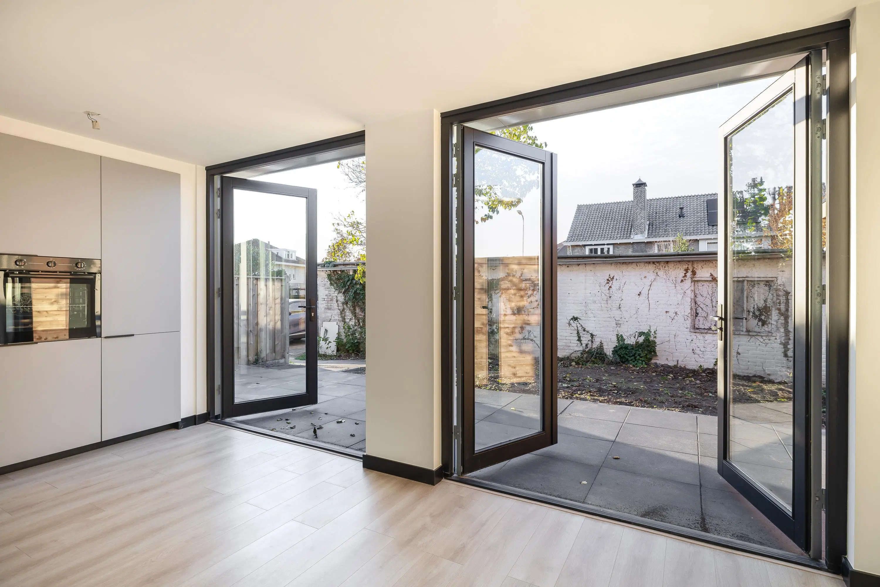 De kozijnen zijn uitgevoerd in hout en voorzien van dubbel glas.
