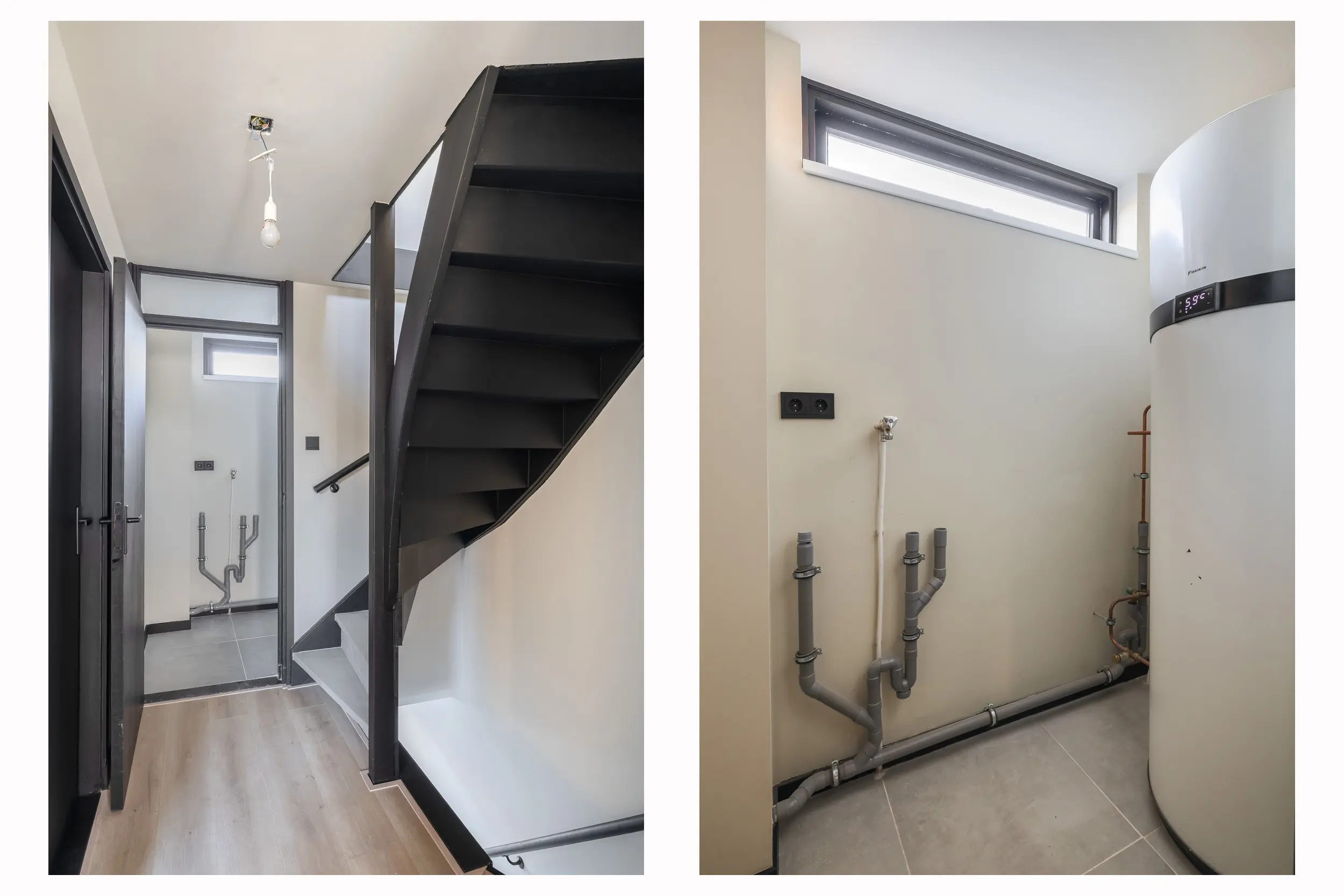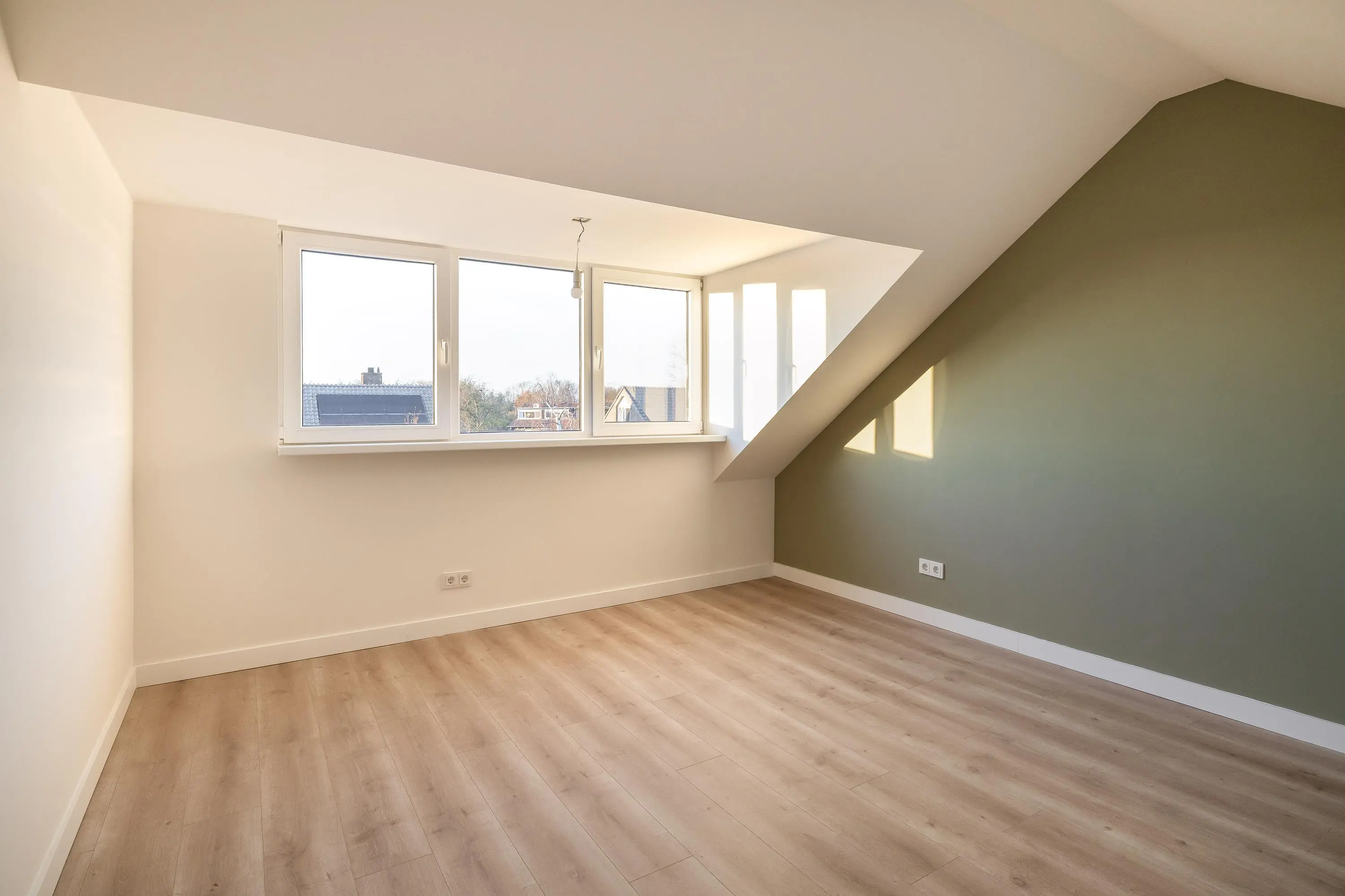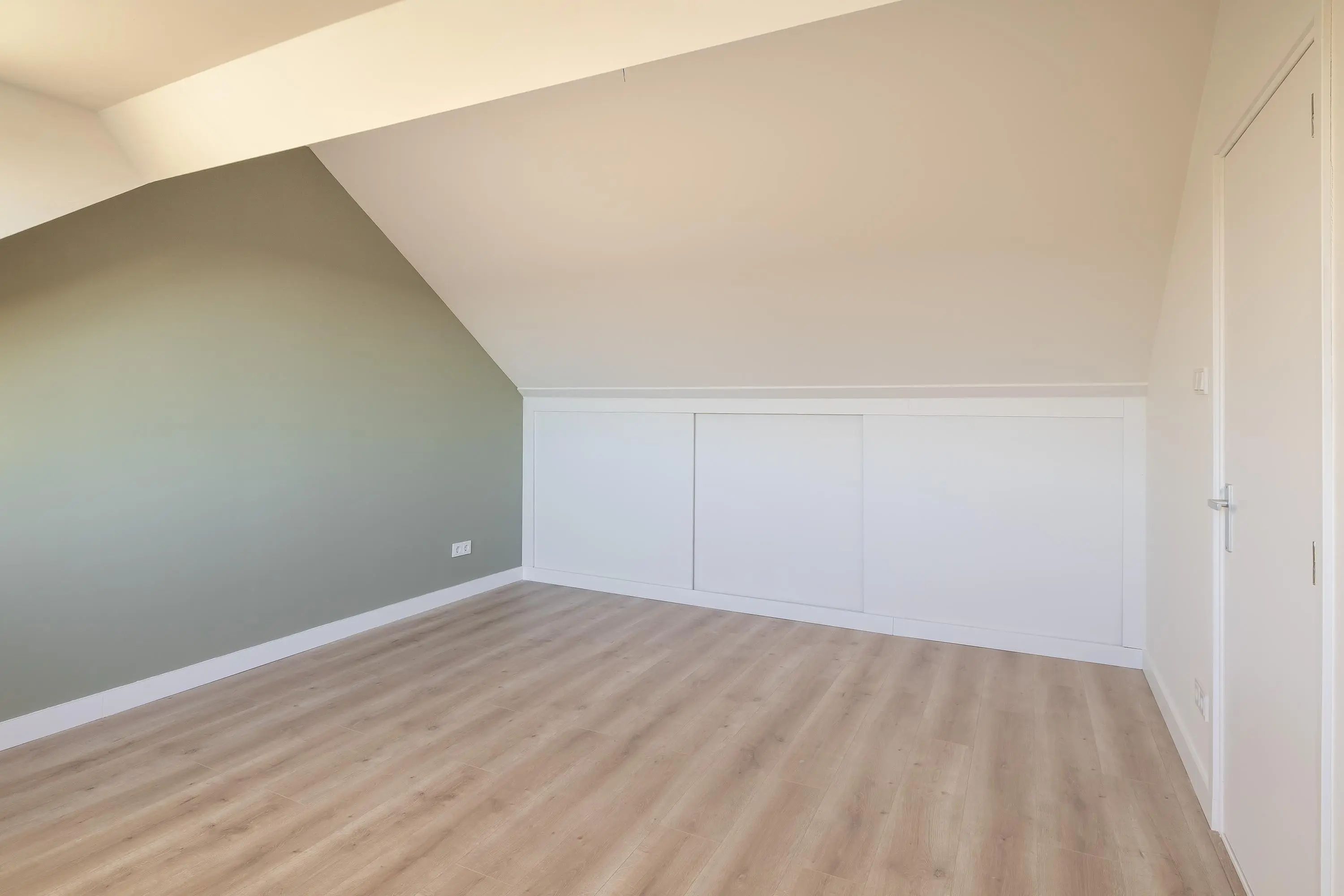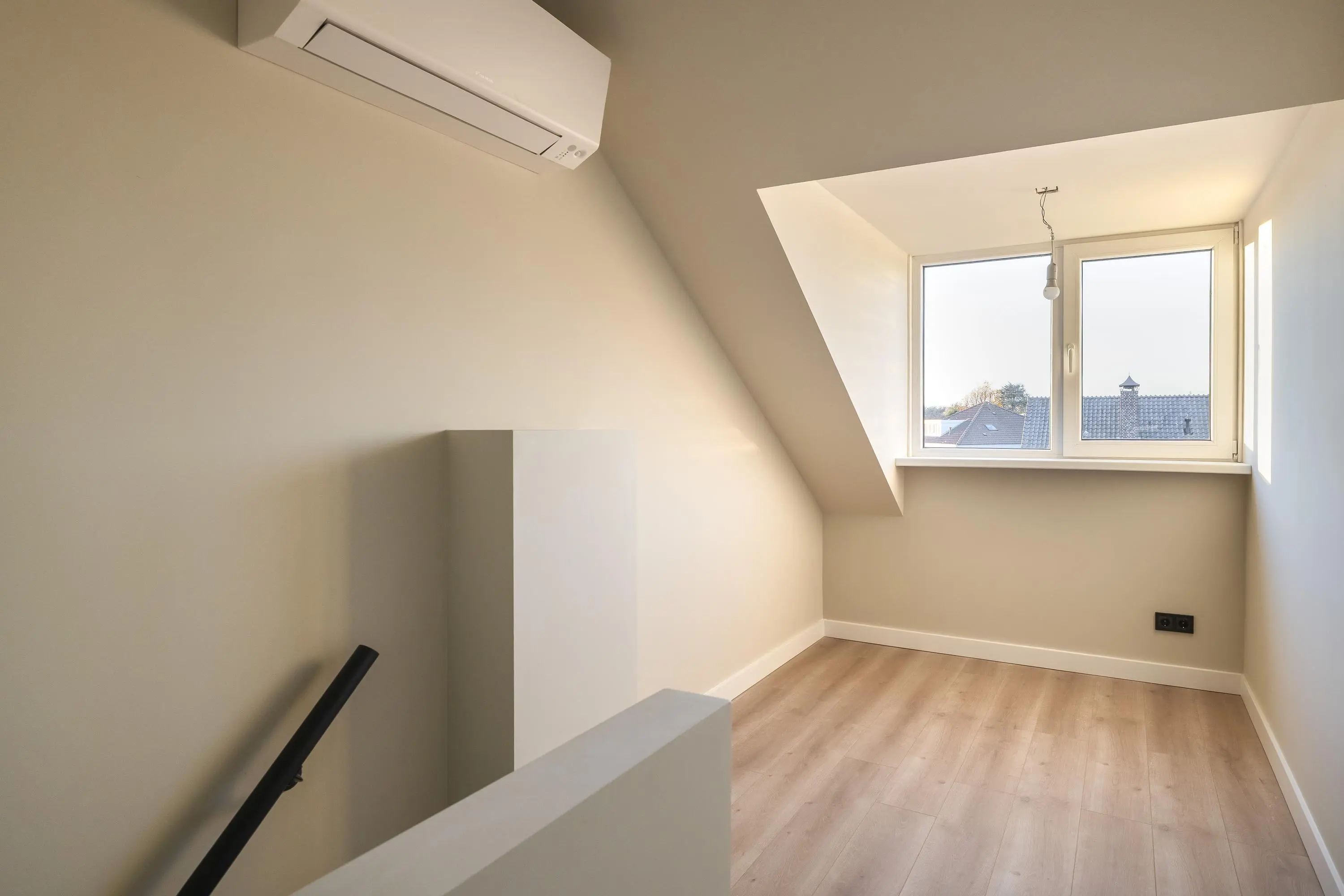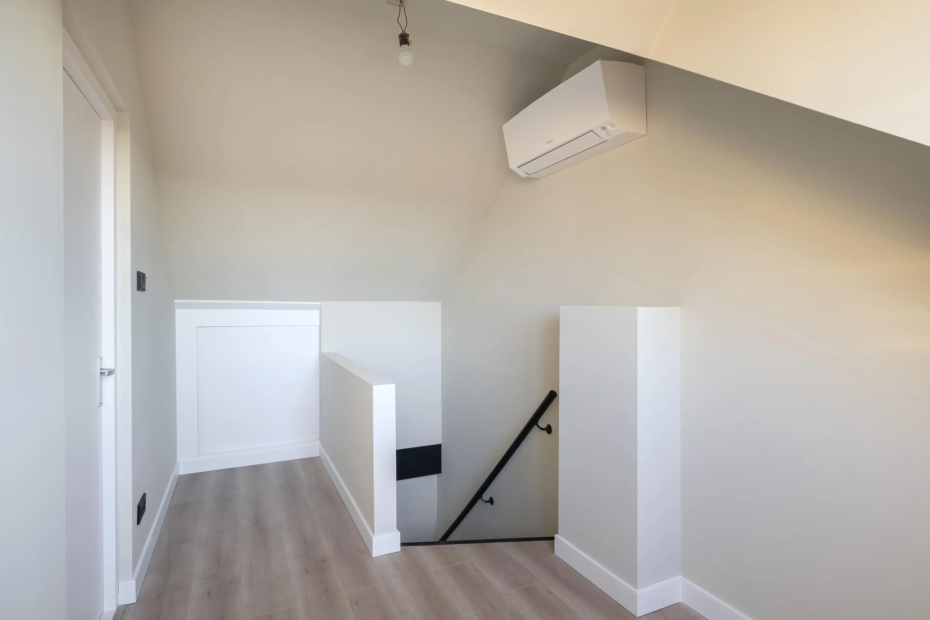 De overloop is voorzien van dezelfde laminaatvloer als de overige verdiepingen en beschikt over airconditioning. Via een schot in de muur is praktische bergruimte gecreëerd. Deze verdieping is bovendien vergroot door het plaatsen van een dakkapel, waardoor de ruimte ruimer en lichter aanvoelt.