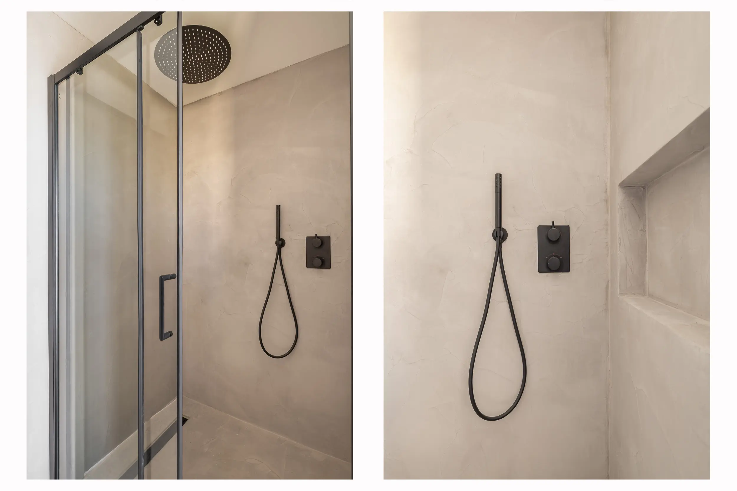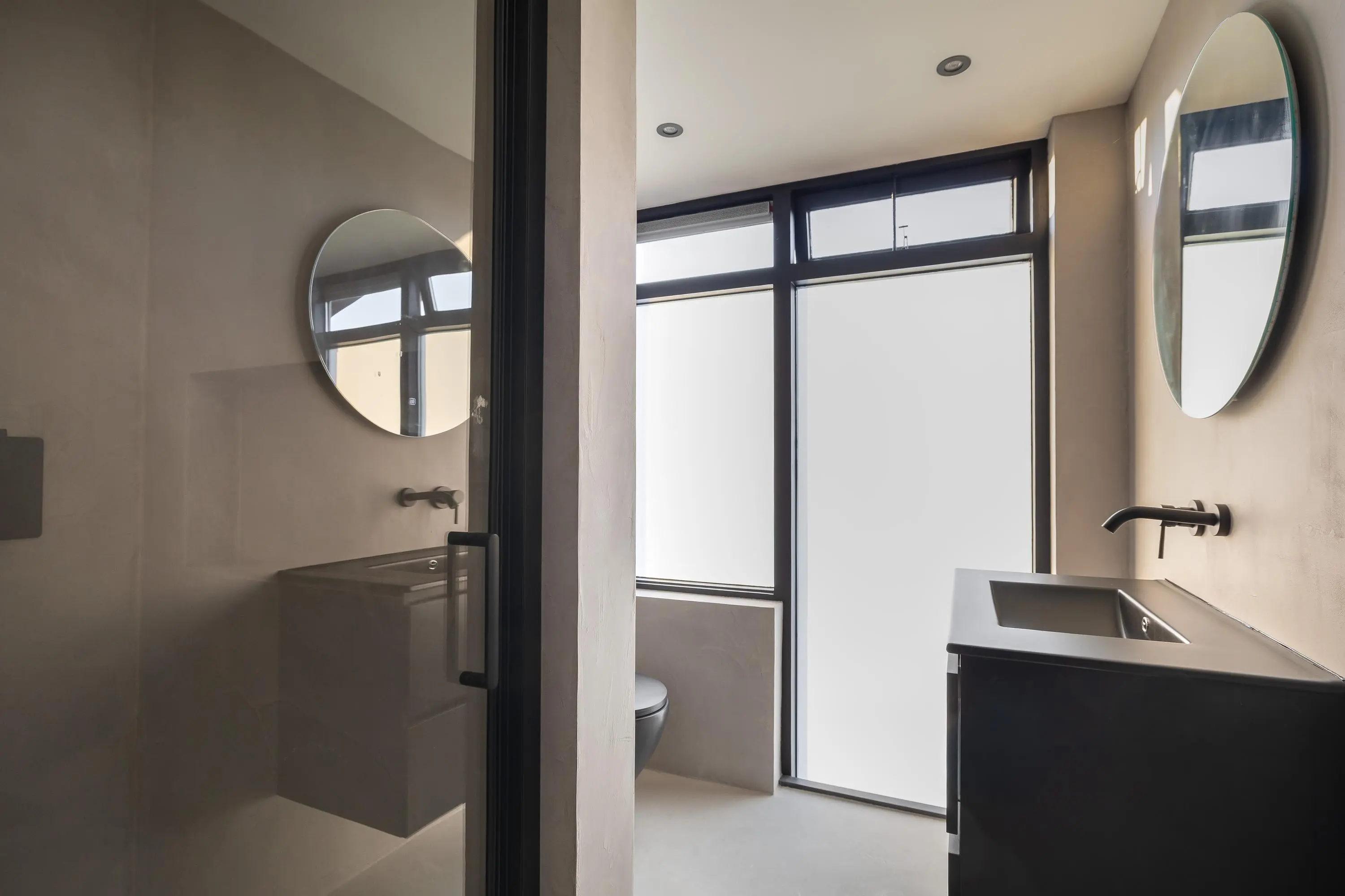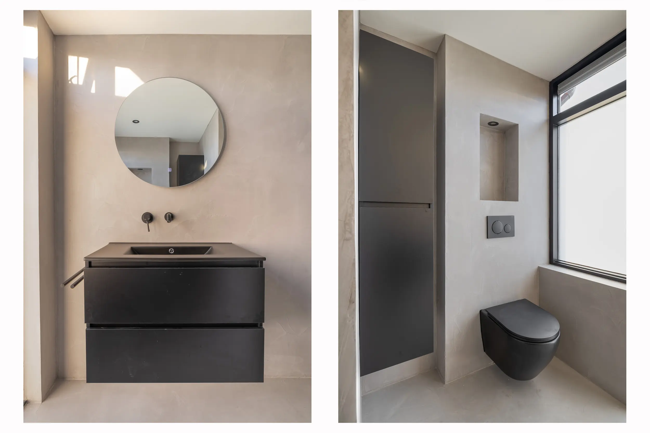 De moderne badkamer is volledig vernieuwd en voorzien van een nieuwe wand en vloer, afgewerkt met gepolijst beton (beton ciré) en de vloer is voorzien van elektrische vloerverwarming. De badkamer is uitgerust met een inloopdouche met zowel een regendouche als een handdouche, een toilet en een wastafelmeubel met bijpassende opbergkast. Het plafond is voorzien van spotjes.