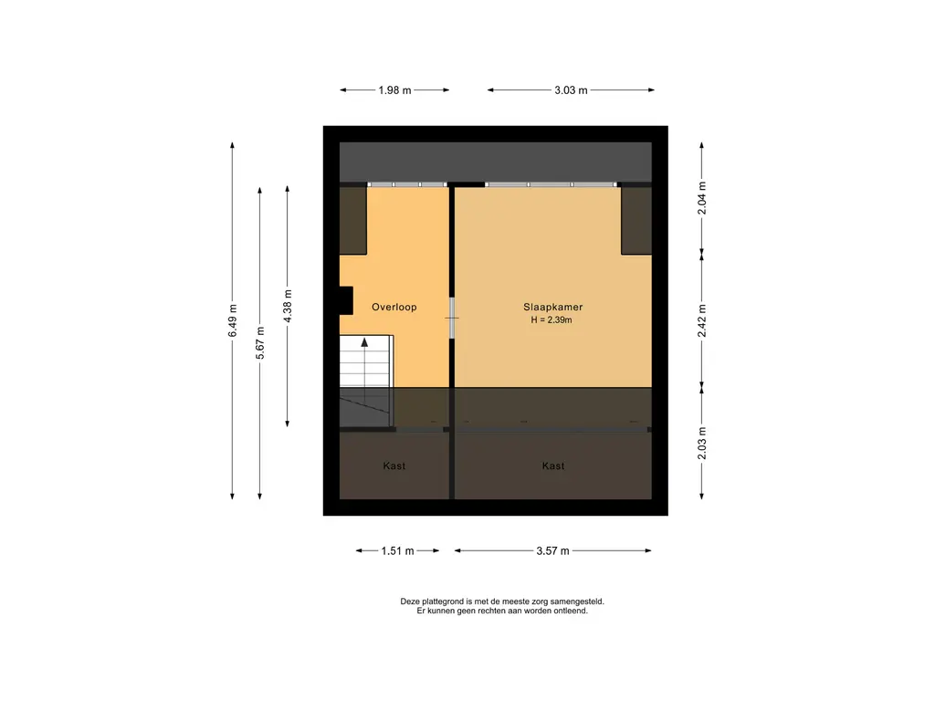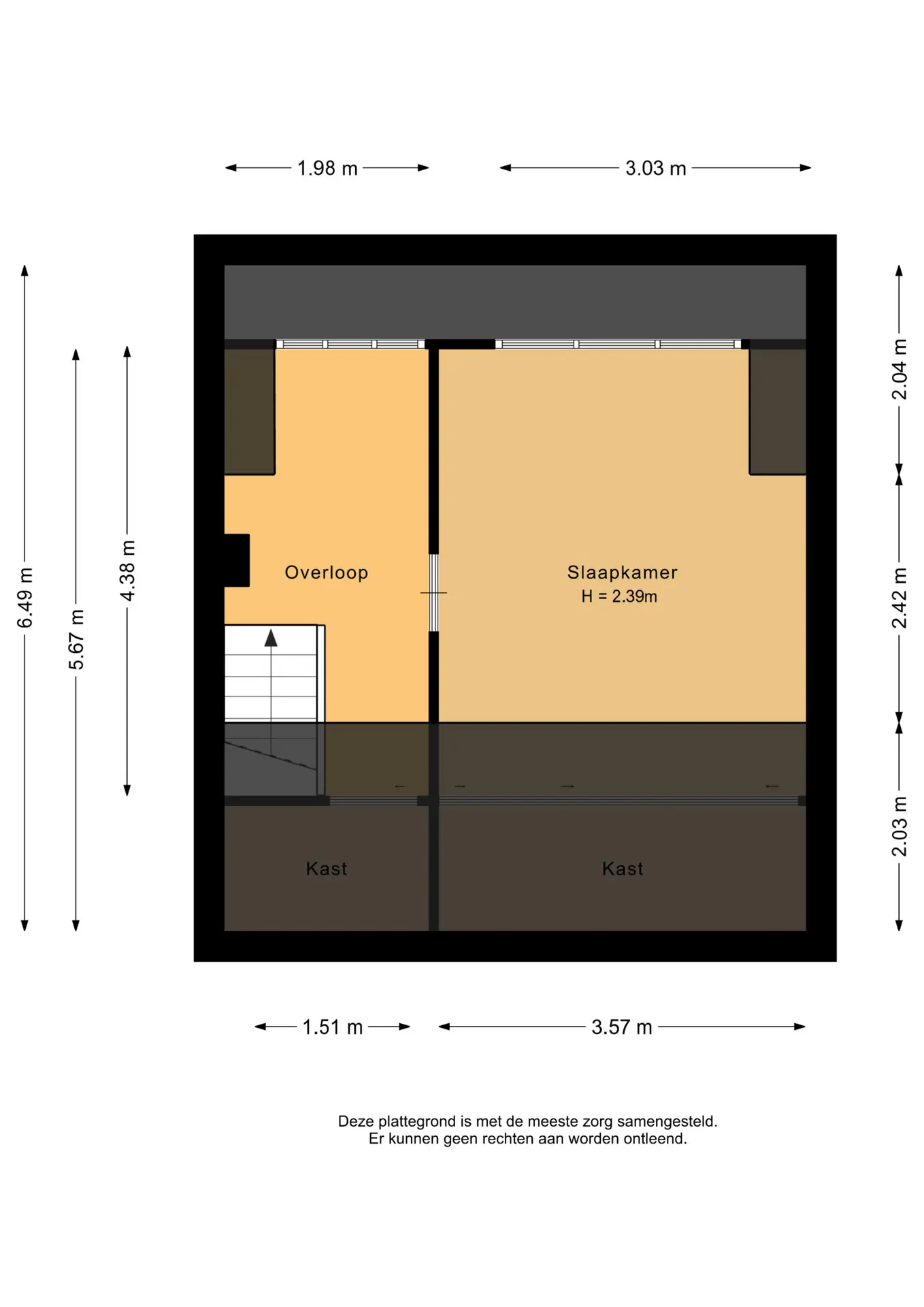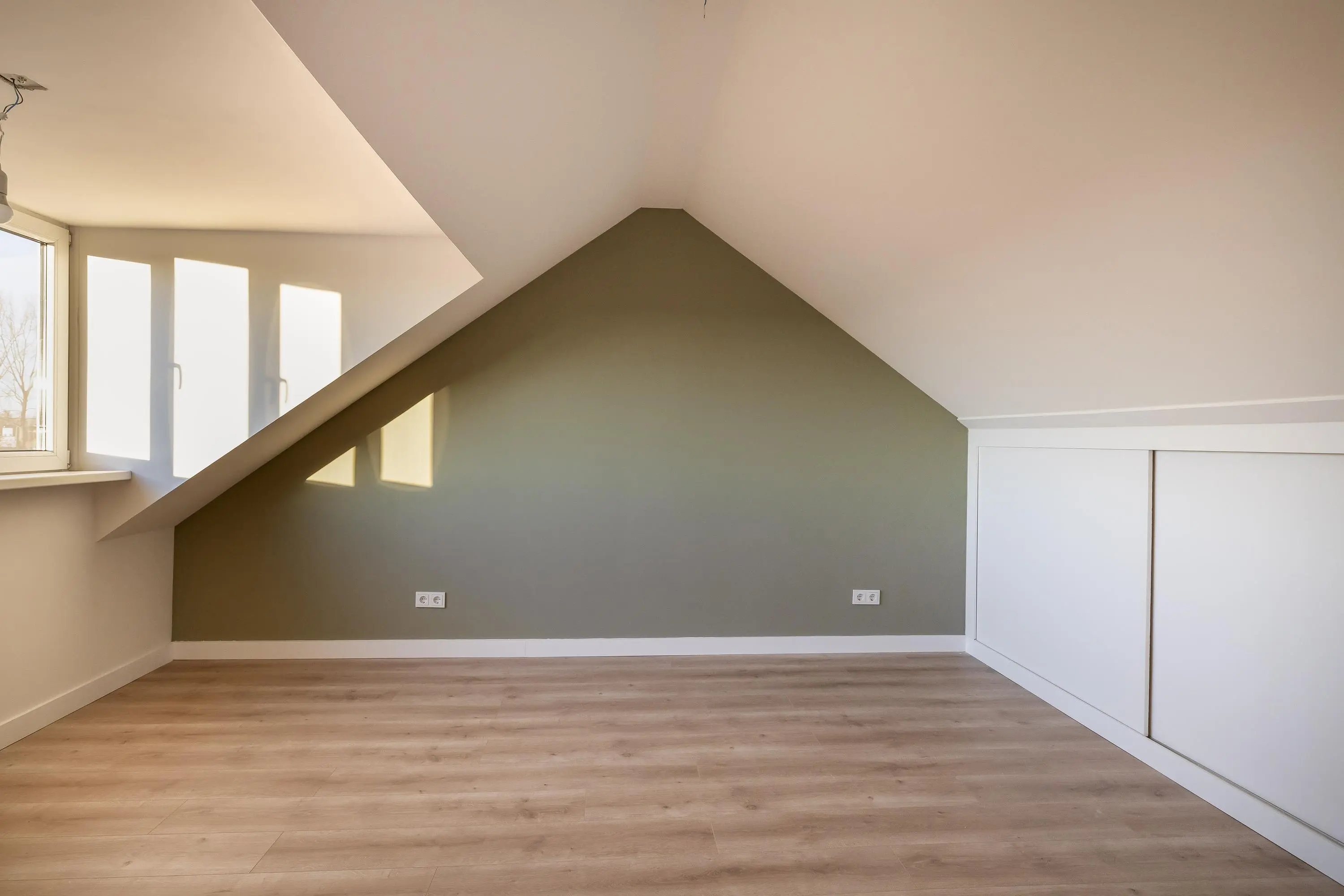 De slaapkamer meet circa 8,5m² en profiteert van veel lichtinval door het dakkapel. Achter de schotten vindt u extra opbergruimte.