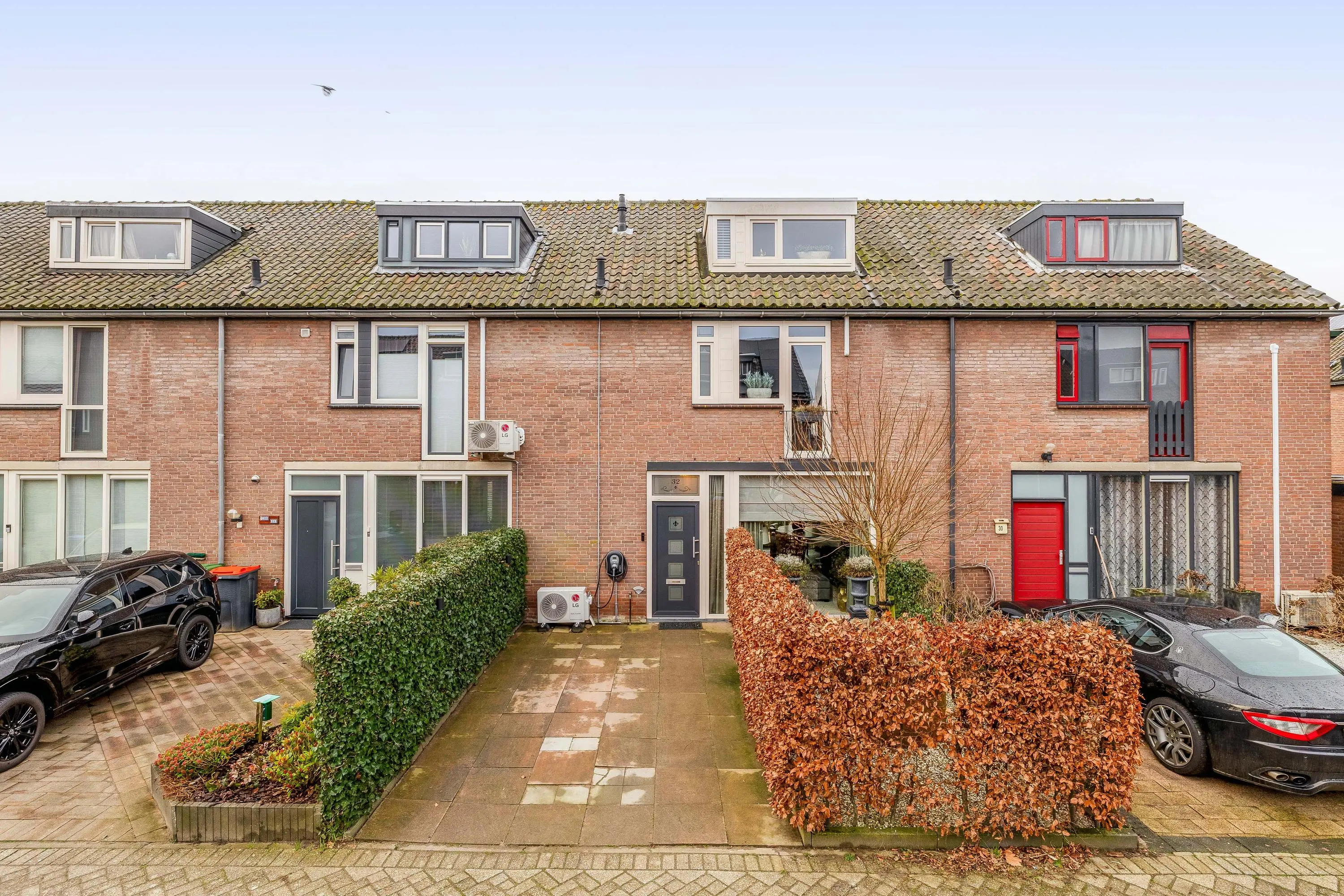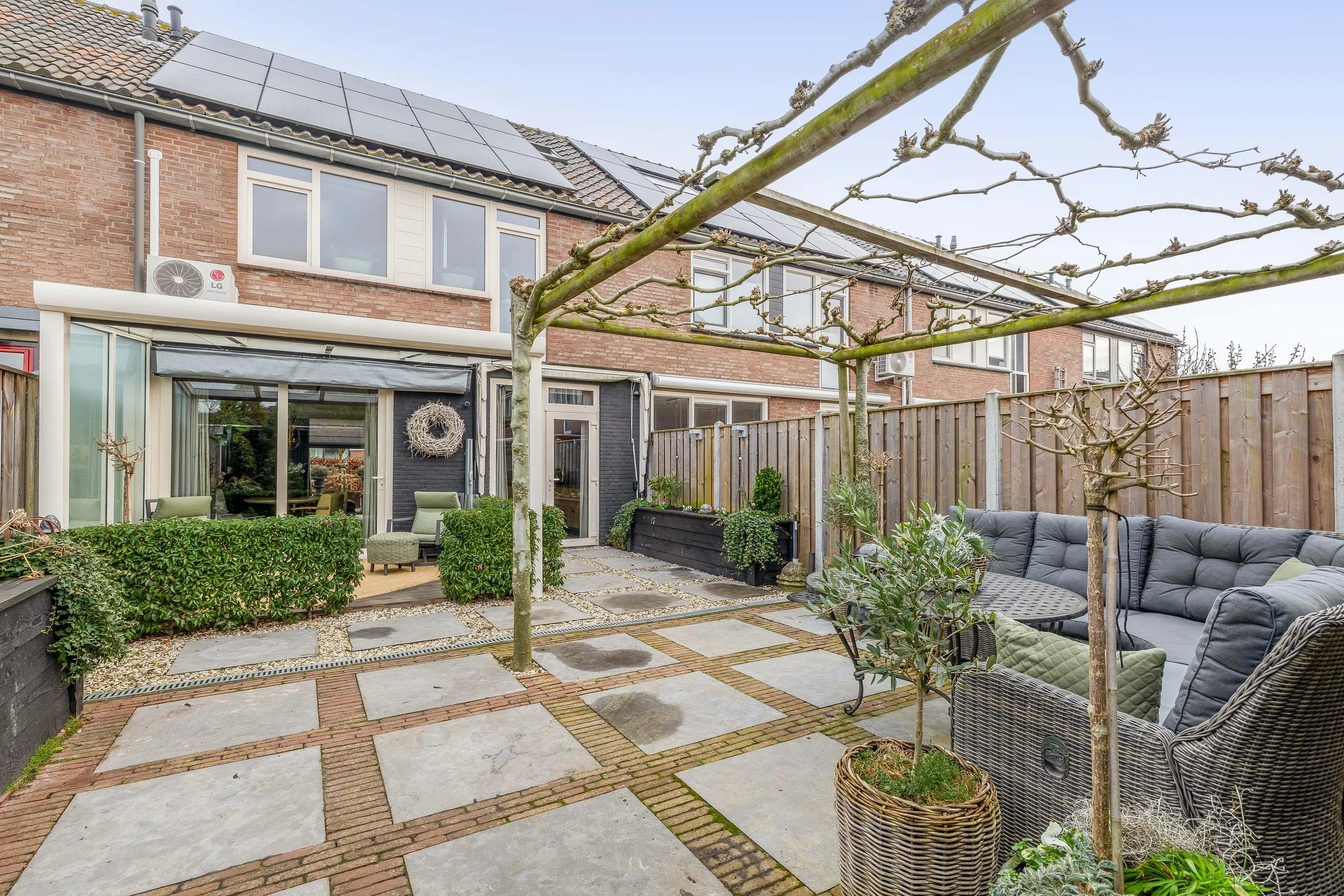 De voortuin is grotendeels betegeld en deels voorzien van kiezelstenen met beplanting, wat zorgt voor een verzorgde uitstraling. Hier is de mogelijkheid om de auto op eigen terrein te parkeren en er is een elektrische laadvoorziening aanwezig. De groene haag zorgt voor een natuurlijke afscheiding.