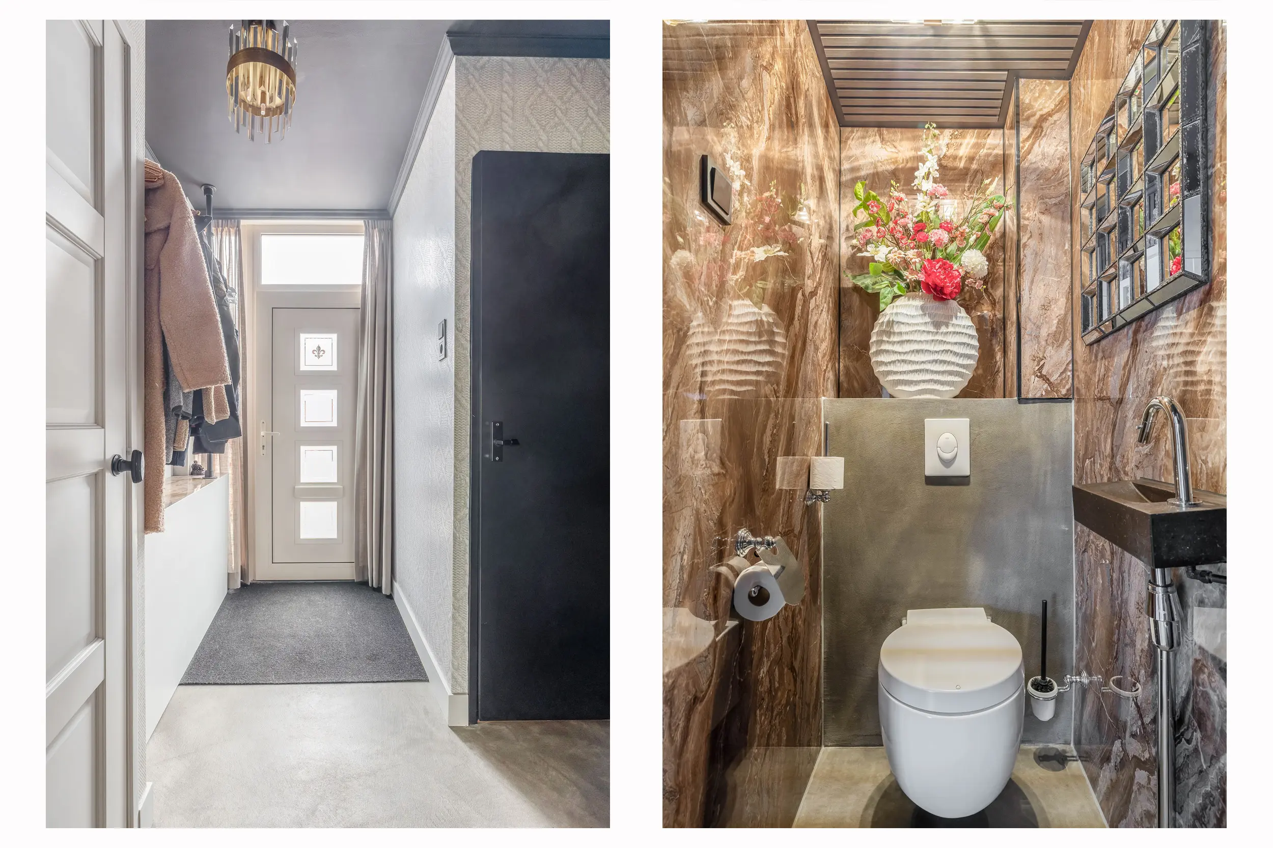 Bij binnenkomst betreedt u de hal, waar direct de nette beton ciré vloer opvalt. Deze stijlvolle vloer loopt door over de gehele begane grond en is bovendien voorzien van comfortabele vloerverwarming. In de hal bevinden zich de meterkast, een modern separaat toilet met fonteintje en de trapopgang naar de eerste verdieping.