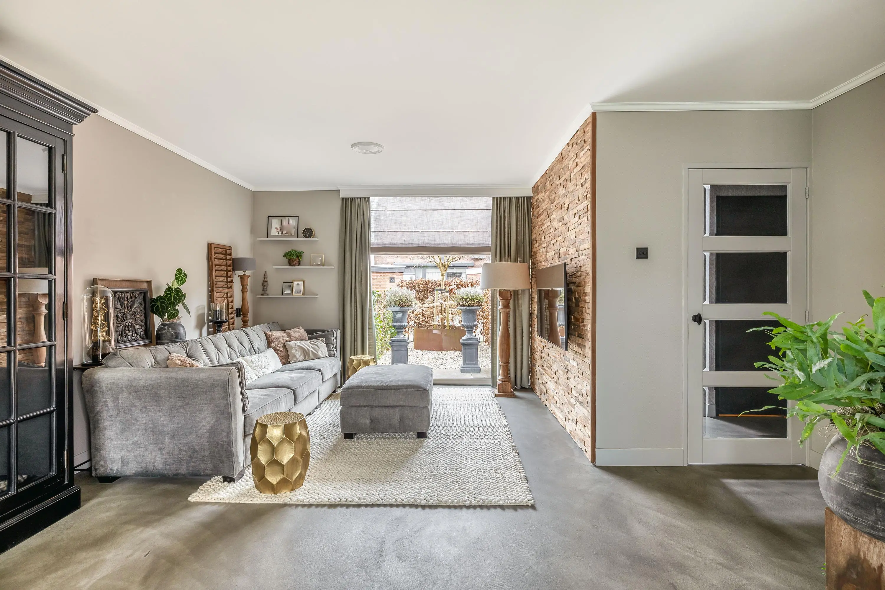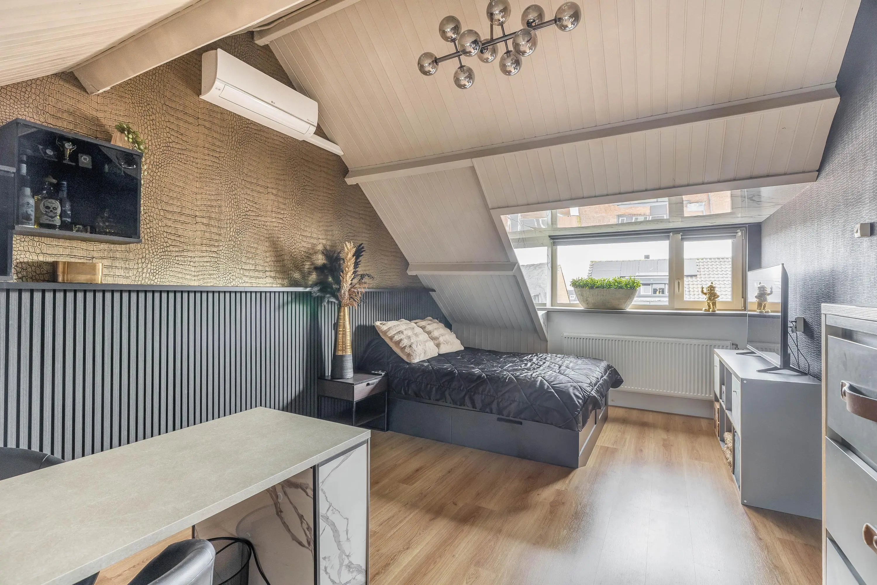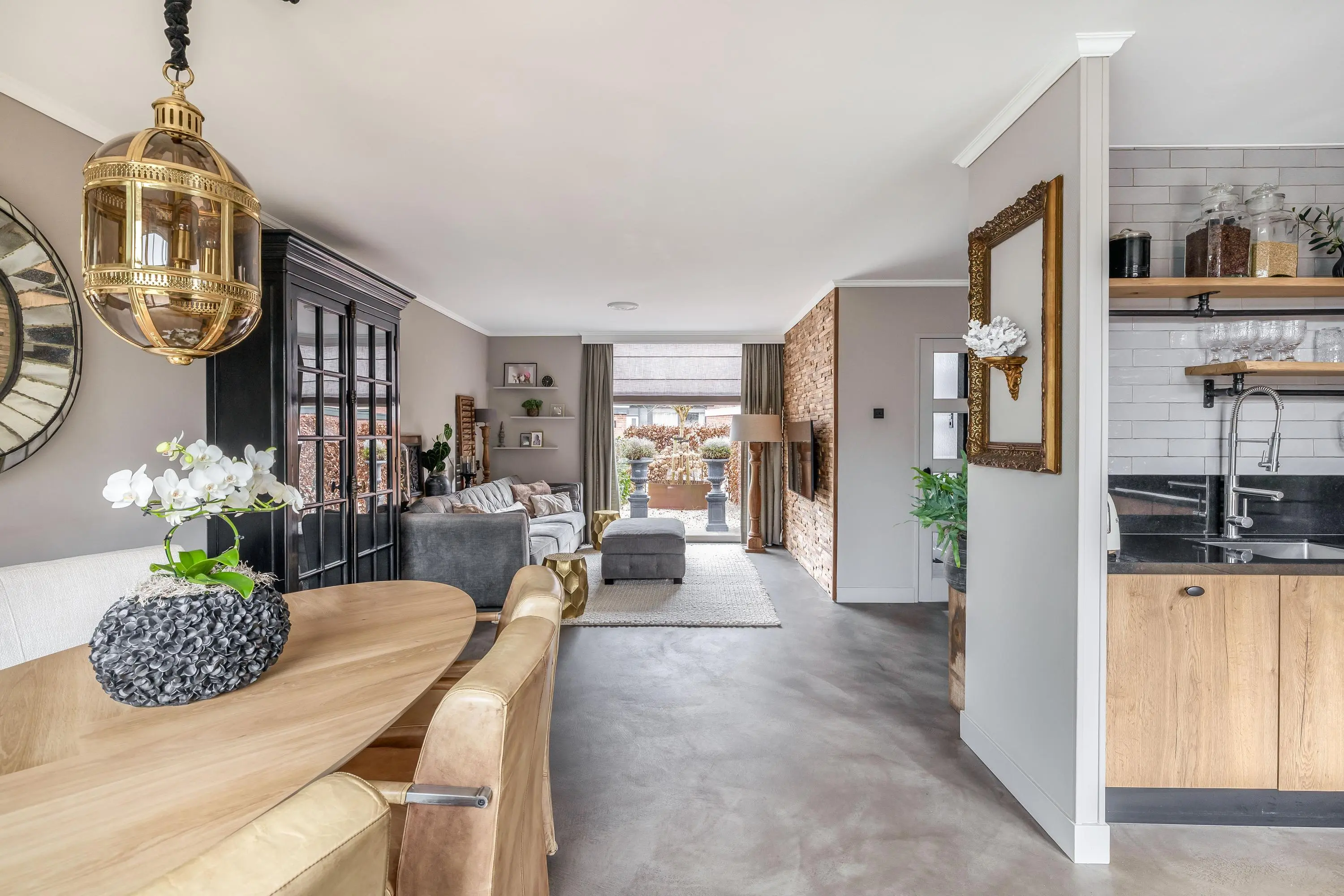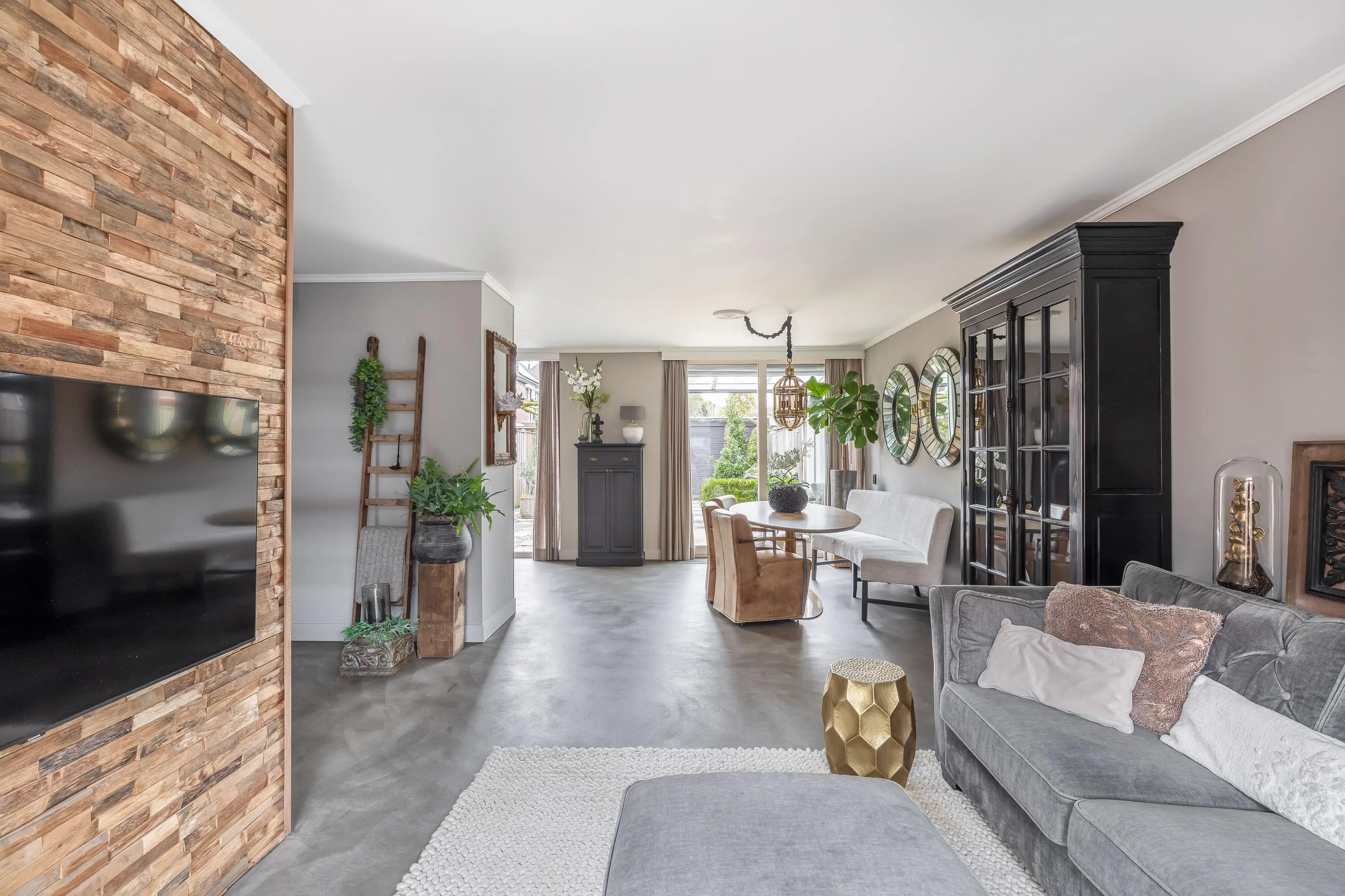 De royale leefruimte is een fijne plek om thuis te komen. Dankzij de grote raampartijen geniet de ruimte van een prettige hoeveelheid daglicht. Er is volop ruimte voor zowel een gezellige zithoek als een ruime eethoek. Aan de voorzijde van de woning is een sfeervolle zithoek gerealiseerd, waarbij één wand is afgewerkt in een warme houtlook. Dit geeft de ruimte extra karakter. De living is voorzien van airconditioning, wat zorgt voor een aangenaam binnenklimaat. Daarnaast beschikt de ruimte over een praktische trapkast.