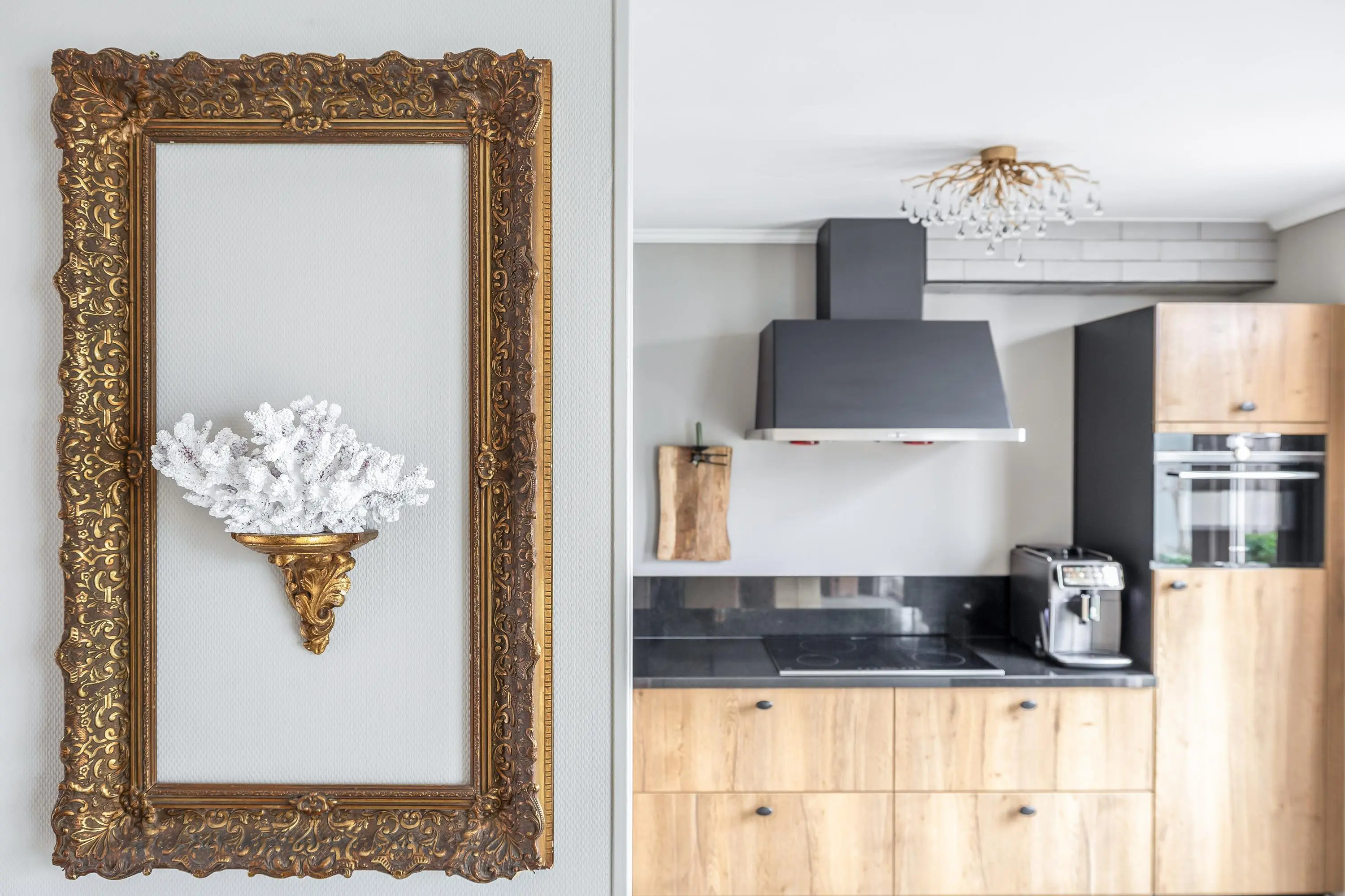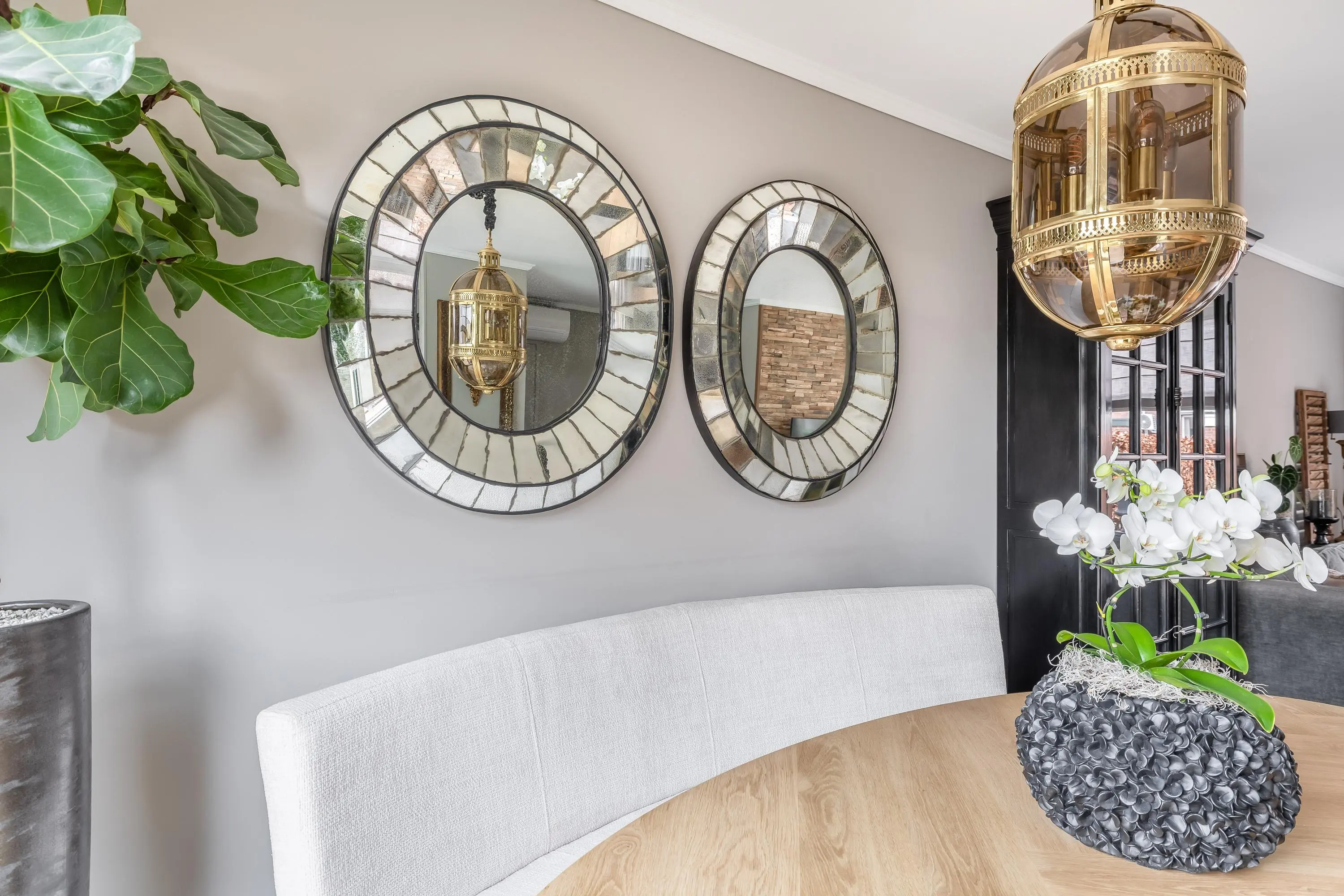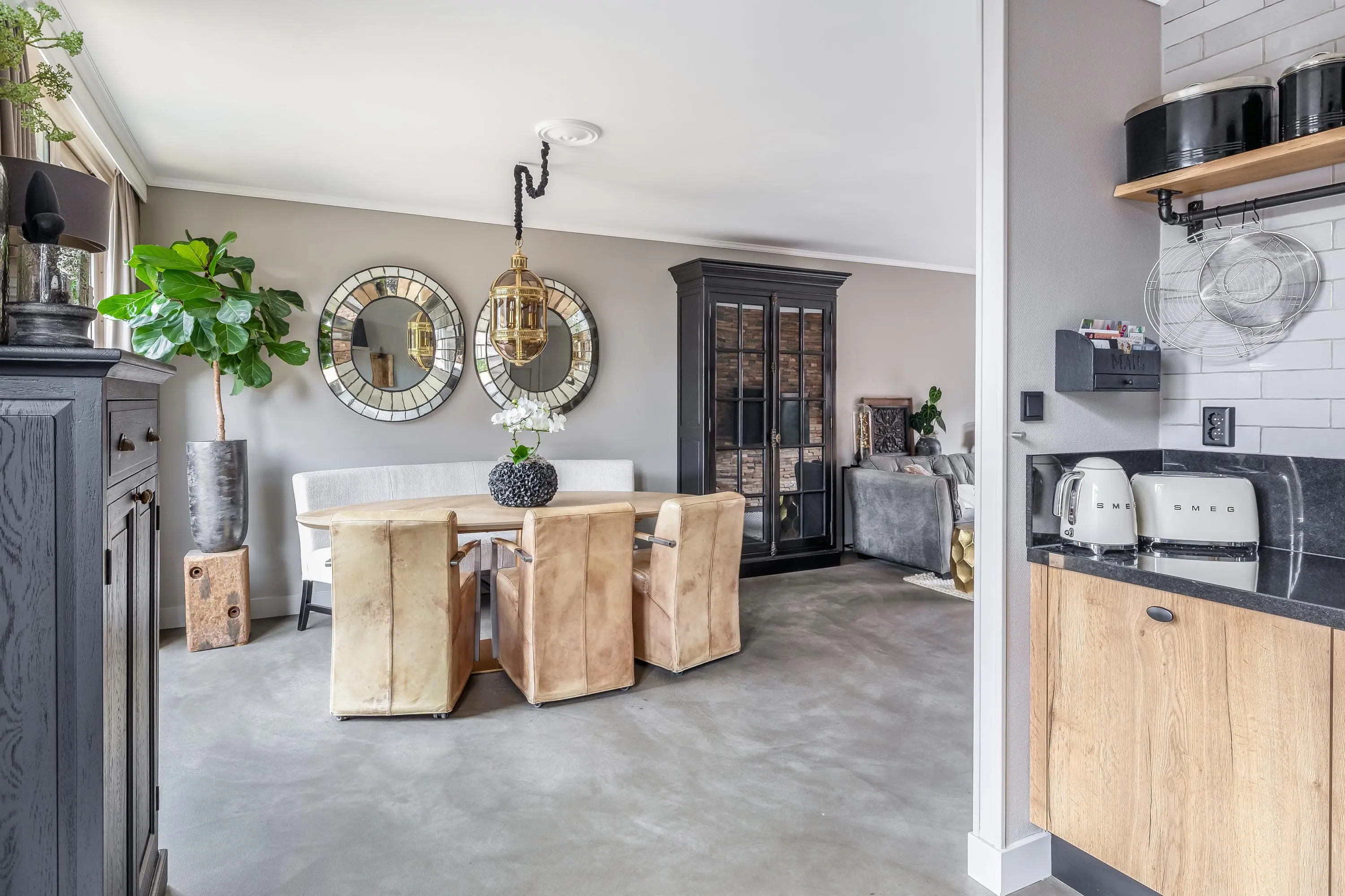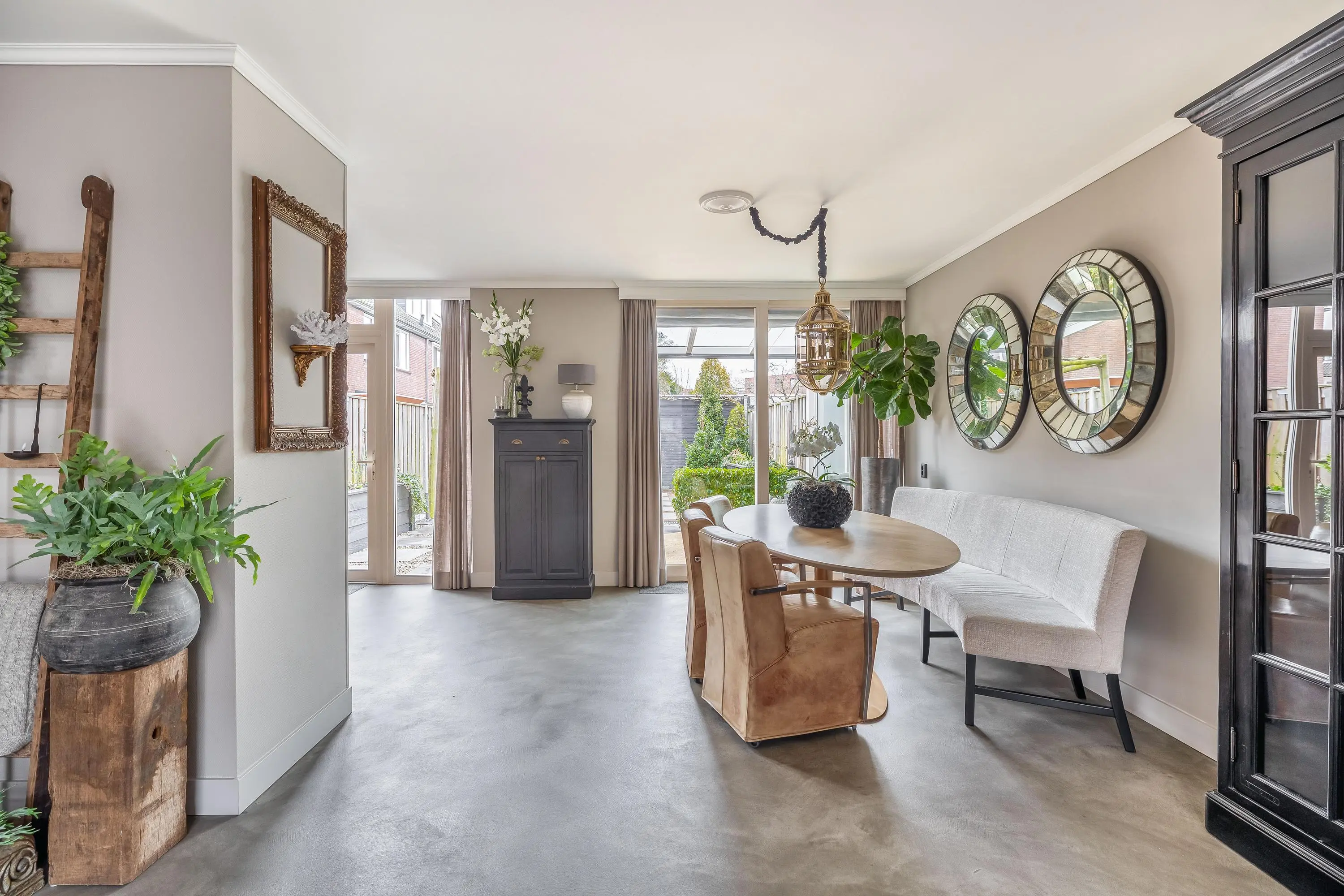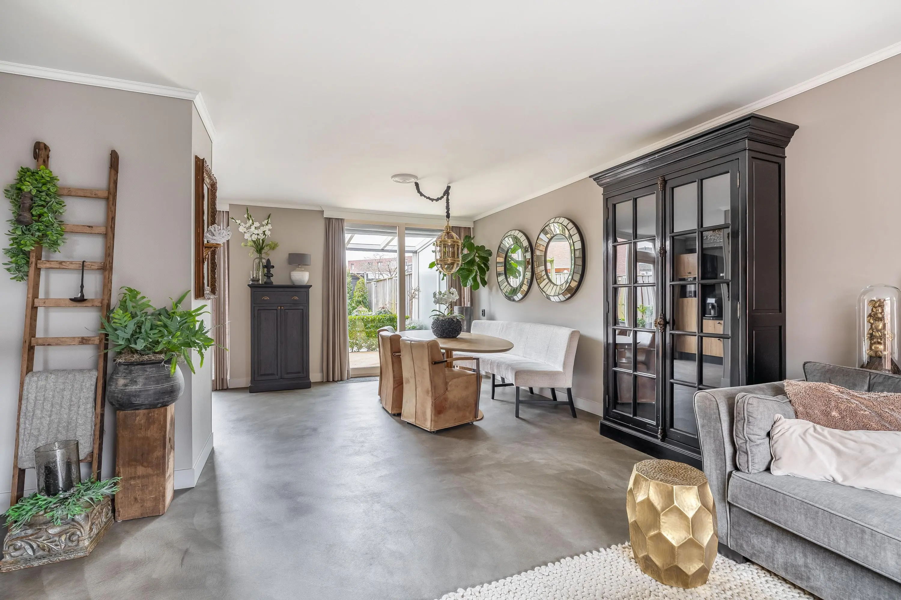 De royale leefruimte is een fijne plek om thuis te komen. Dankzij de grote raampartijen geniet de ruimte van een prettige hoeveelheid daglicht. Er is volop ruimte voor zowel een gezellige zithoek als een ruime eethoek. Aan de voorzijde van de woning is een sfeervolle zithoek gerealiseerd, waarbij één wand is afgewerkt in een warme houtlook. Dit geeft de ruimte extra karakter. De living is voorzien van airconditioning, wat zorgt voor een aangenaam binnenklimaat. Daarnaast beschikt de ruimte over een praktische trapkast.