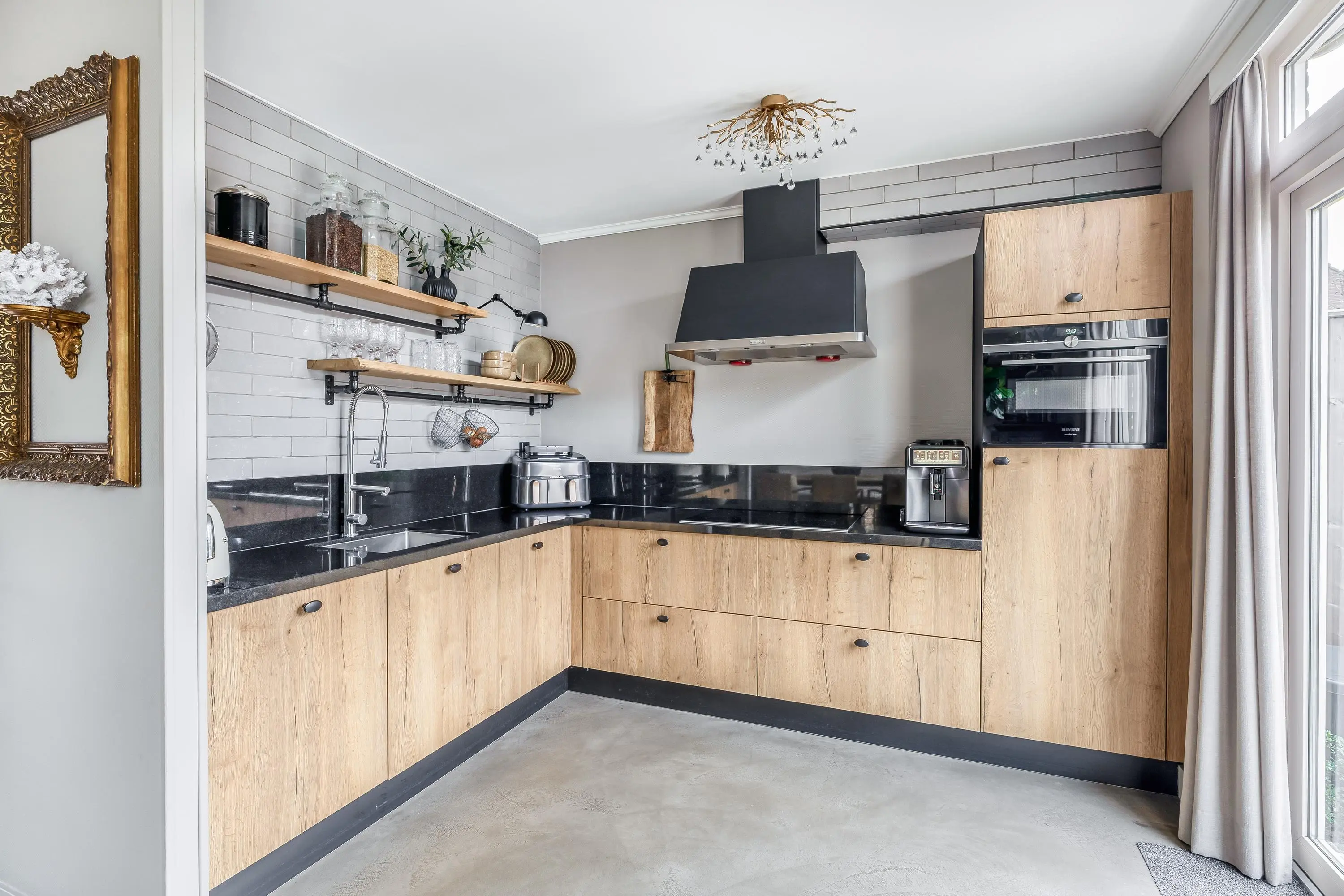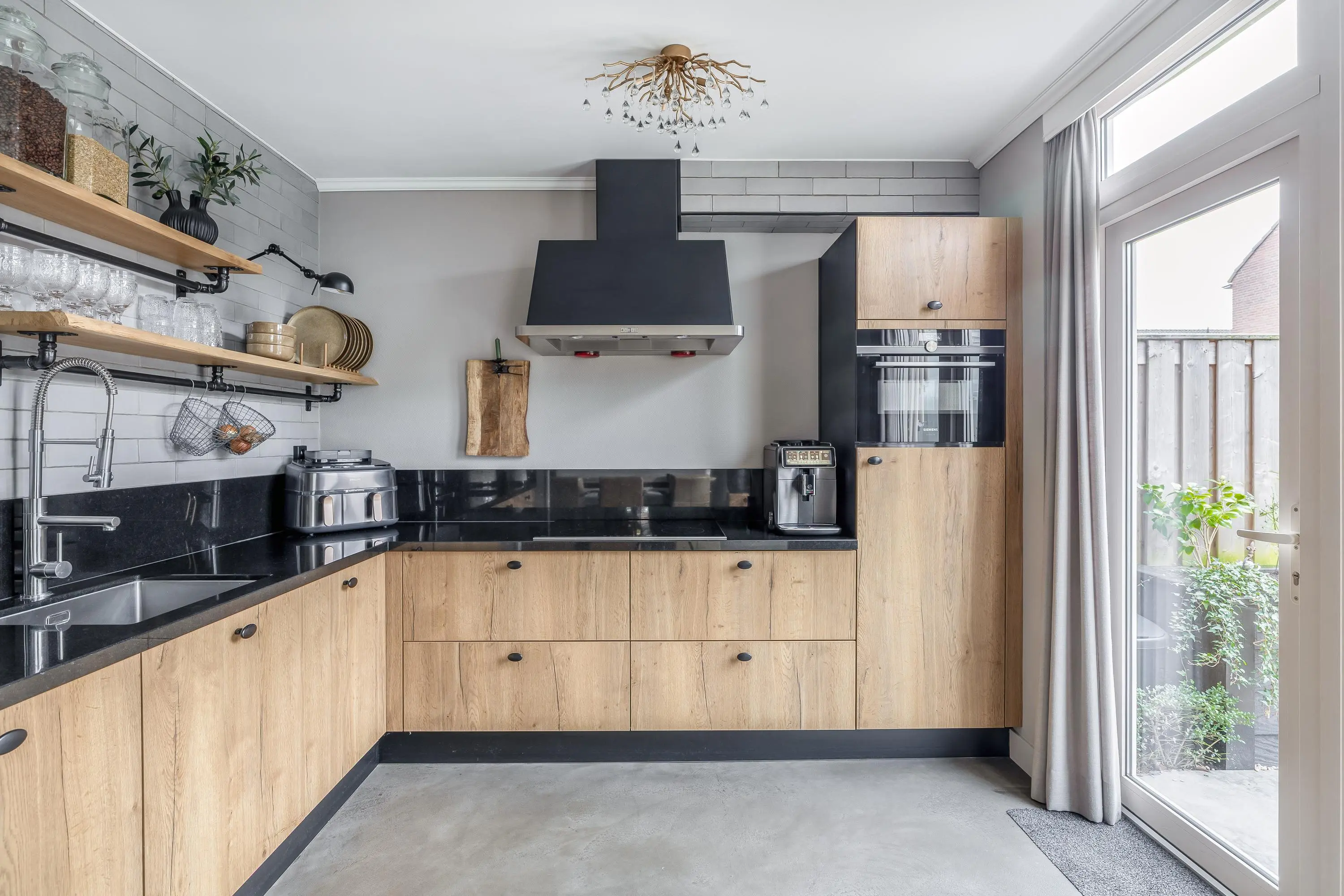 Aan de achterzijde bevindt zich de eethoek met directe toegang tot de tuin via een schuifpui, waardoor binnen en buiten mooi in elkaar overlopen. De moderne open keuken is opgesteld in een praktische L-vorm en uitgevoerd in een warme houtlook. De keuken is compleet uitgerust met een inductiekookplaat, afzuigkap, combi-oven, close-in boiler, vaatwasser en koelkast. Daarnaast is er ruim voldoende kastruimte aanwezig. Via een enkele deur is de achtertuin bereikbaar.