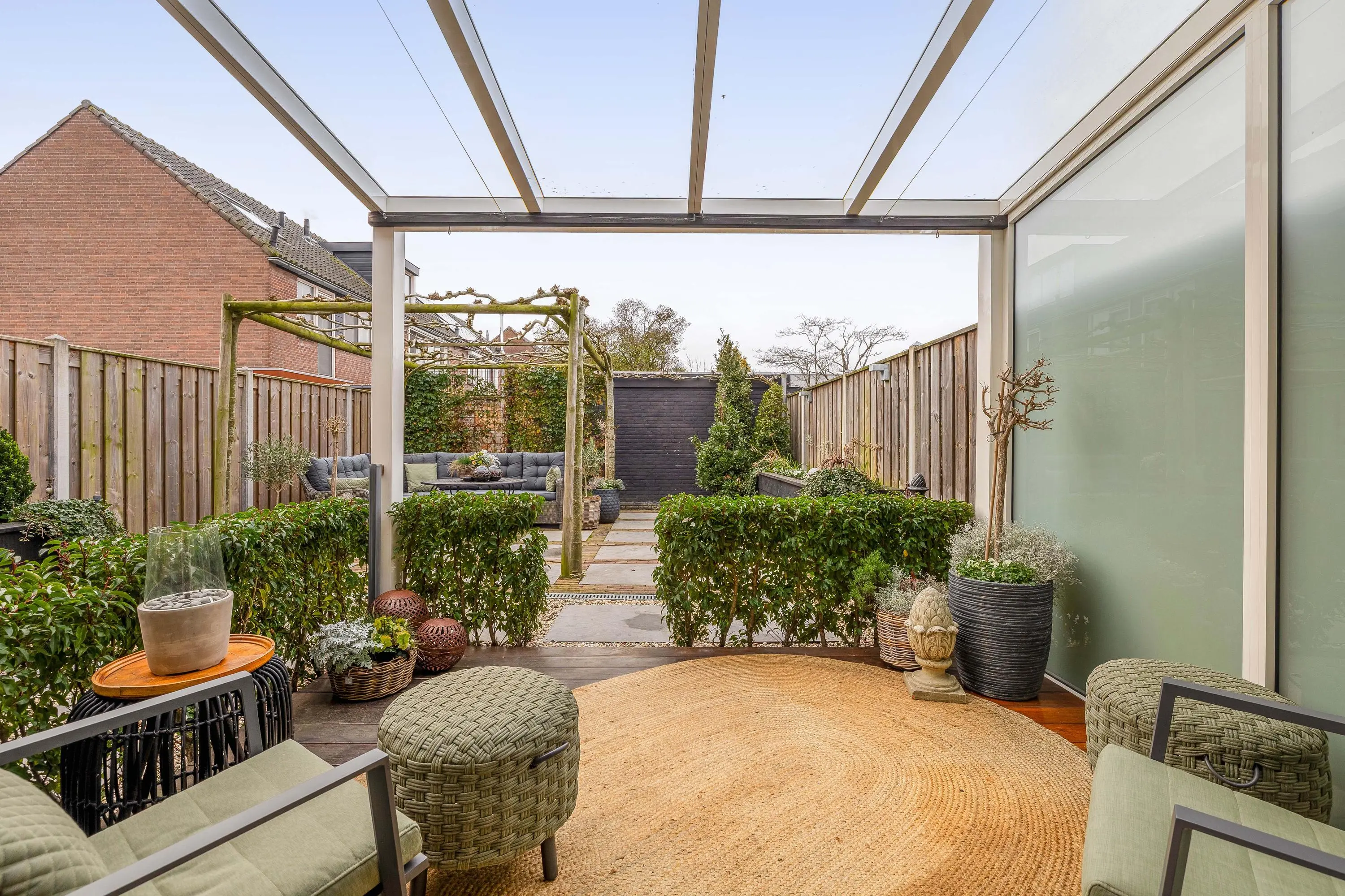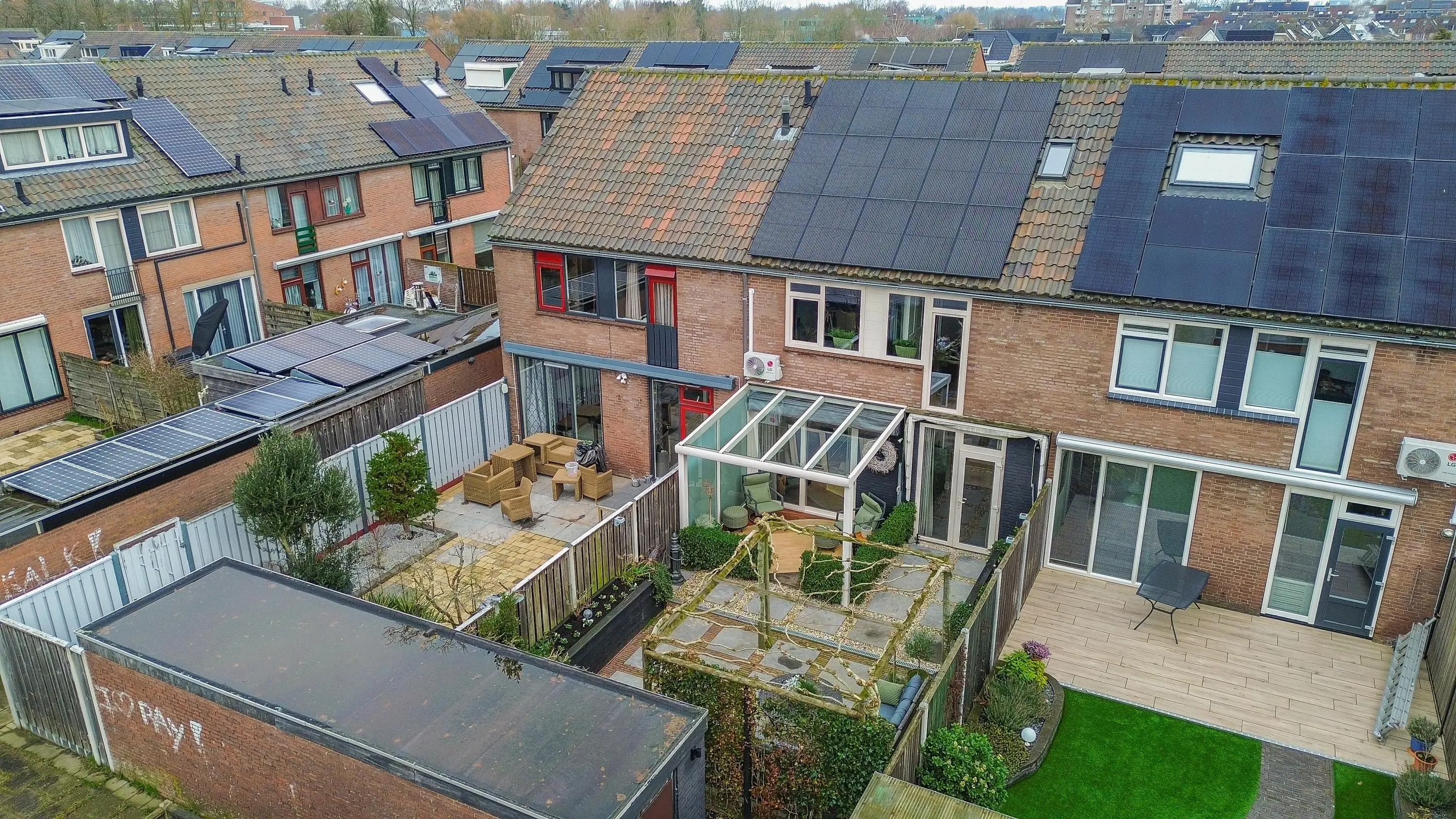 De achtertuin is een heerlijke plek om te ontspannen en is gunstig gelegen op het zuidwesten, waardoor u volop kunt genieten van de middag en avondzon. Direct aan de woning bevindt zich een sfeervolle overkapping die bereikbaar is via de schuifpui. Met de vlondervloer is dit een ideale plek voor een comfortabele loungehoek. De overkapping is voorzien van een verduisterend doek, zodat het hier ook op warme dagen aangenaam verblijven is. De omliggende hagen zorgen voor een knusse sfeer. Daarnaast is de achtergevel voorzien van een zonnescherm.