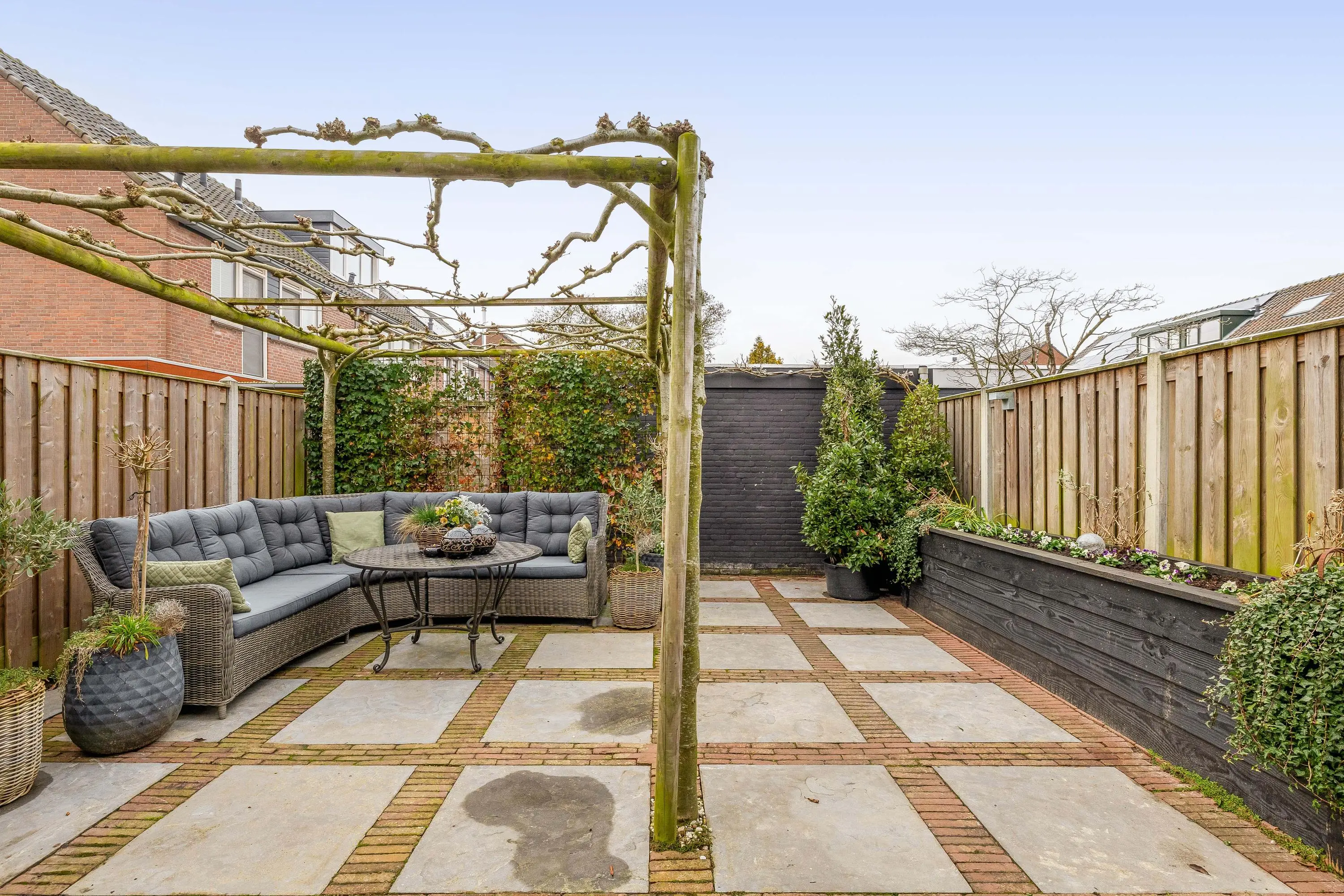 De tuin is speels ingericht met een combinatie van bestrating en kiezelstenen. Achterin de tuin is onder een pergola een gezellige zitplek gerealiseerd. Plantenbakken en een trellisscherm met groene beplanting zorgen voor extra sfeer. Helemaal achterin bevindt zich een praktische stenen berging van circa 8m², voorzien van elektra. De tuin is tevens bereikbaar via een achterom.