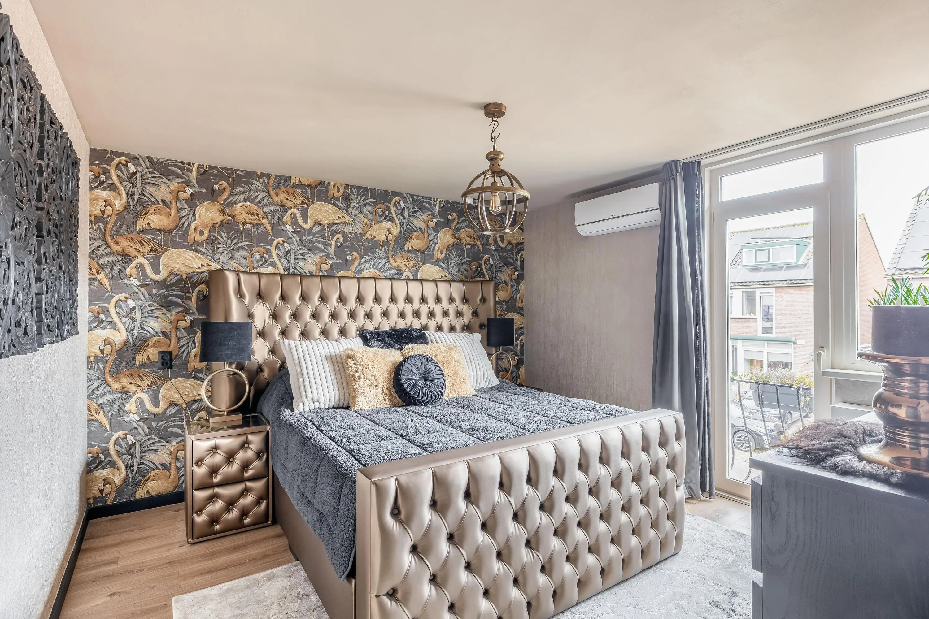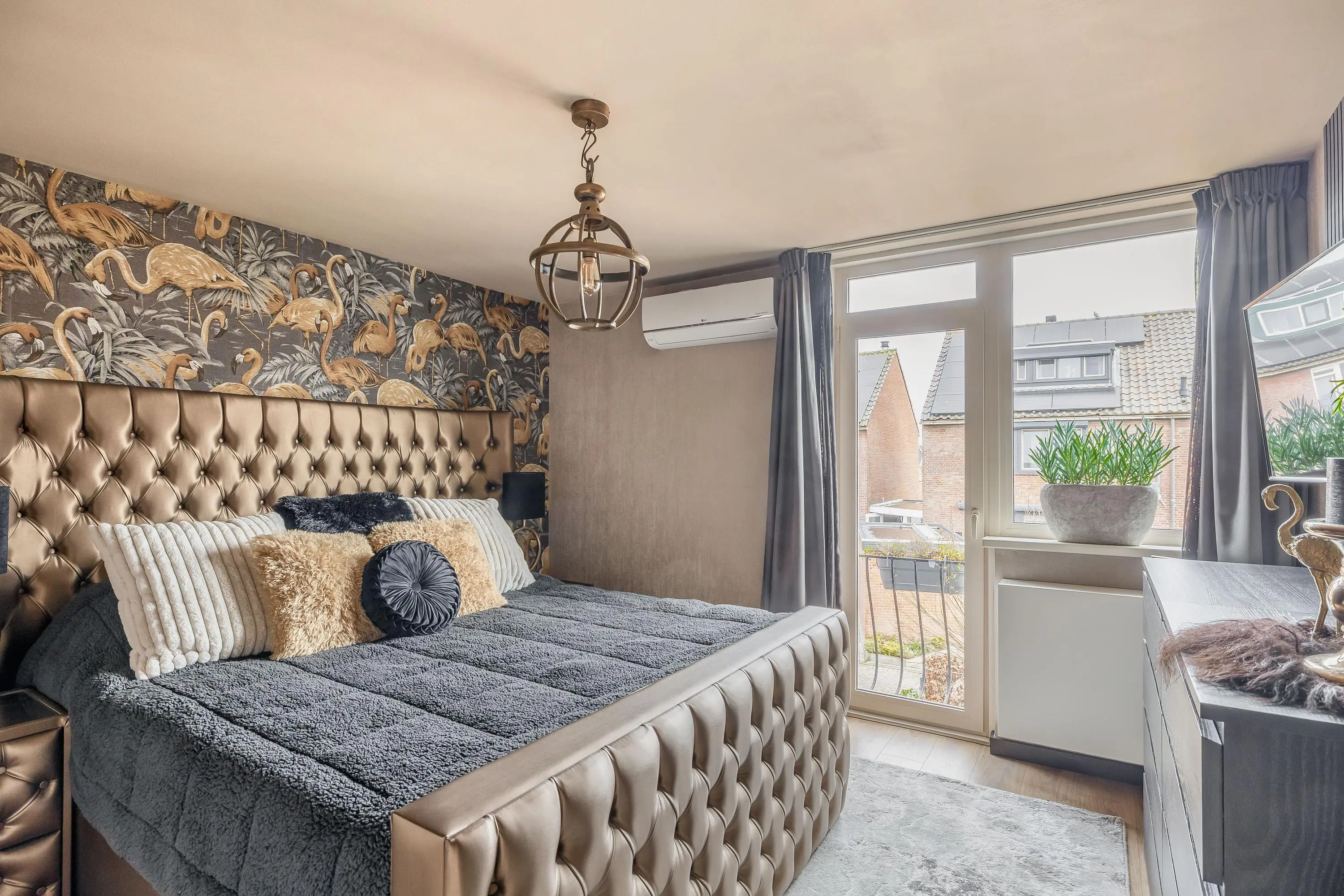 De hoofdslaapkamer ligt aan de voorzijde van de woning en heeft een oppervlakte van circa 14,5m². Deze kamer beschikt over airconditioning en een charmant Frans balkon, wat zorgt voor extra licht en een prettig gevoel van ruimte.