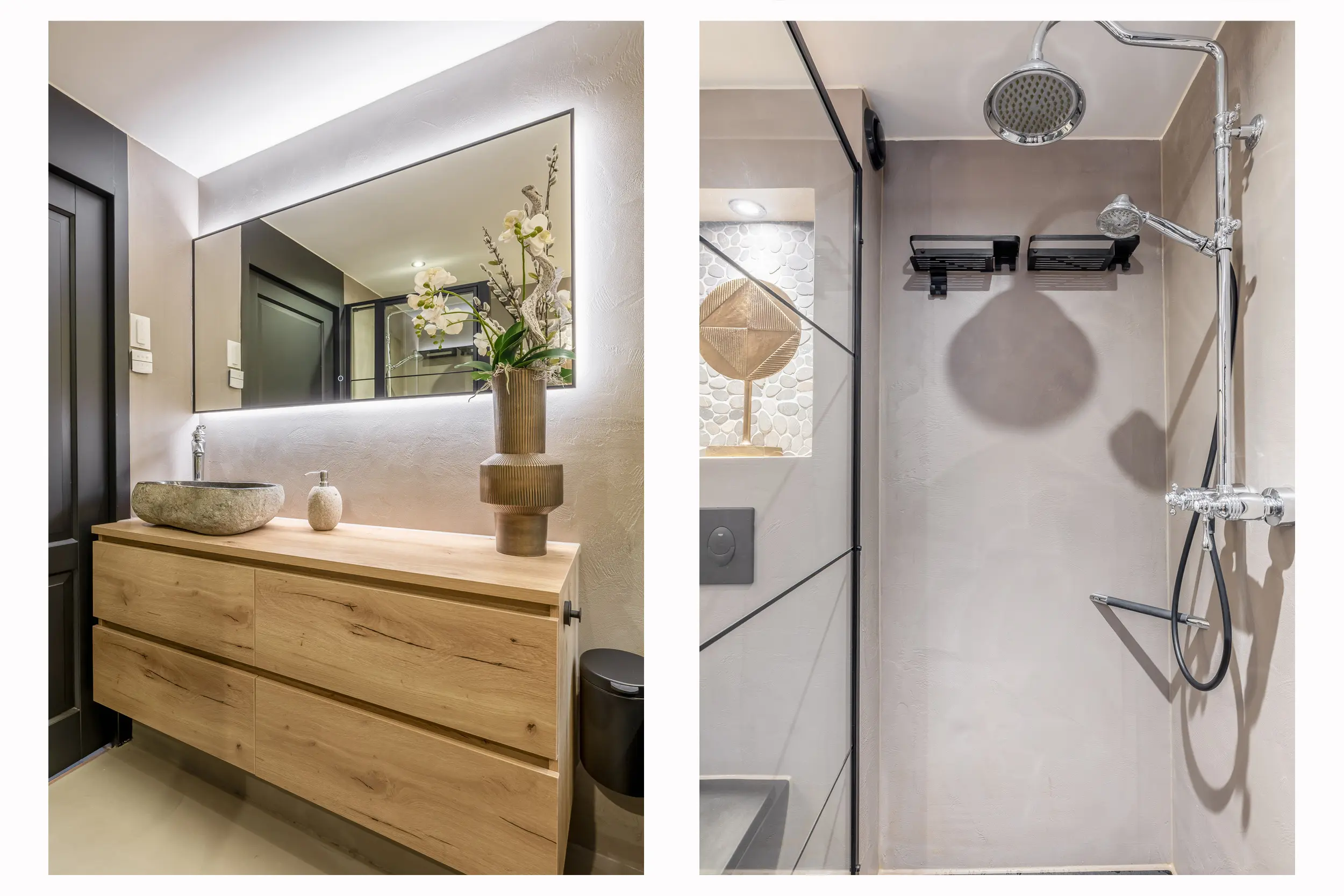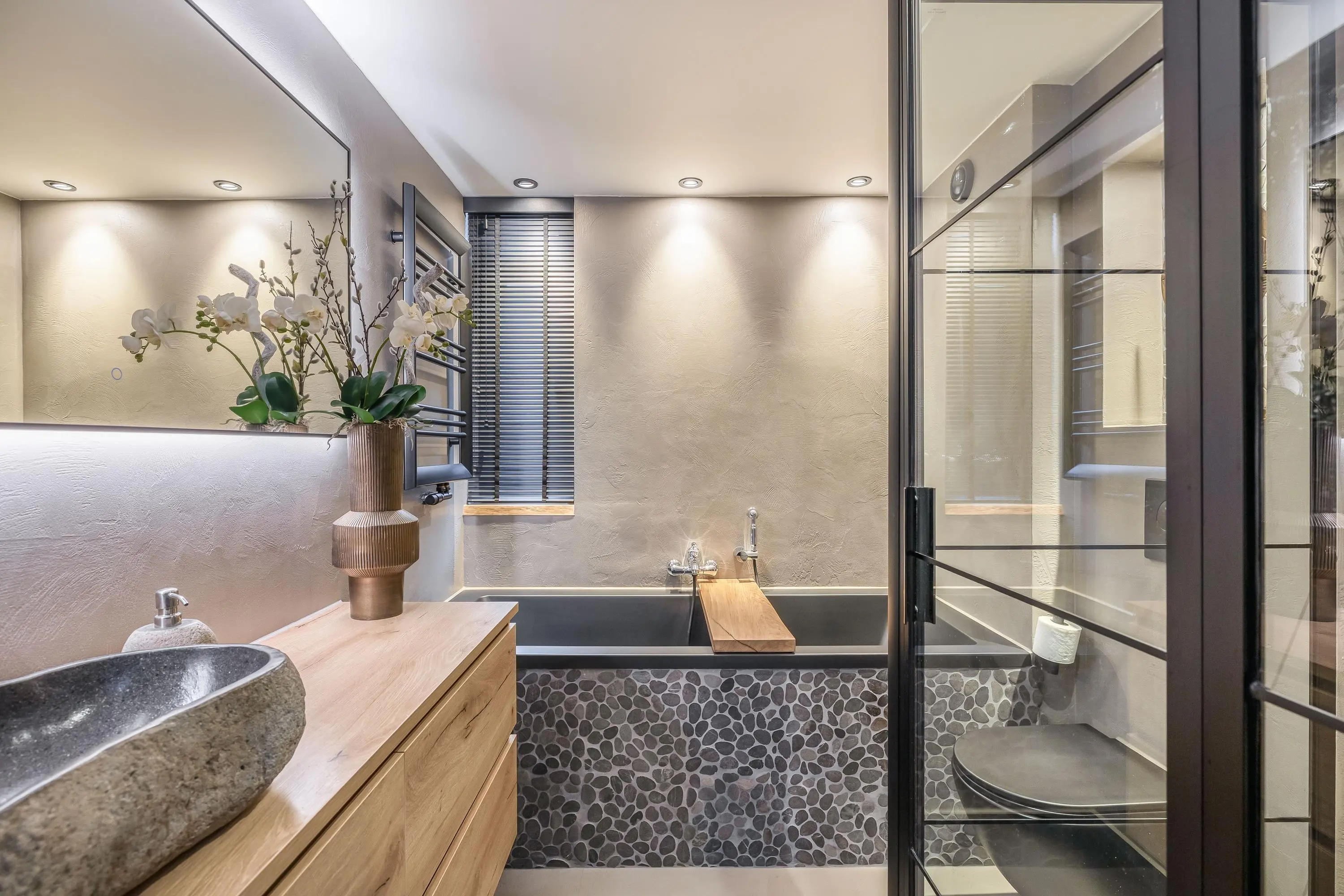 De moderne badkamer is geplaatst in 2021 en is tot in detail verzorgd afgewerkt met een eigentijdse uitstraling. De ruimte beschikt over een douche, ligbad, toilet en een wastafelmeubel met verwarmde en dimbare spiegel. Daarnaast is er een designradiator aanwezig. Ingebouwde spotjes zorgen voor sfeervolle verlichting. Het draaikiepraam biedt natuurlijke ventilatie, naast de aanwezige mechanische ventilatie.