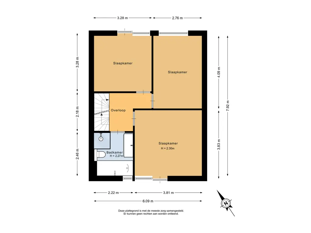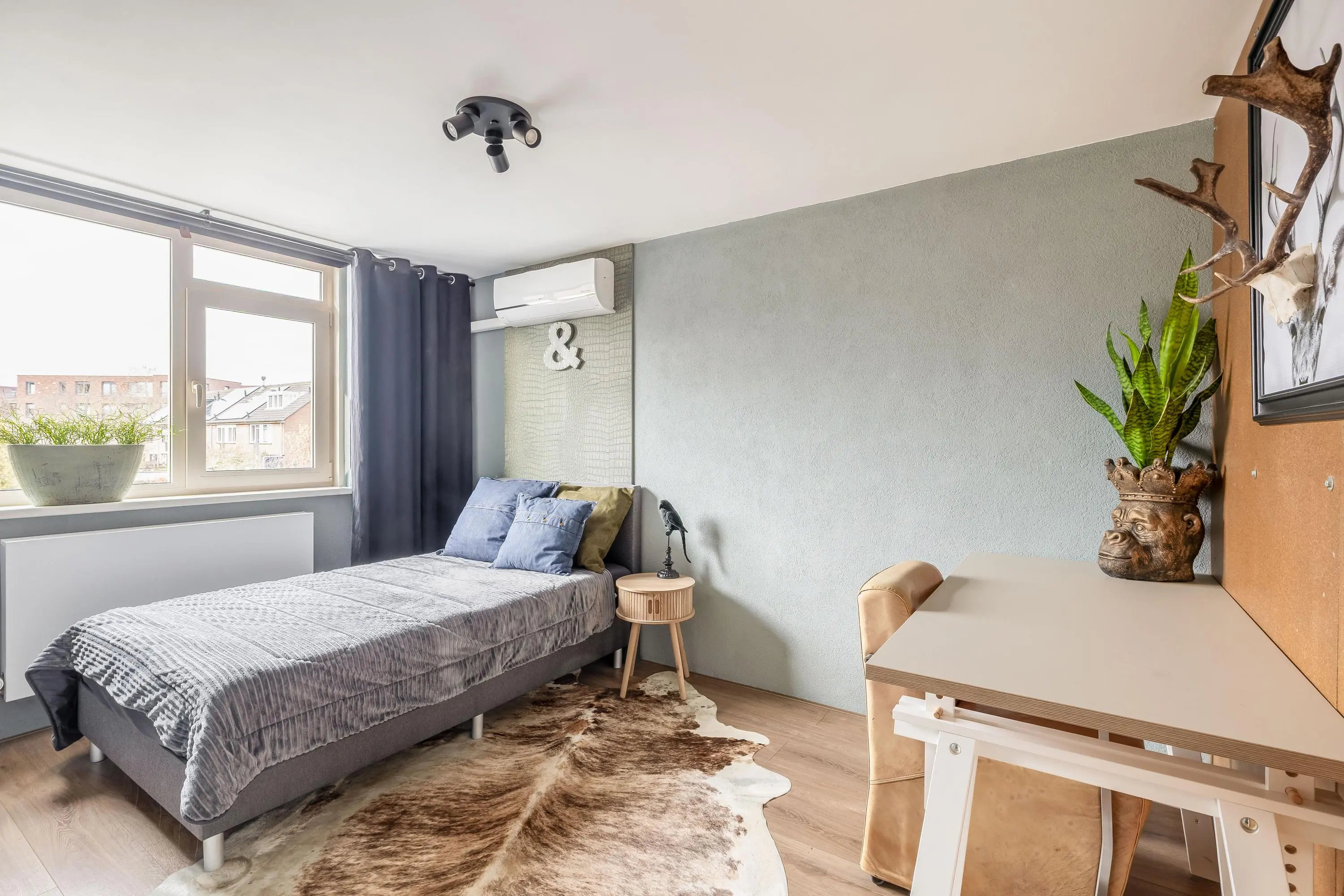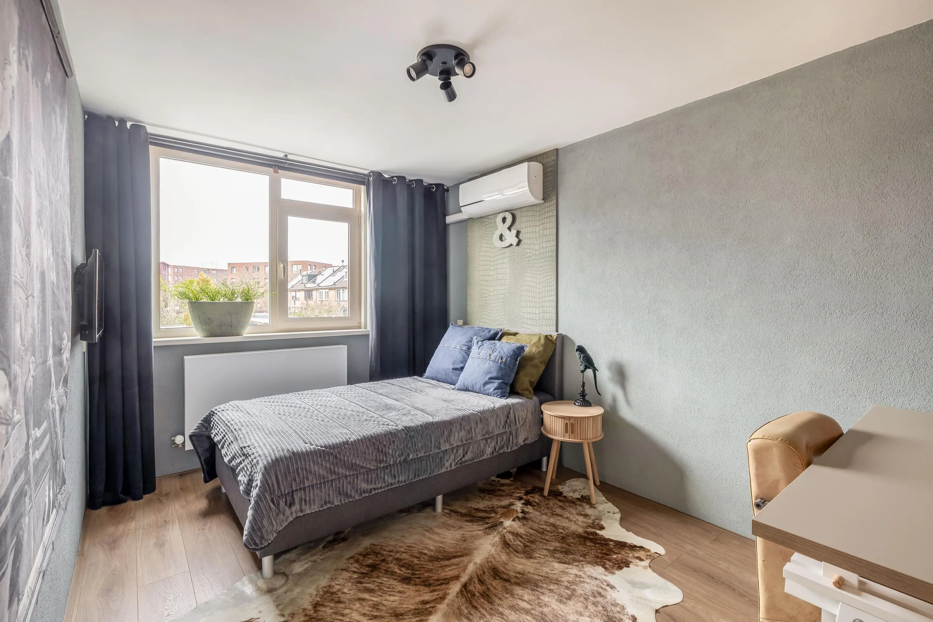 Aan de achterzijde bevinden zich de tweede en derde slaapkamer. De tweede kamer van circa 11m² wordt momenteel gebruikt als inloopkast, maar is uiteraard ook uitstekend geschikt als slaapkamer of werkkamer. De derde slaapkamer meet circa 10,5m² en is eveneens voorzien van airconditioning.