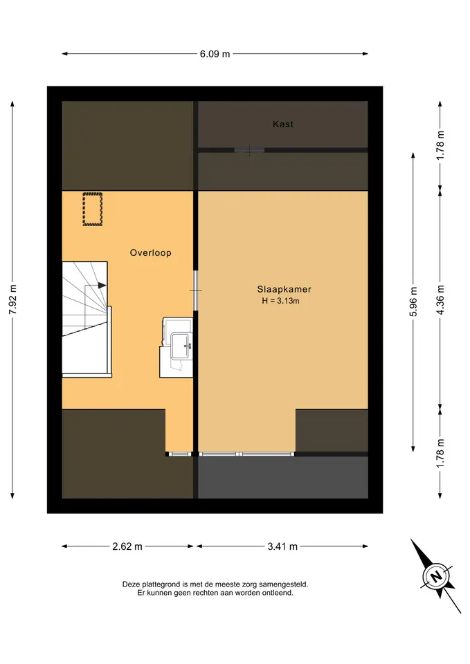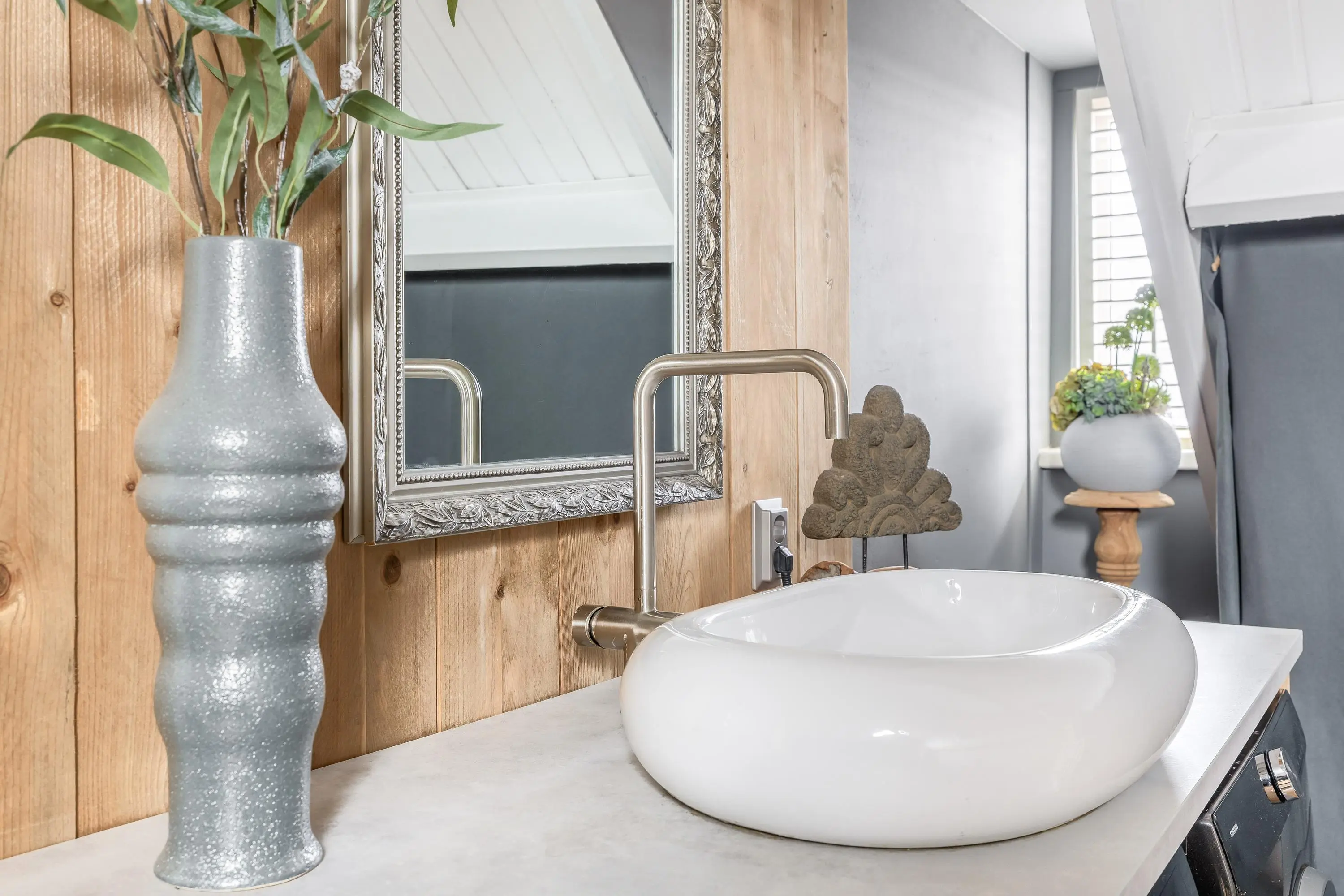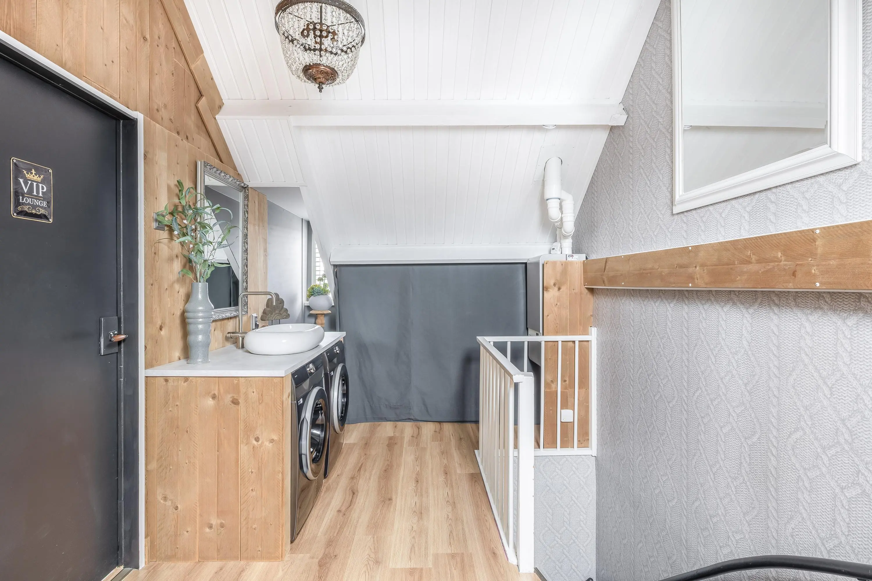 De overloop is eveneens afgewerkt met een nette laminaatvloer die doorloopt in de slaapkamer. Hier bevinden zich de aansluitingen voor de wasmachine en droger, evenals de cv-opstelling en de mechanische ventilatie. De wasruimte is netjes weggewerkt met een praktische houten ombouw en voorzien van een spoelbak. Dankzij het dakraam is er prettig daglicht op de overloop.