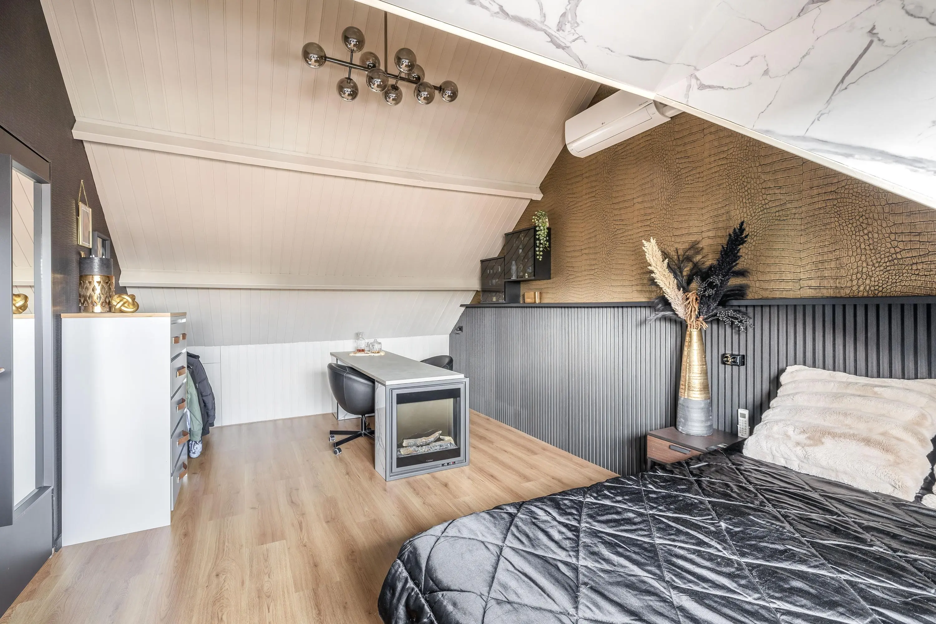 De slaapkamer heeft een oppervlakte van circa 15m² en is vergroot met een dakkapel aan de voorzijde. Hierdoor is extra ruimte en een fijne lichtinval gecreëerd. Achter de knieschotten is praktische bergruimte aanwezig. Ook deze kamer beschikt over airconditioning, wat zorgt voor extra comfort.