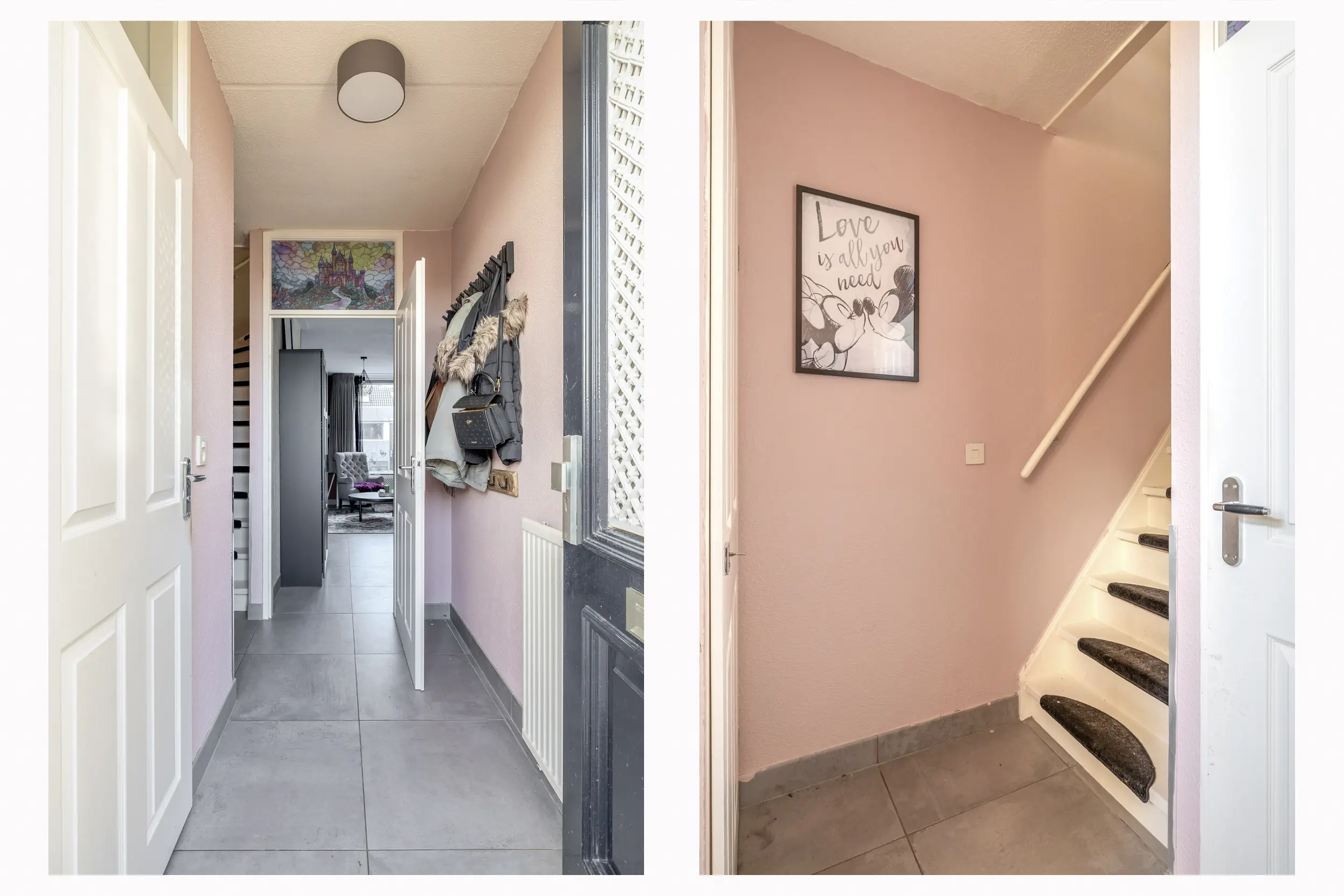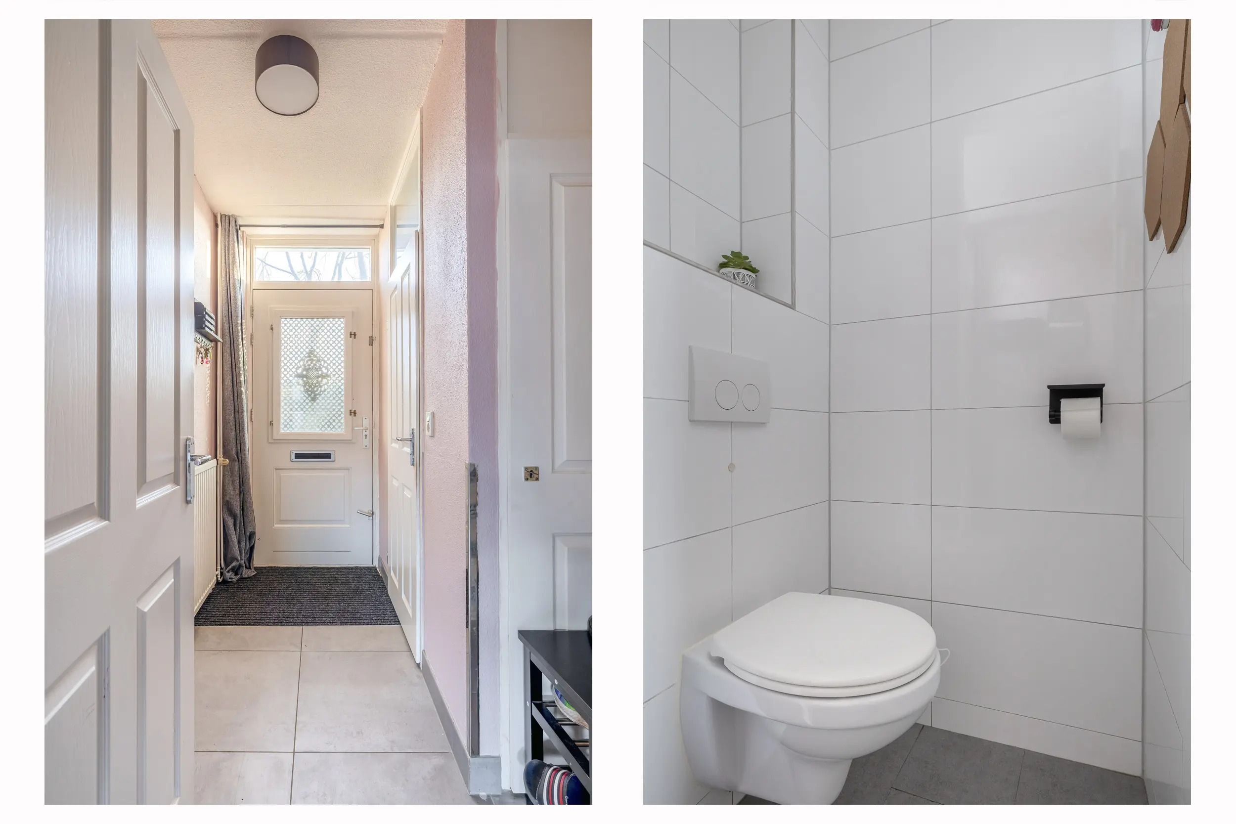 De entree/hal is voorzien van een plavuizen vloer met vloerverwarming, die doorloopt over de gehele begane grond. In de hal bevinden zich de meterkast, het separate toilet en de trapopgang naar de eerste verdieping.