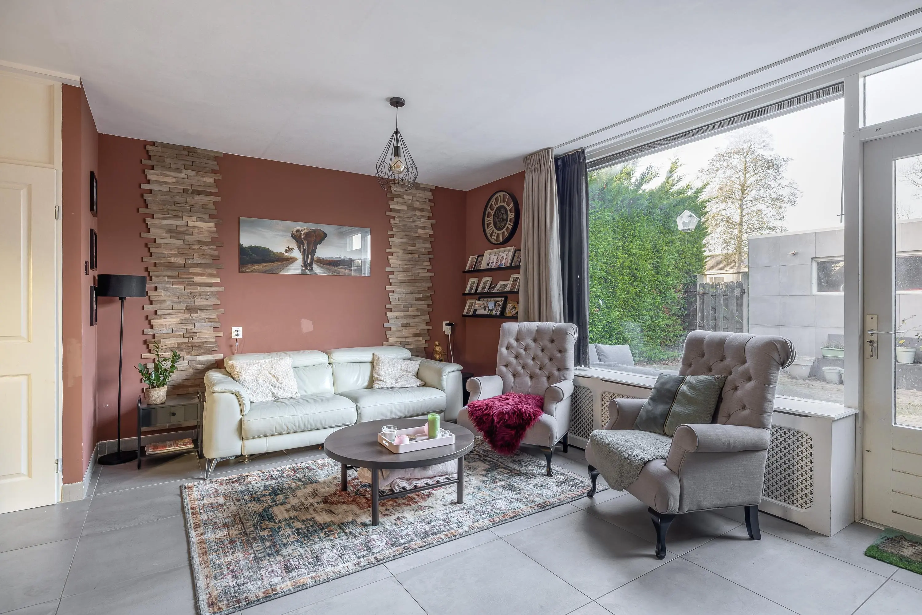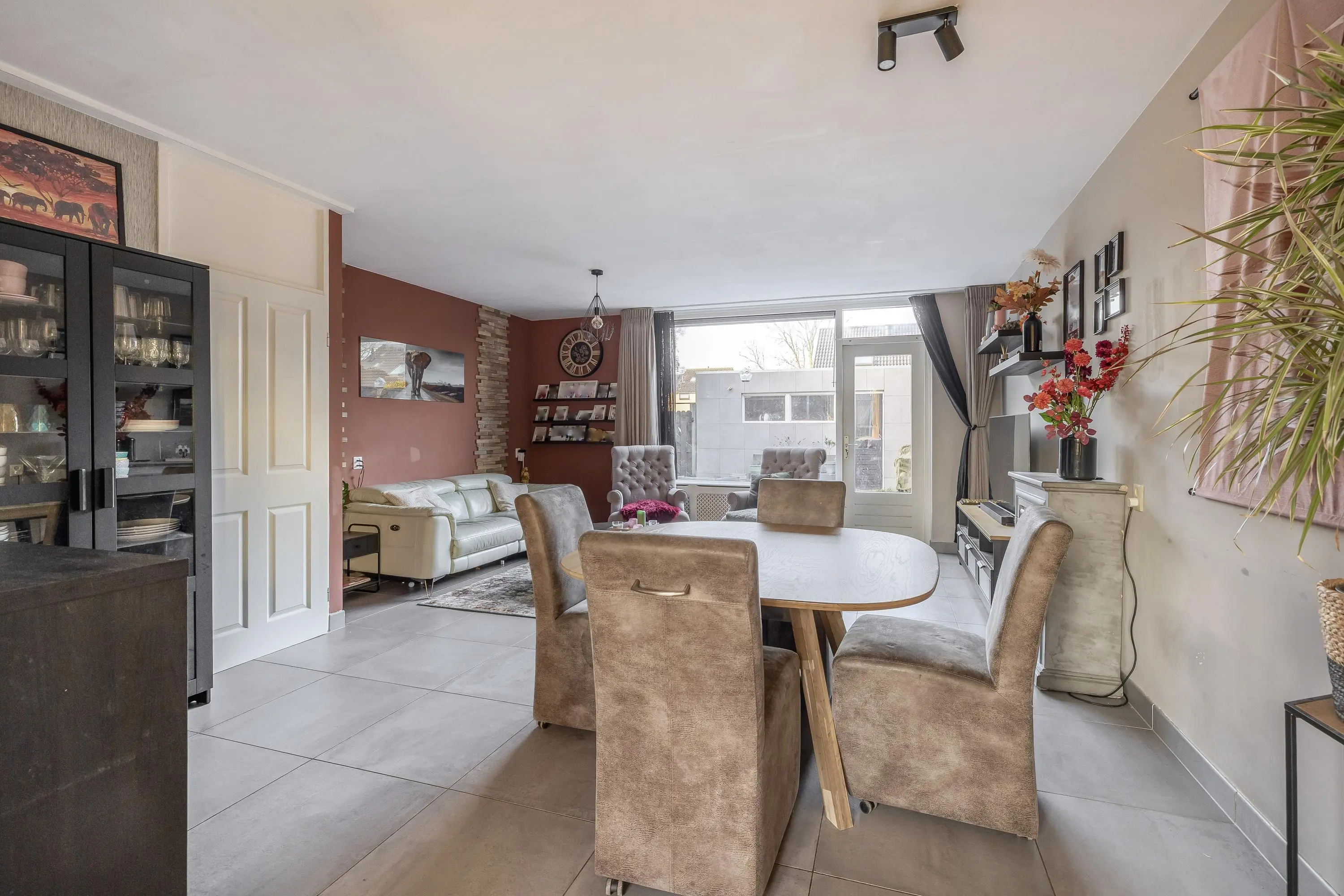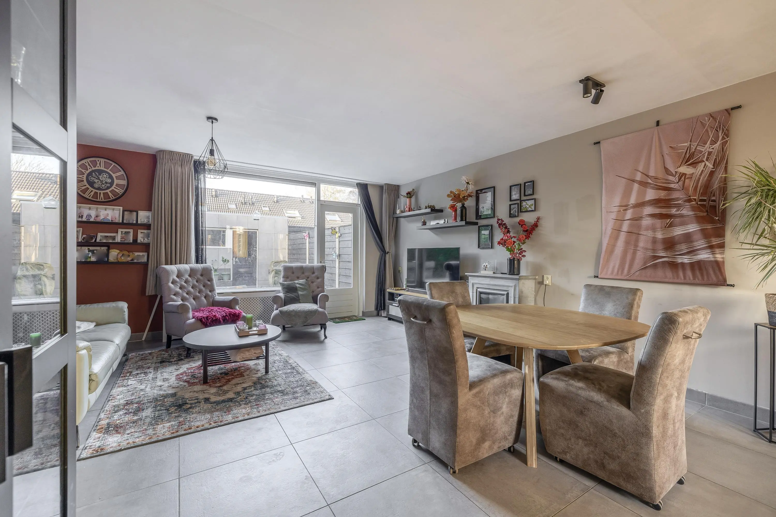 De leefruimte is royaal van opzet en geniet van veel natuurlijk daglicht. Het grote raam aan de achterzijde is voorzien van een zonnescherm, zodat u de hoeveelheid daglicht naar wens kunt aanpassen. In de living vindt u tevens een praktische provisiekast. Het woongedeelte biedt voldoende ruimte voor een comfortabele zithoek, terwijl er dankzij de indeling ook plek is voor een gezellige eettafel. Vanuit de woonkamer is er via een enkele deur direct toegang tot de ruime achtertuin.