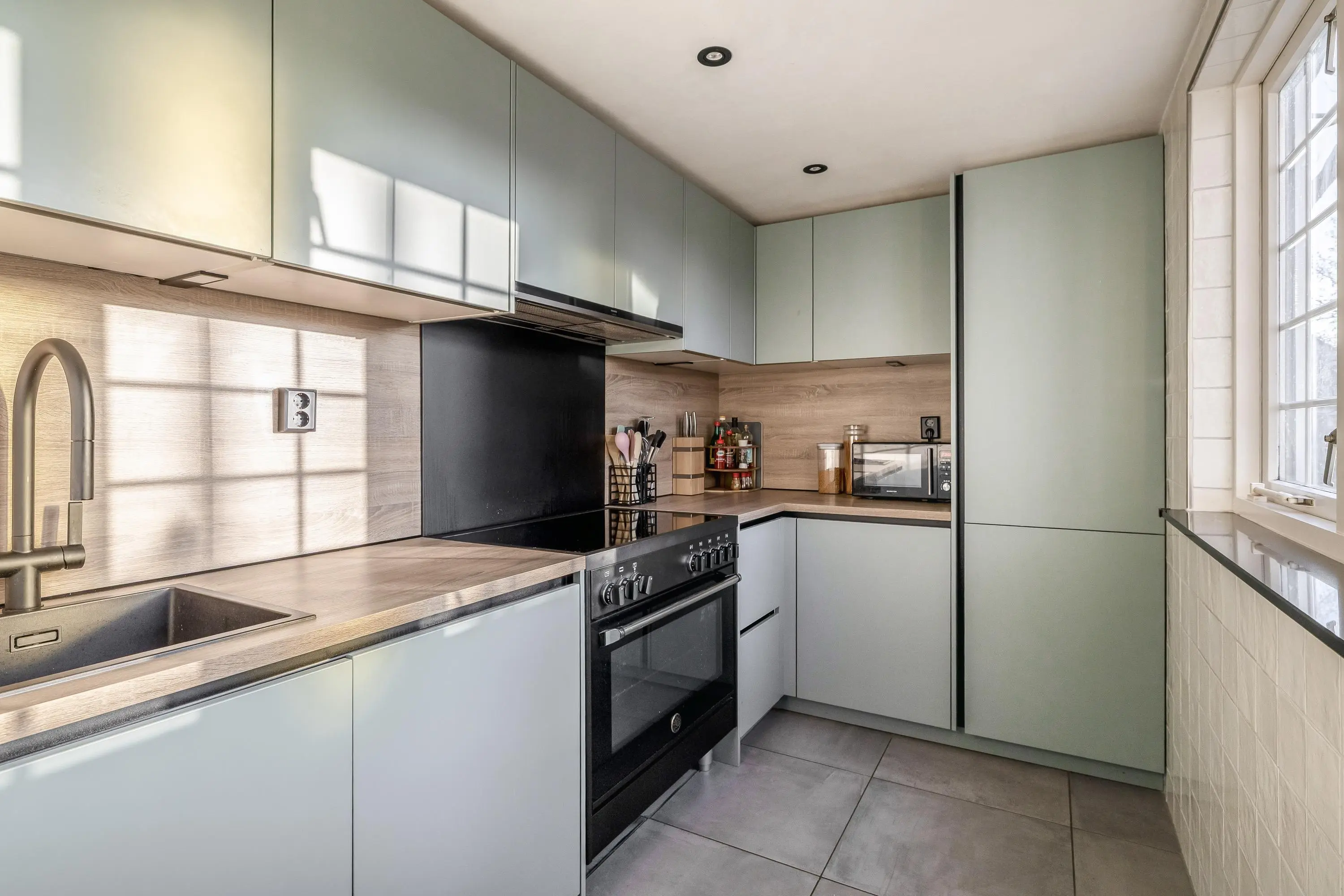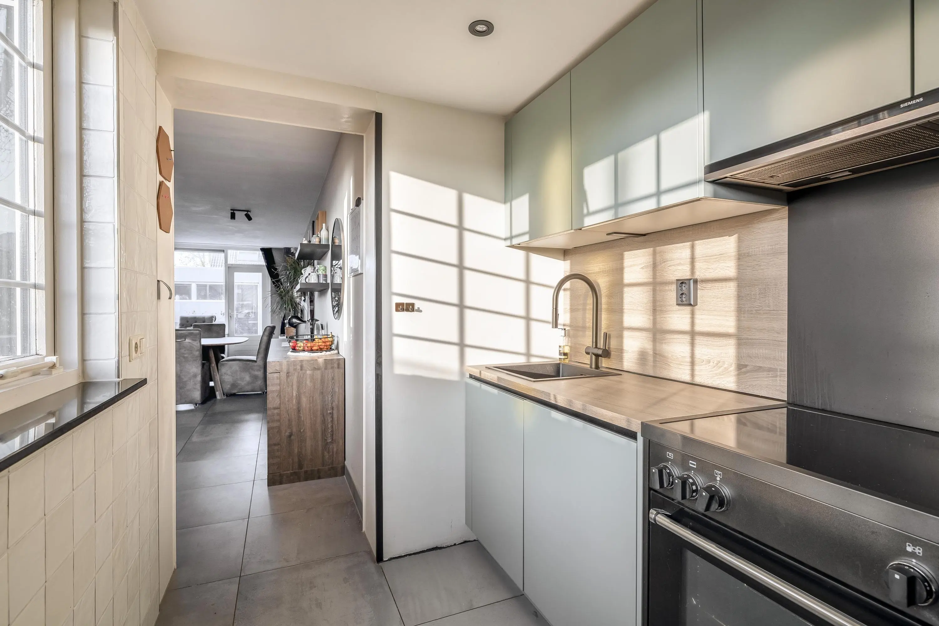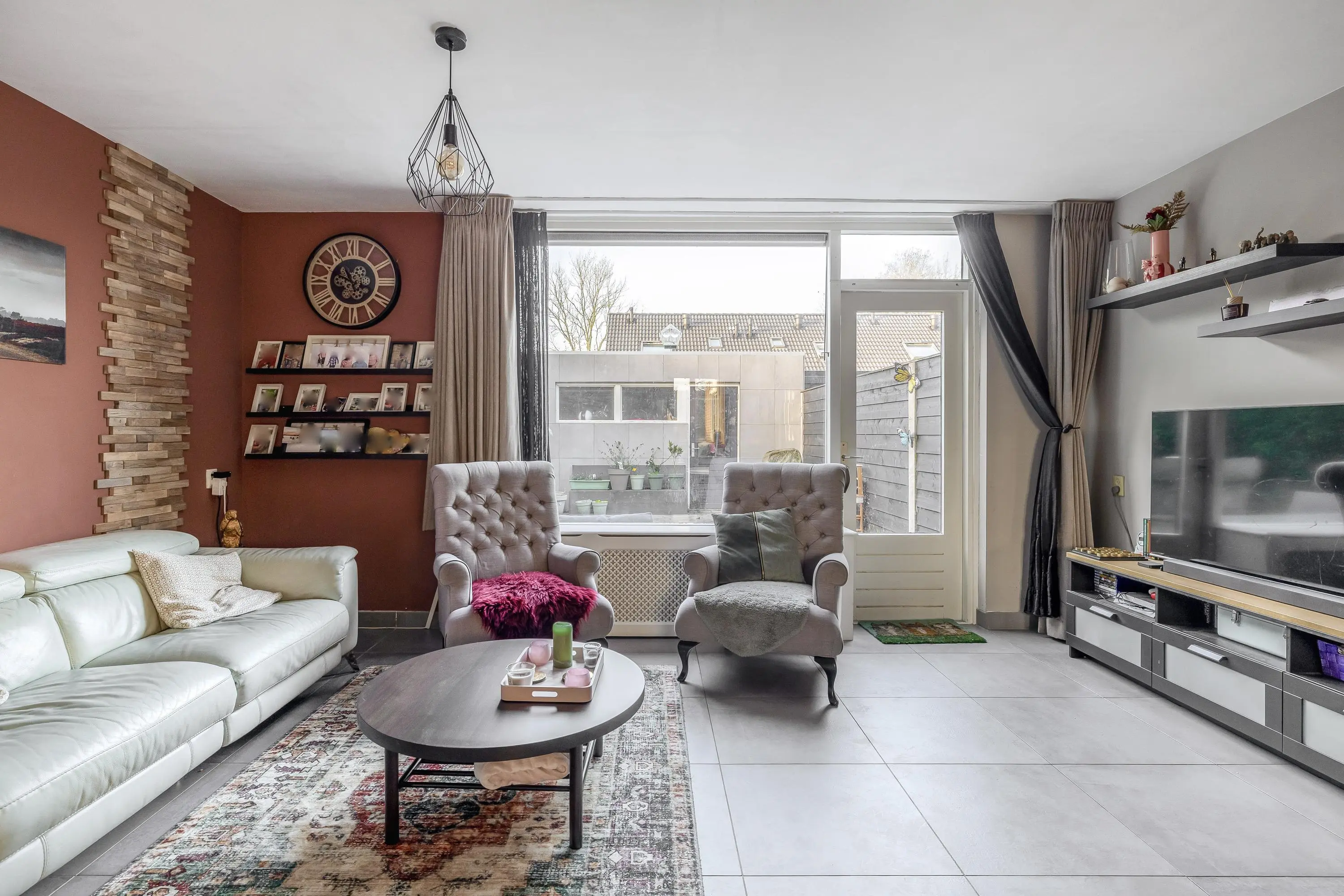 De leefruimte is royaal van opzet en geniet van veel natuurlijk daglicht. Het grote raam aan de achterzijde is voorzien van een zonnescherm, zodat u de hoeveelheid daglicht naar wens kunt aanpassen. In de living vindt u tevens een praktische provisiekast. Het woongedeelte biedt voldoende ruimte voor een comfortabele zithoek, terwijl er dankzij de indeling ook plek is voor een gezellige eettafel. Vanuit de woonkamer is er via een enkele deur direct toegang tot de ruime achtertuin.