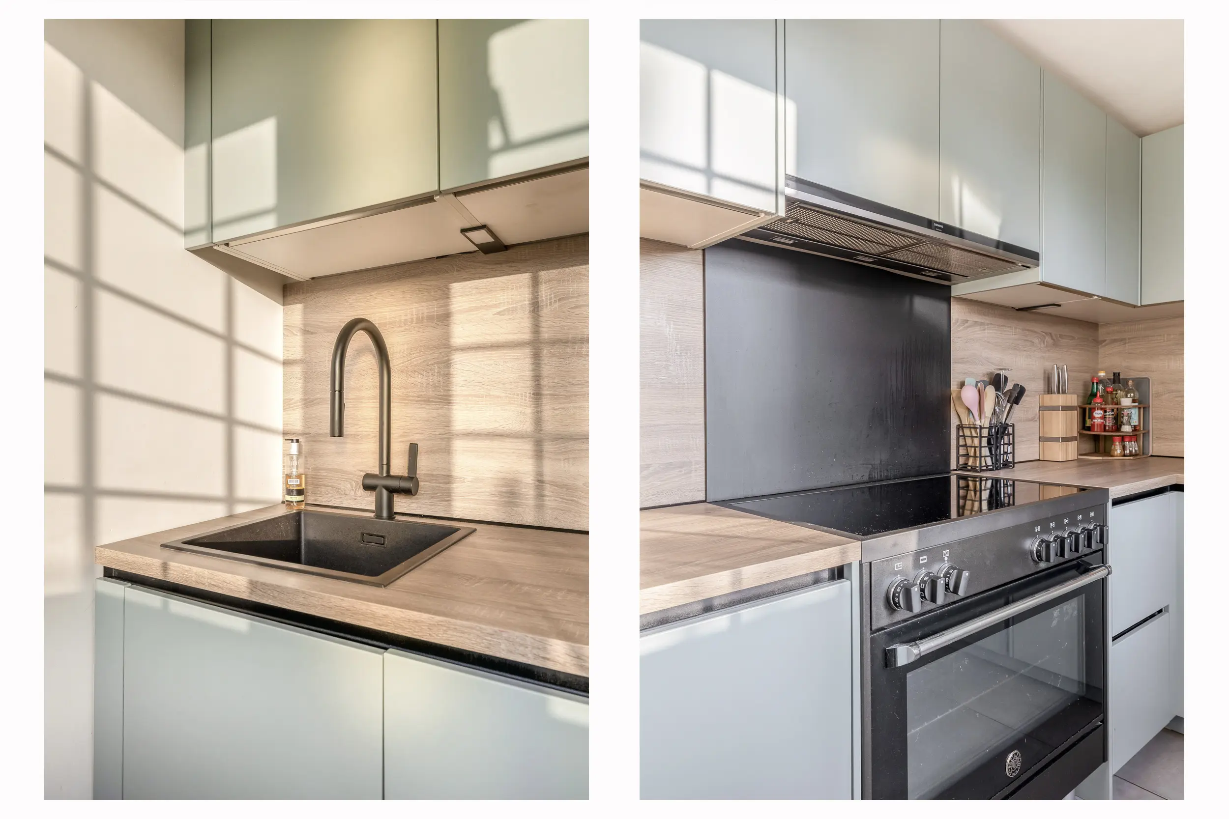De moderne keuken, geplaatst in 2023, is compleet uitgerust met een losstaand inductiefornuis met grote oven, afzuigkap, vaatwasser en een koel-/vriescombinatie.