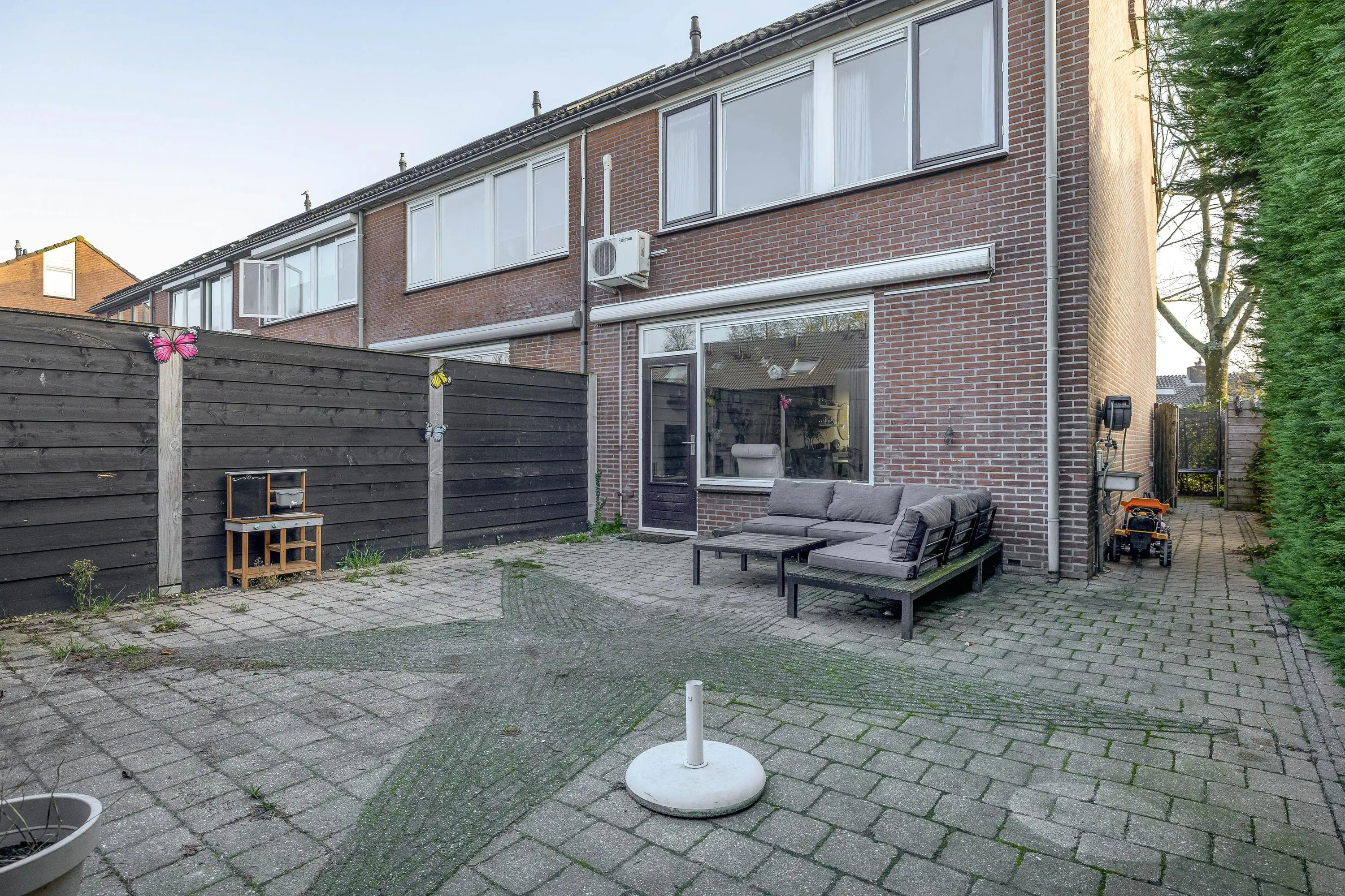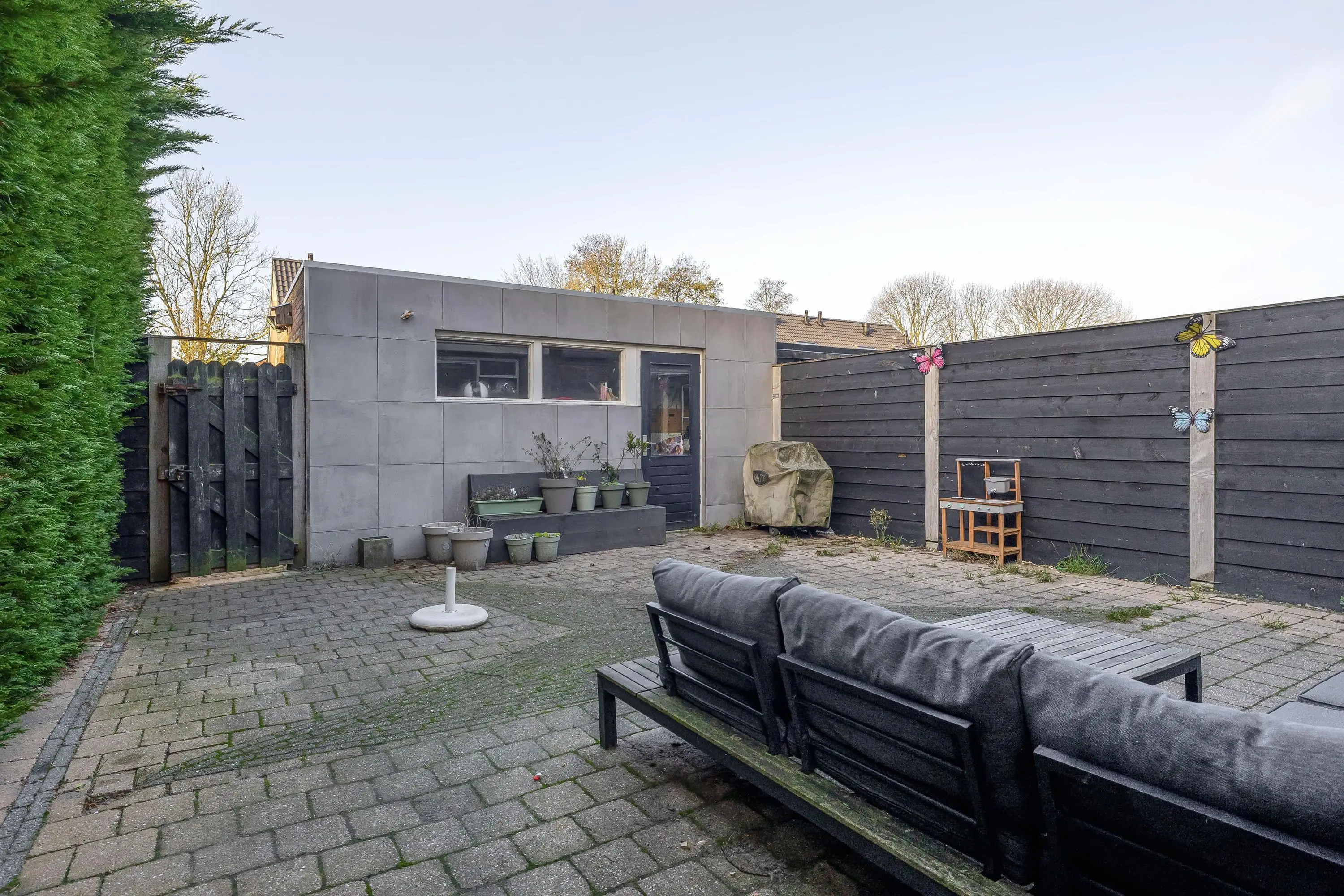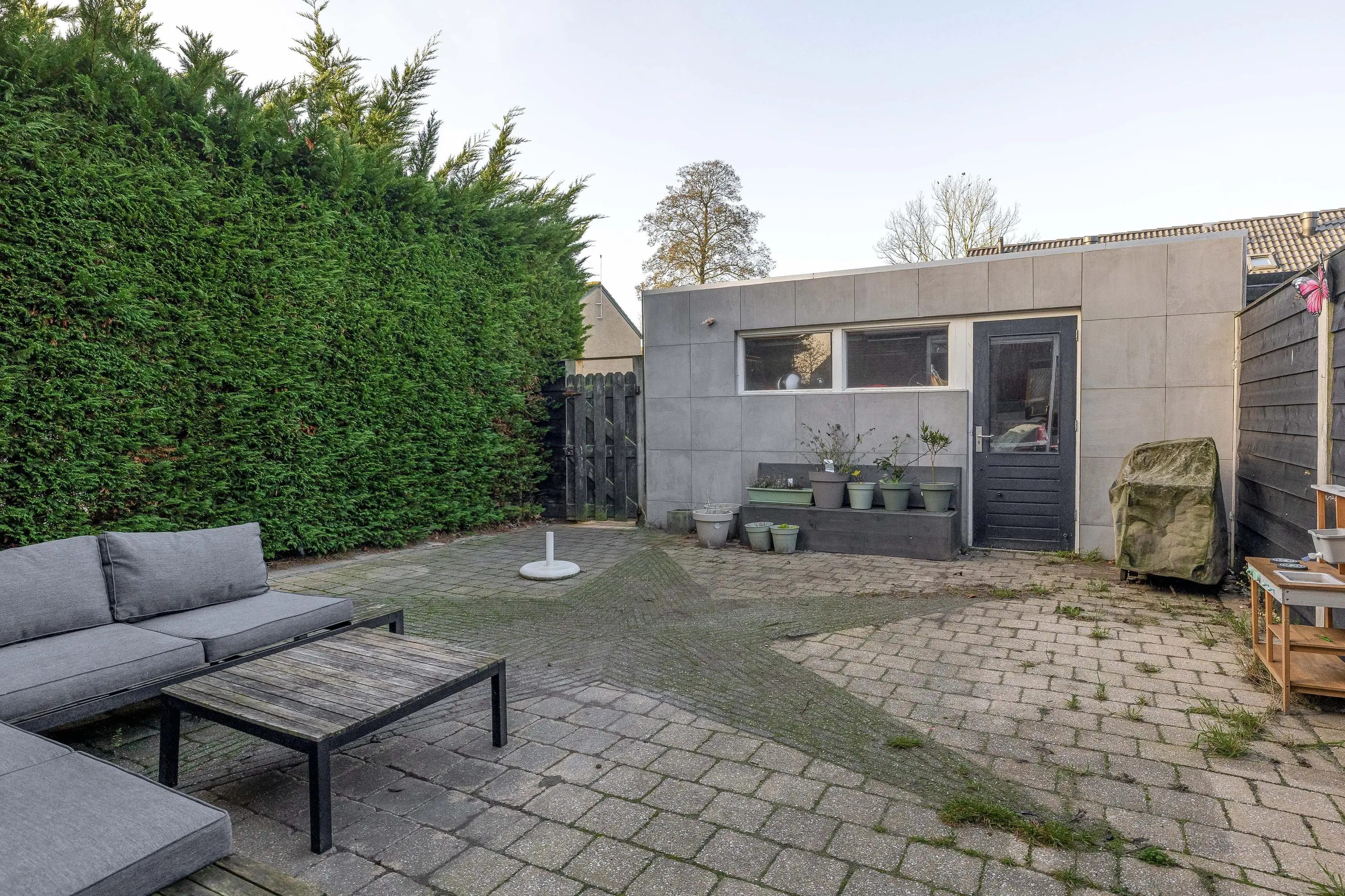 De achtertuin is volledig betegeld en aan één zijde afgescheiden door een groene heg, wat zorgt voor veel privacy. Dankzij de ruime opzet is er volop plek om een gezellige buitenruimte te creëren. De tuin beschikt bovendien over een praktische buitenkraan en is via een enkele deur direct verbonden met de garage. Daarnaast is de tuin bereikbaar via een achterom.