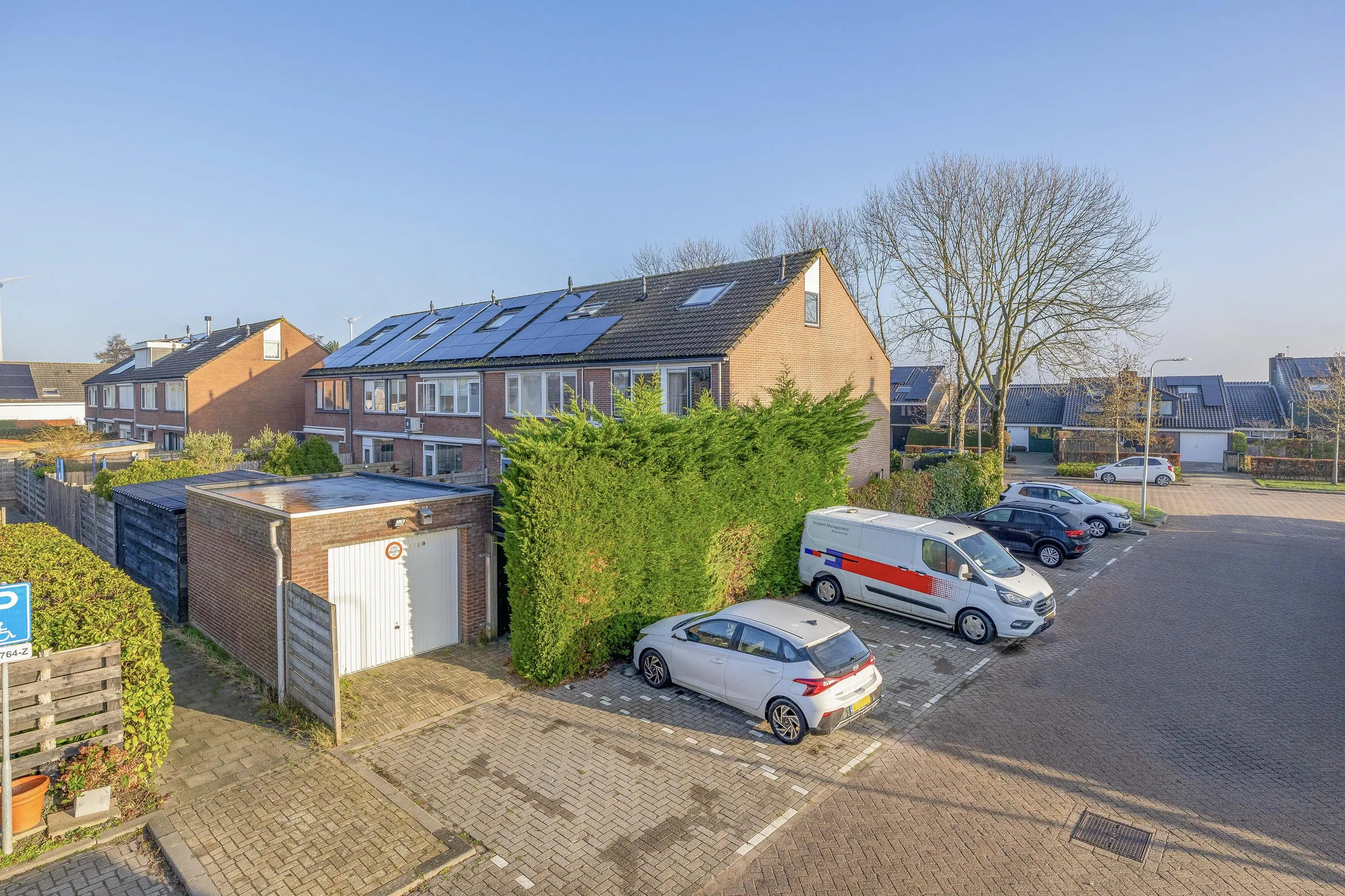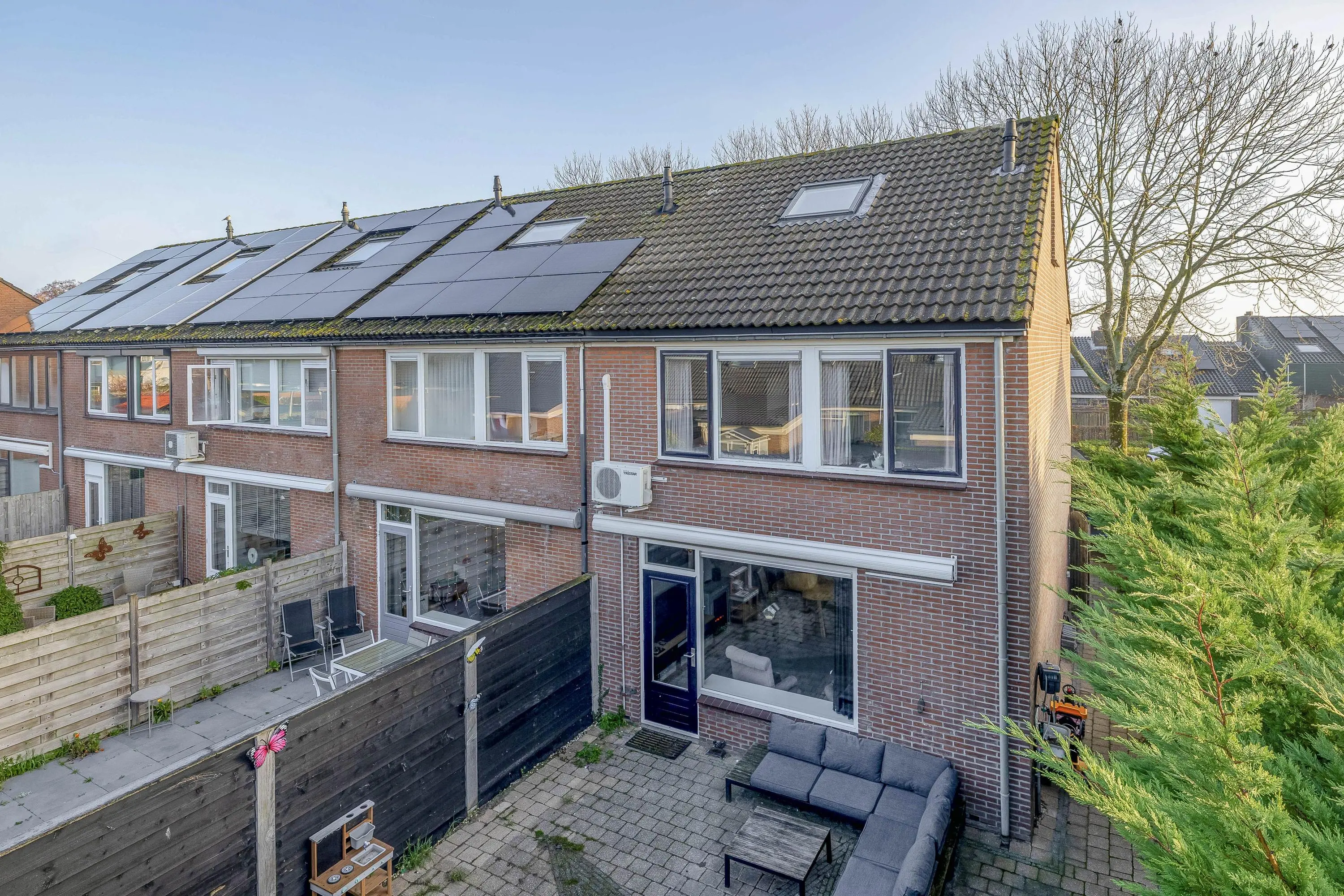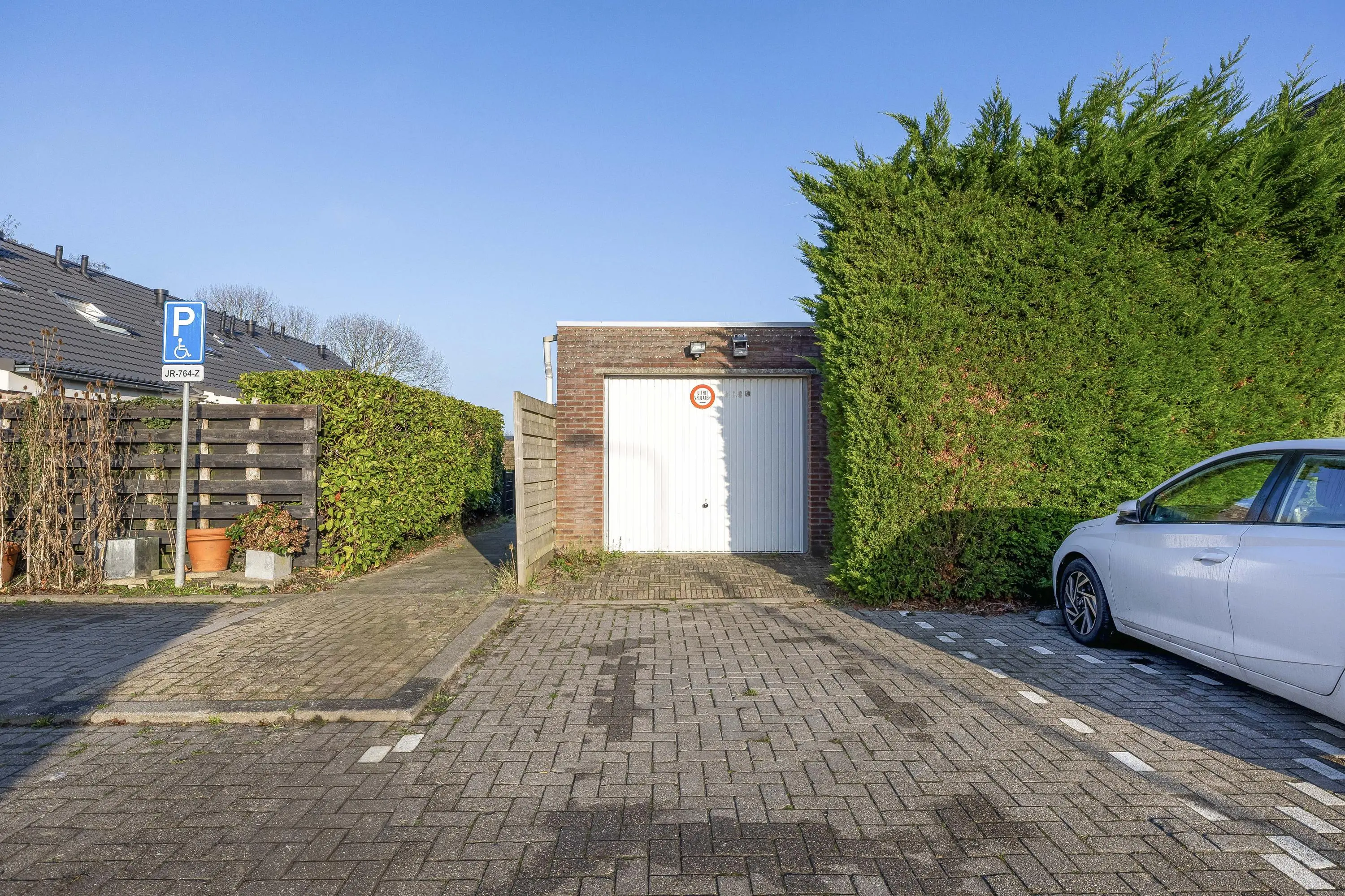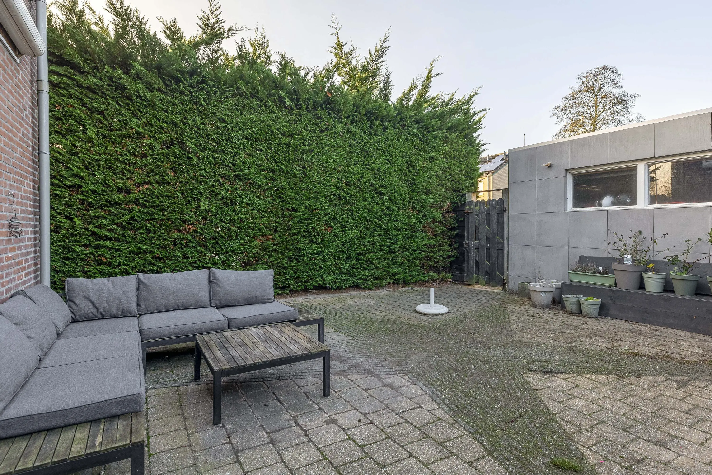 De achtertuin is volledig betegeld en aan één zijde afgescheiden door een groene heg, wat zorgt voor veel privacy. Dankzij de ruime opzet is er volop plek om een gezellige buitenruimte te creëren. De tuin beschikt bovendien over een praktische buitenkraan en is via een enkele deur direct verbonden met de garage. Daarnaast is de tuin bereikbaar via een achterom.