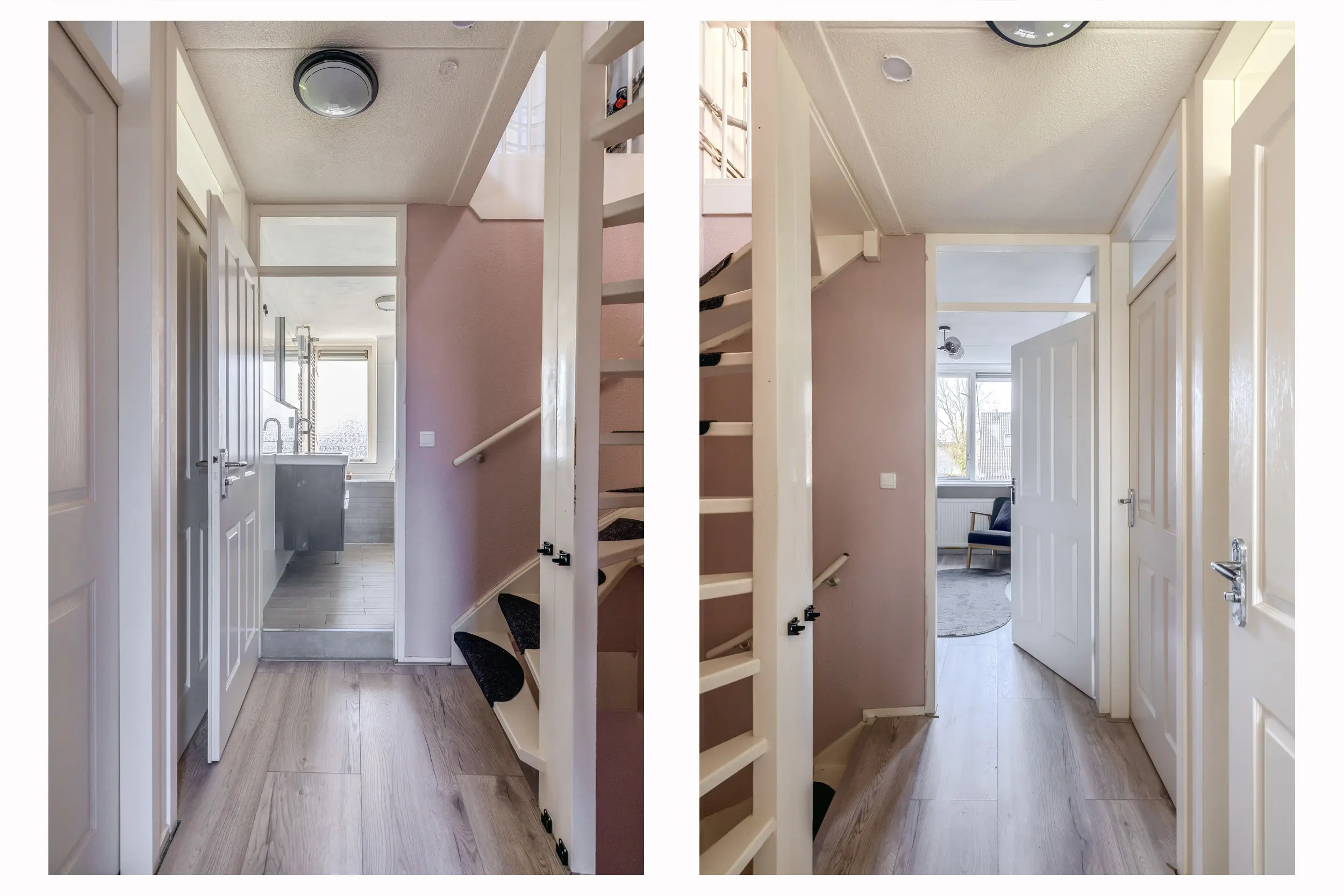 De overloop is voorzien van een nette laminaatvloer die doorloopt in beide slaapkamers. Vanaf de overloop heeft u toegang tot de twee slaapkamers en de badkamer.