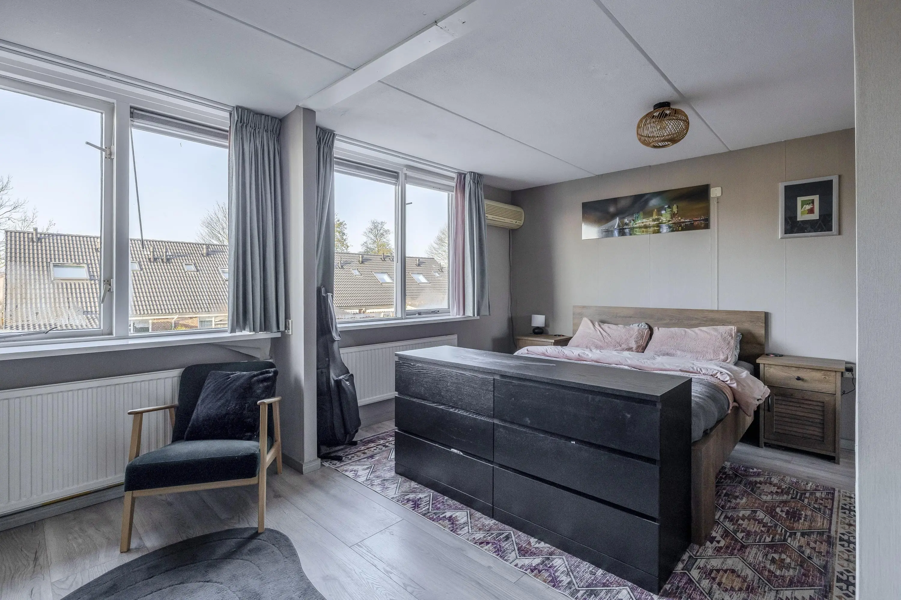 De hoofdslaapkamer, gelegen aan de achterzijde, heeft een oppervlakte van circa 22m². De kamer is voorzien van airconditioning en wordt aangenaam verlicht door de grote ramen. Oorspronkelijk bestond deze ruimte uit twee slaapkamers, waardoor het eenvoudig weer op te splitsen is in twee aparte kamers.