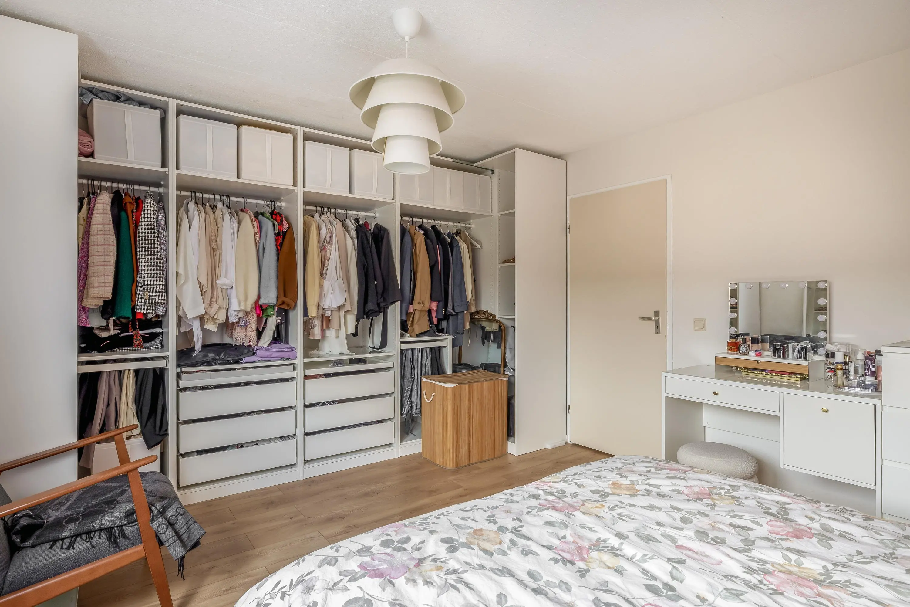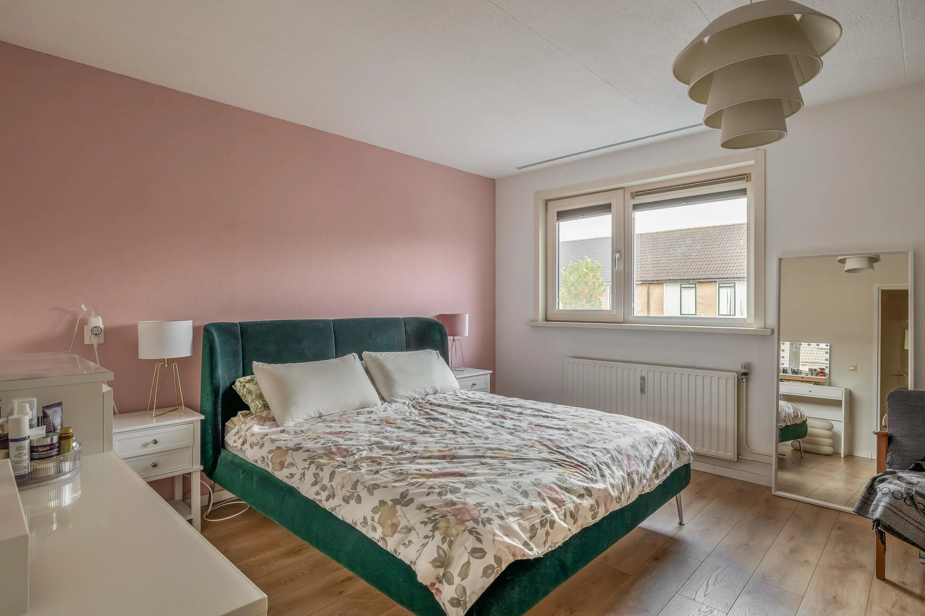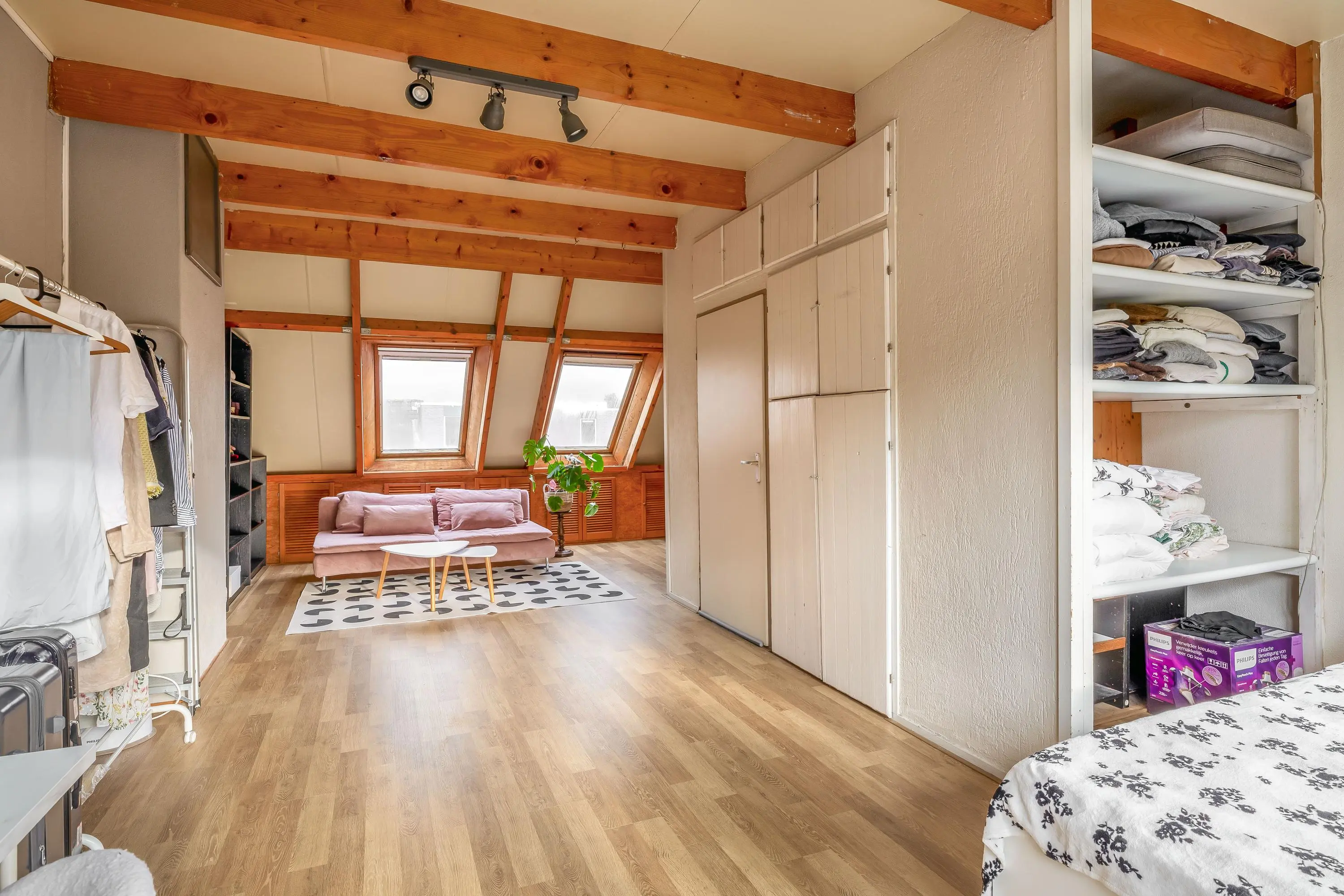 De opkomst op de tweede etage is op de overloop. De laatste slaapkamer is ook op deze etage te vinden. Een ruime kamer met aan de voorzijde 2 dakramen en aan de achterzijde een deur naar het balkon op het zuidoosten. Op het platte dak liggen zonnepanelen. Wat een fijn familiehuis!