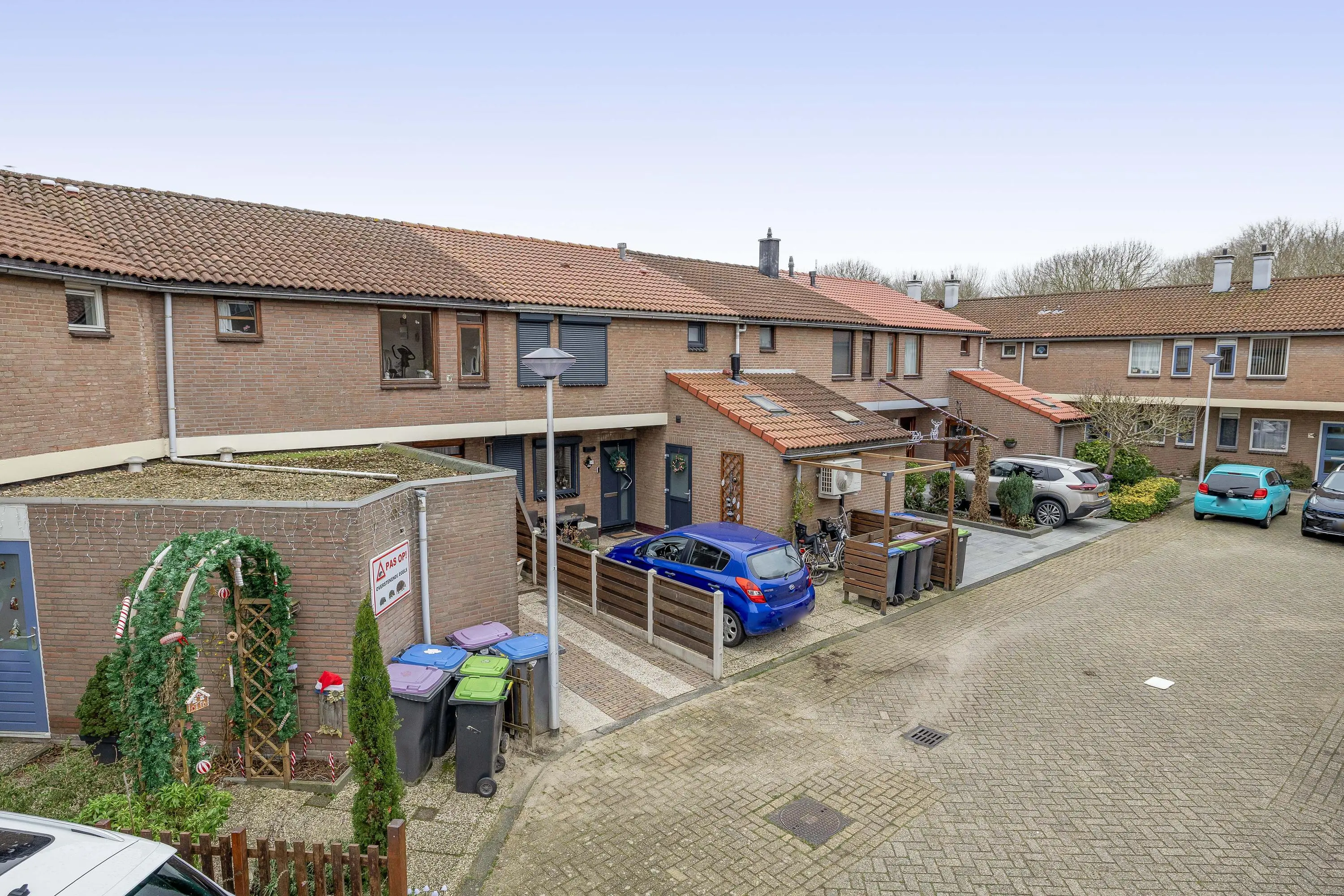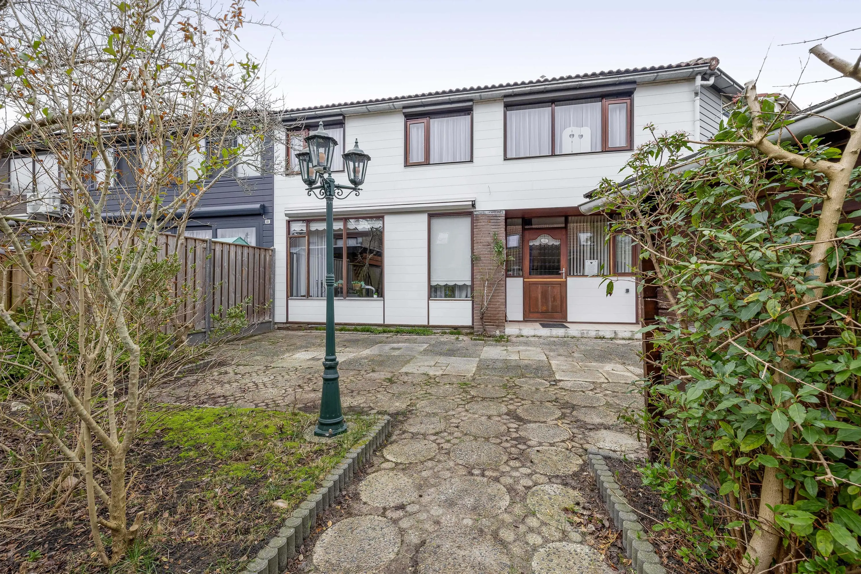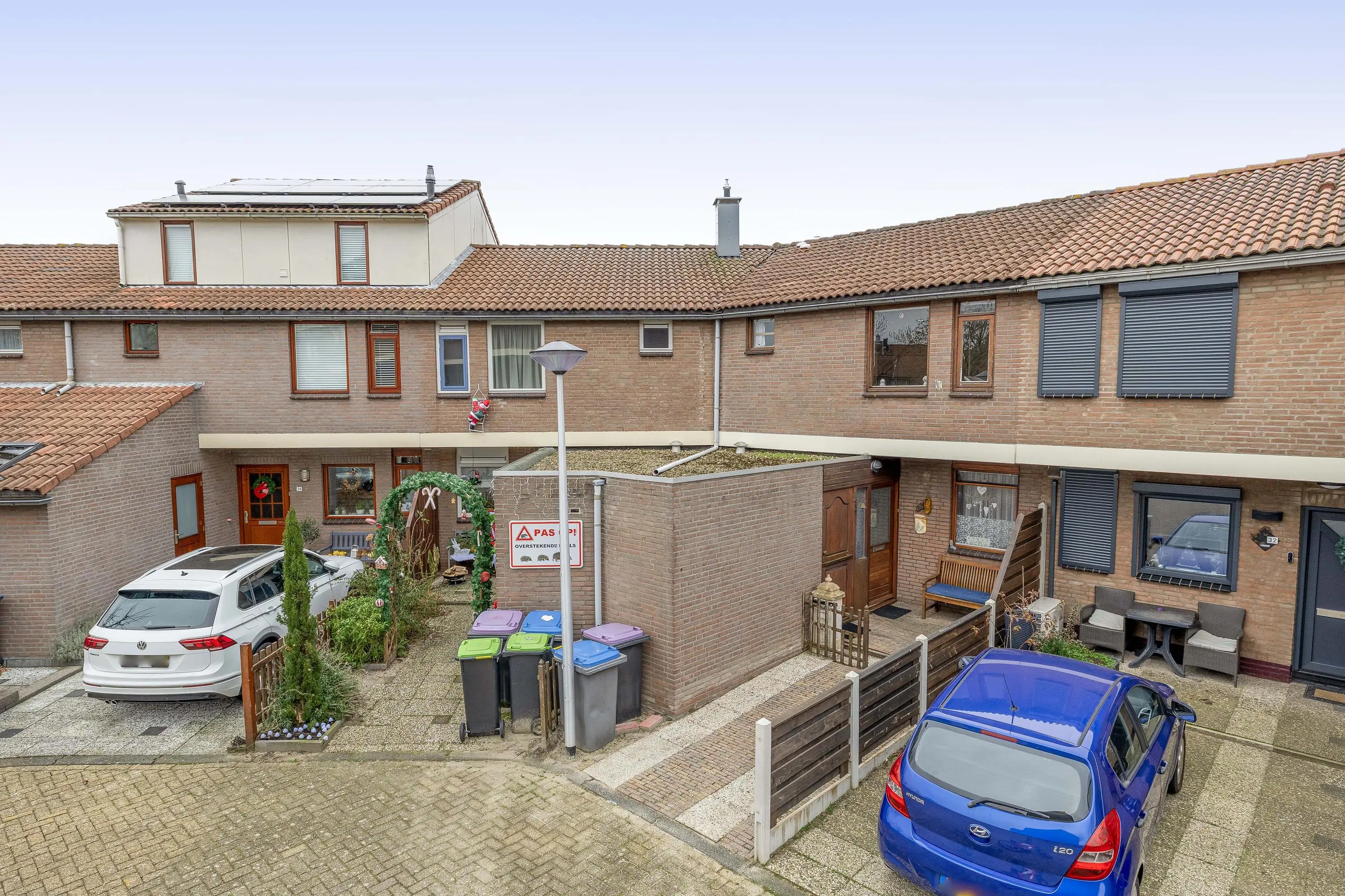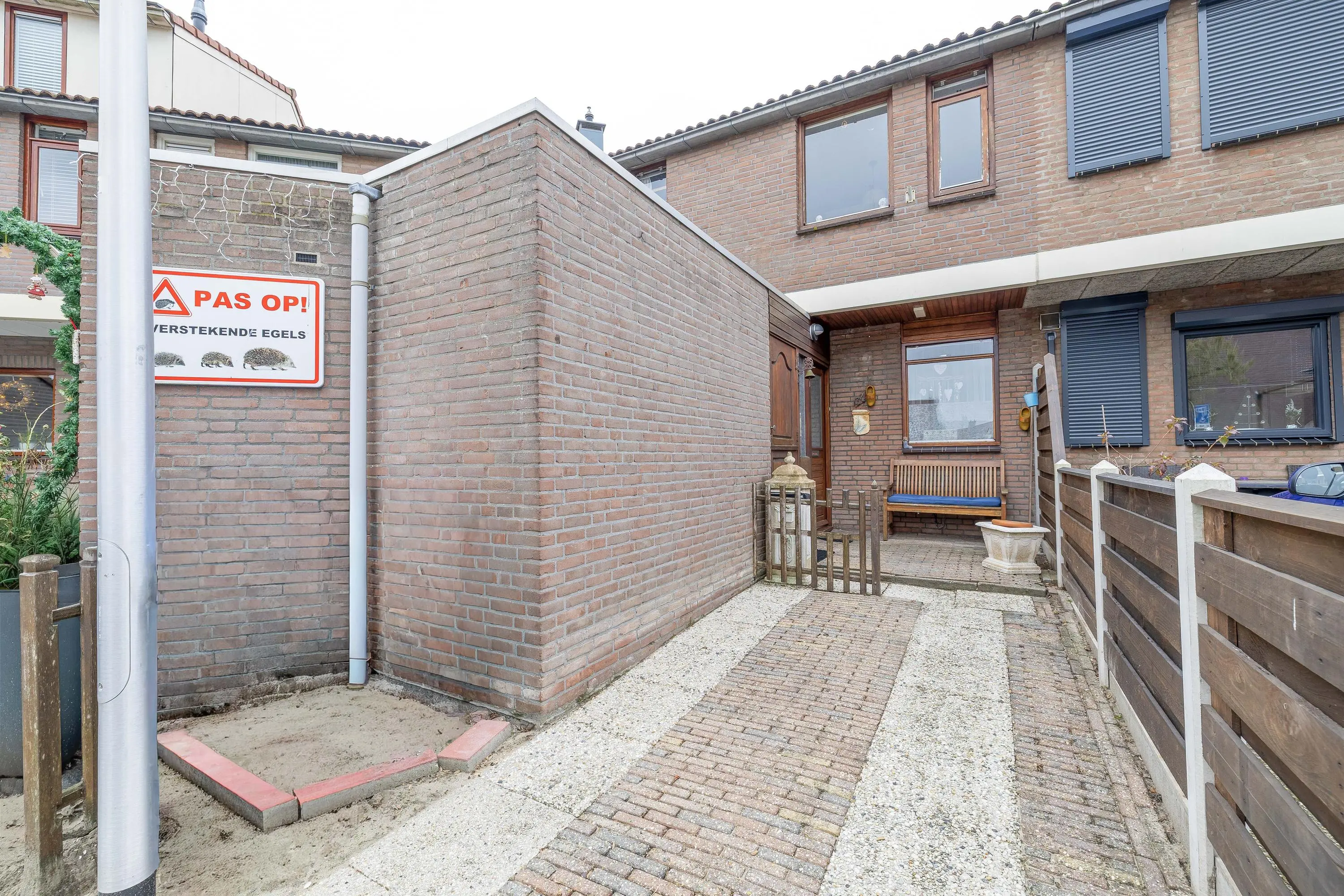 De voortuin is volledig betegeld en biedt toegang tot een stenen berging.