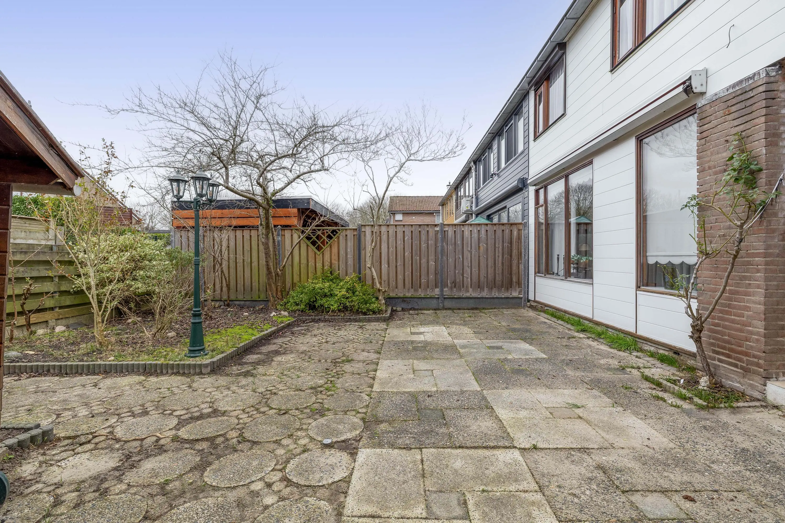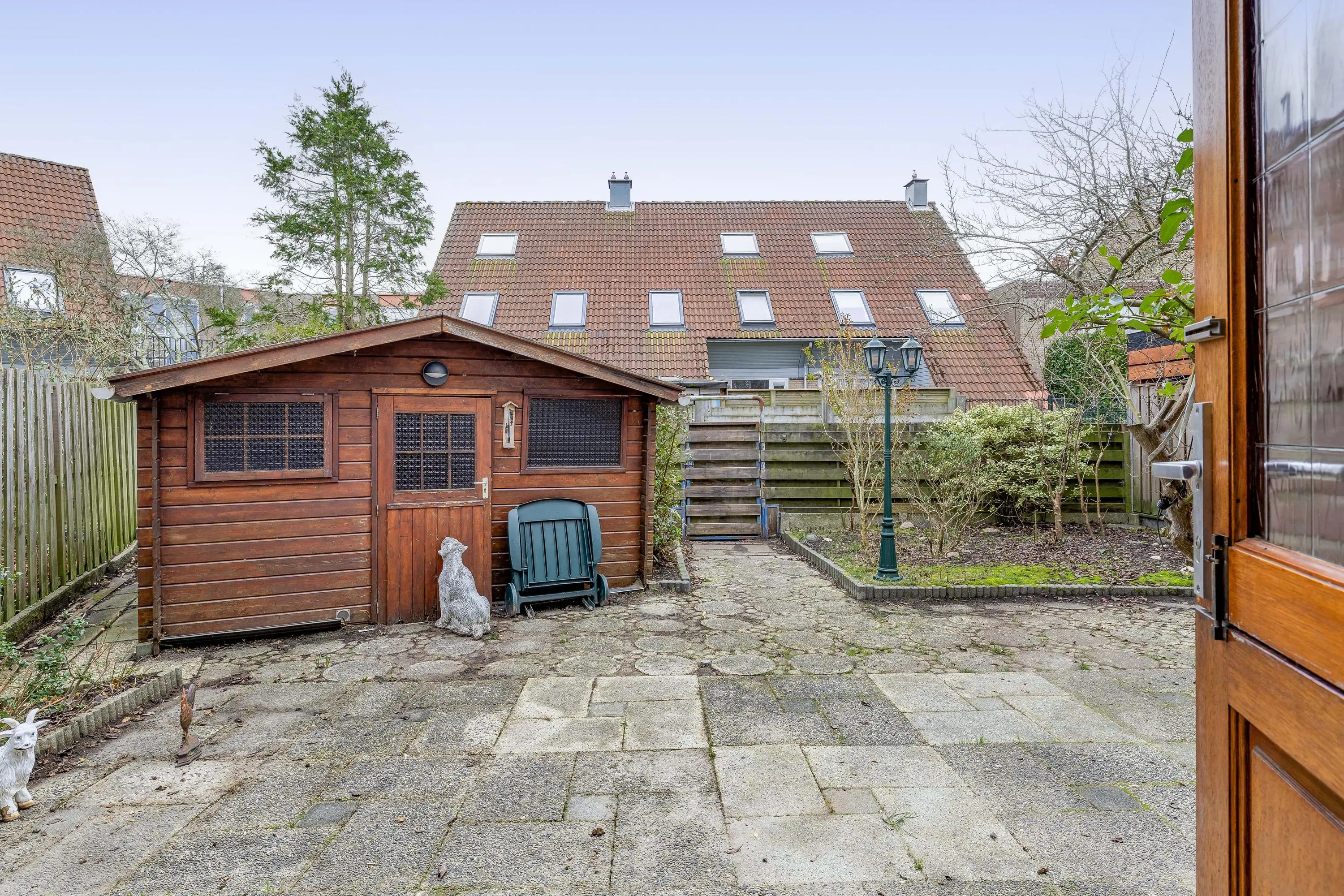 De achtertuin is ruim van opzet, deels betegeld en voorzien van borders voor beplanting. Daarnaast is er een praktische houten berging aanwezig en is de tuin bereikbaar via een achterom.