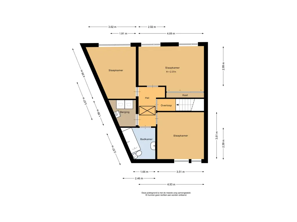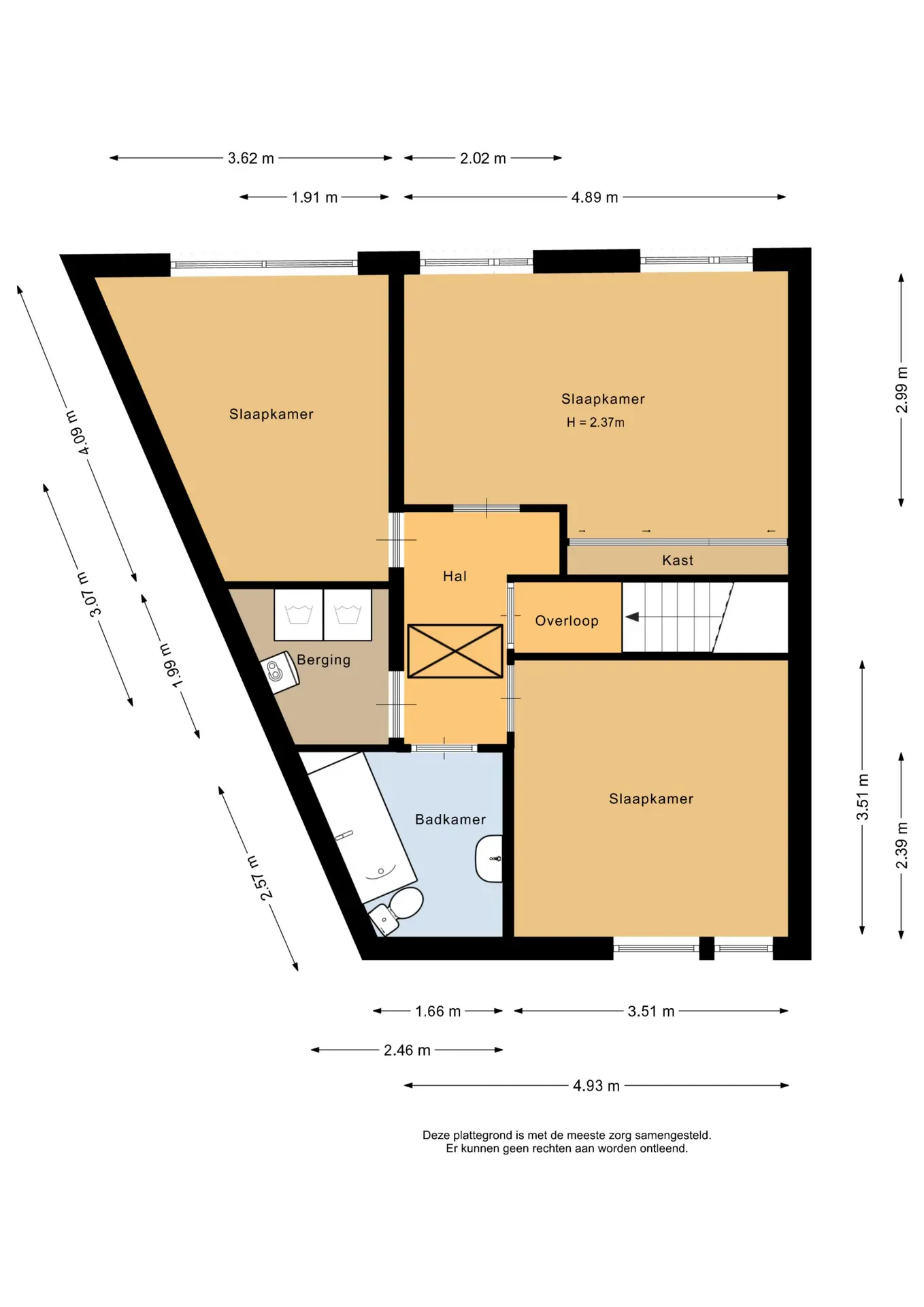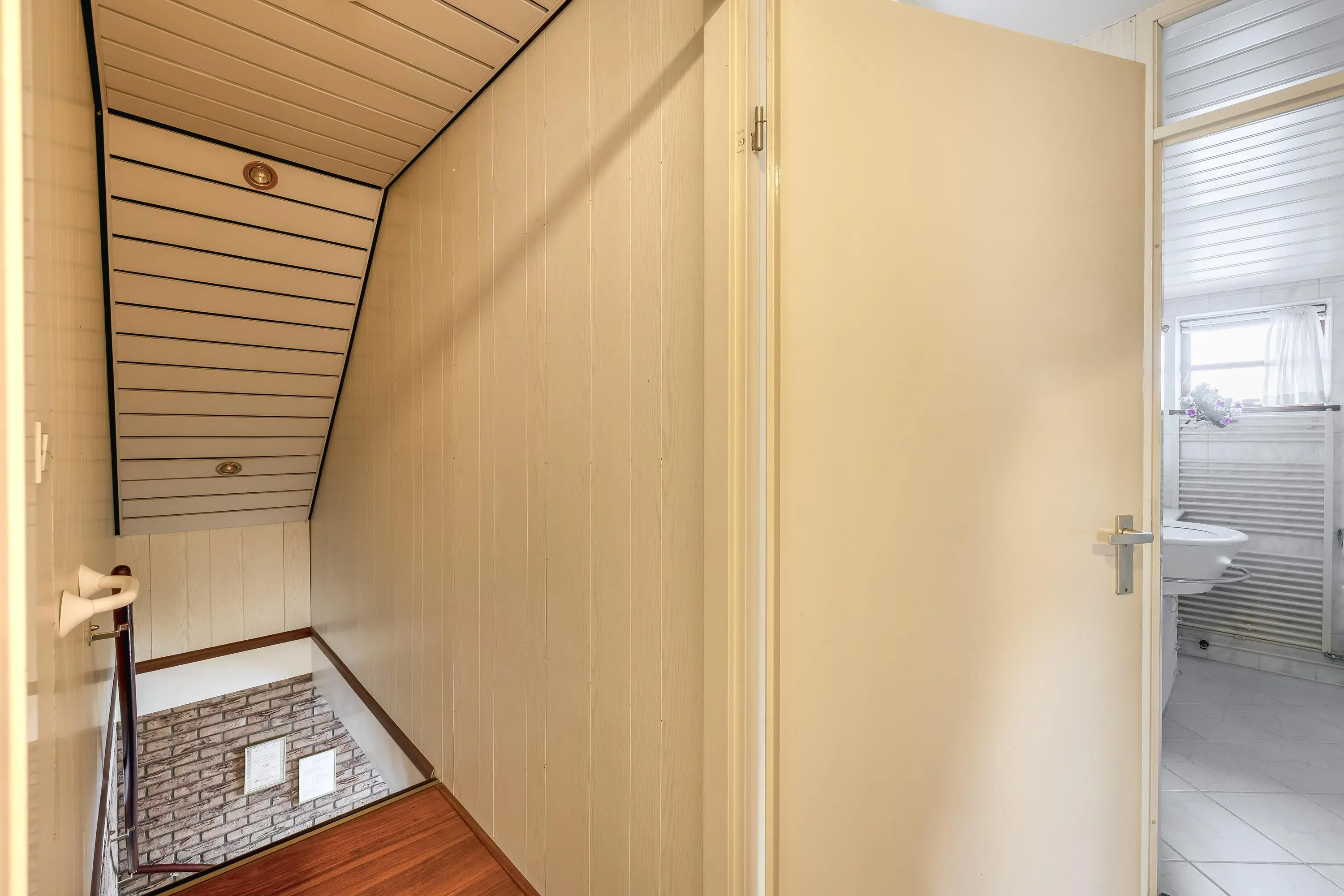 Vanaf de overloop zijn de drie slaapkamers, de badkamer, een aparte bergruimte en de ruime vliering bereikbaar. De vliering biedt eenvoudig extra opslagruimte.