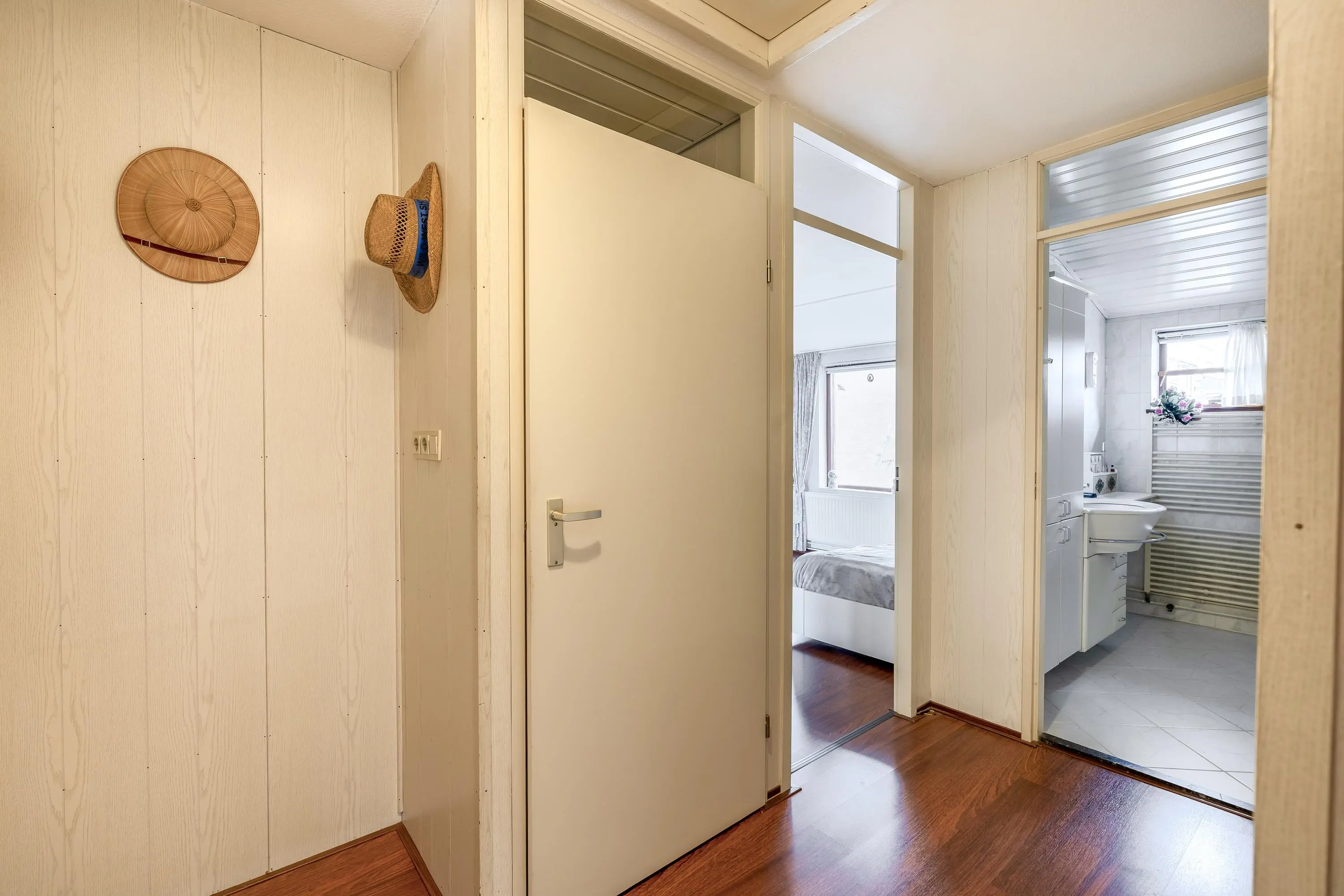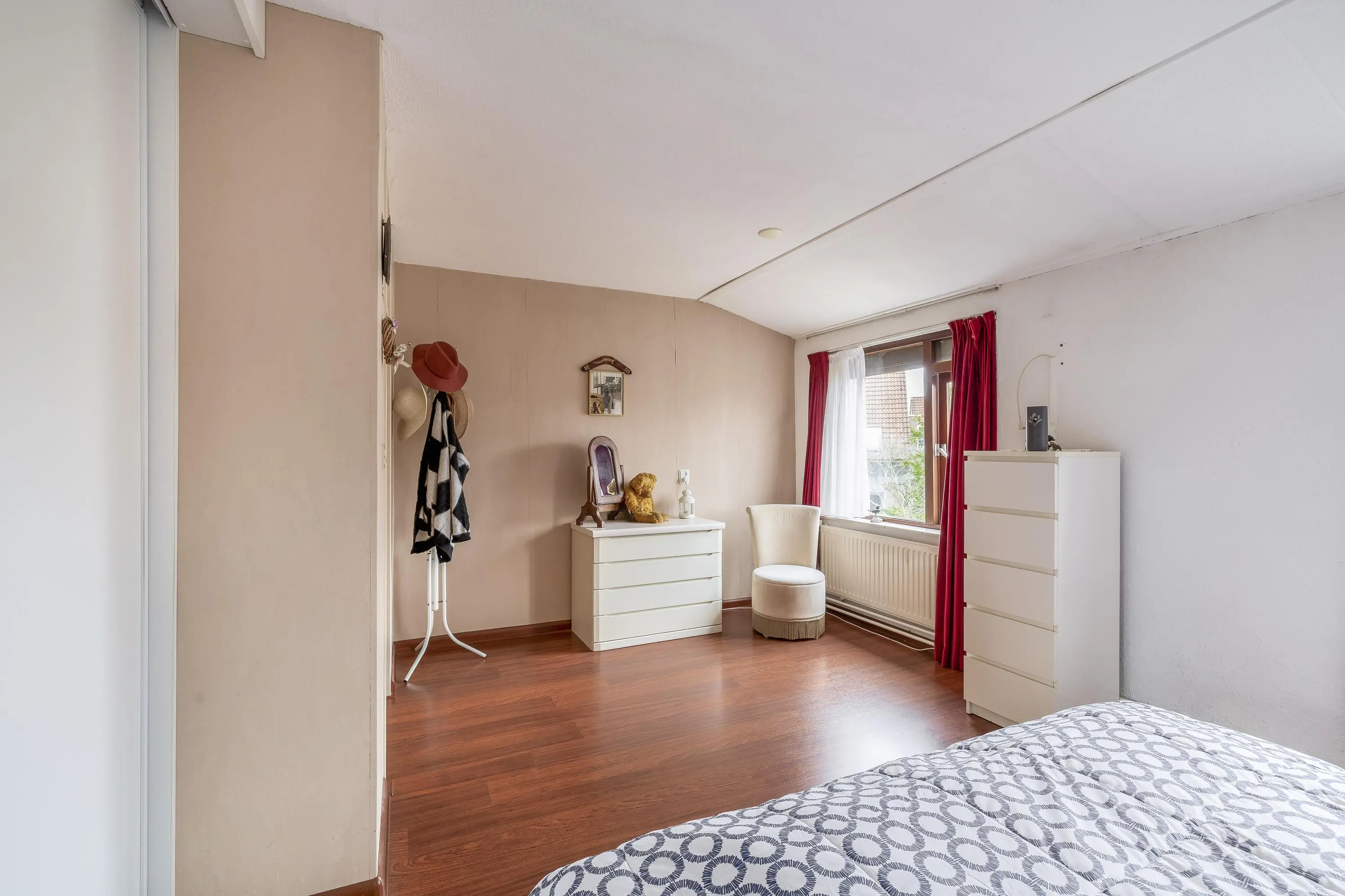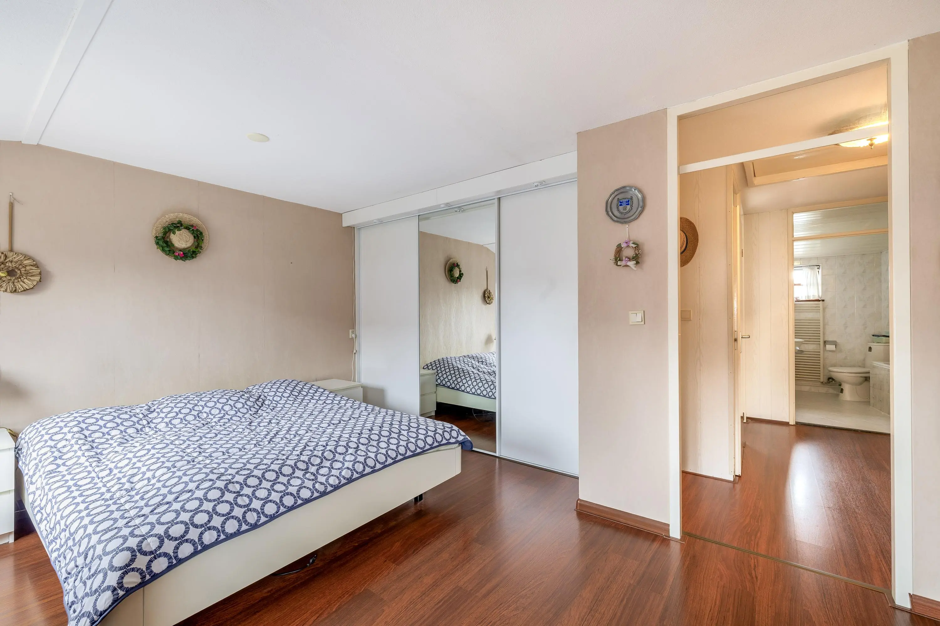 De hoofdslaapkamer aan de achterzijde is circa 14,5m² groot en voorzien van een vaste kast met schuifdeuren en rolluiken. De tweede slaapkamer, eveneens aan de achterzijde, meet circa 11m² en heeft ook een rolluik. Momenteel zijn dit twee slaapkamers, maar met een eenvoudige aanpassing kunnen hier drie slaapkamers van gemaakt worden, zoals oorspronkelijk vanuit de bouw mogelijk was. De derde slaapkamer aan de voorzijde is circa 12,5m² en voorzien van een vaste kast. Alle slaapkamers zijn afgewerkt met laminaatvloeren en behangwanden, terwijl de overloop dezelfde laminaatvloer heeft. Dankzij de grote ramen genieten alle kamers van veel daglicht.