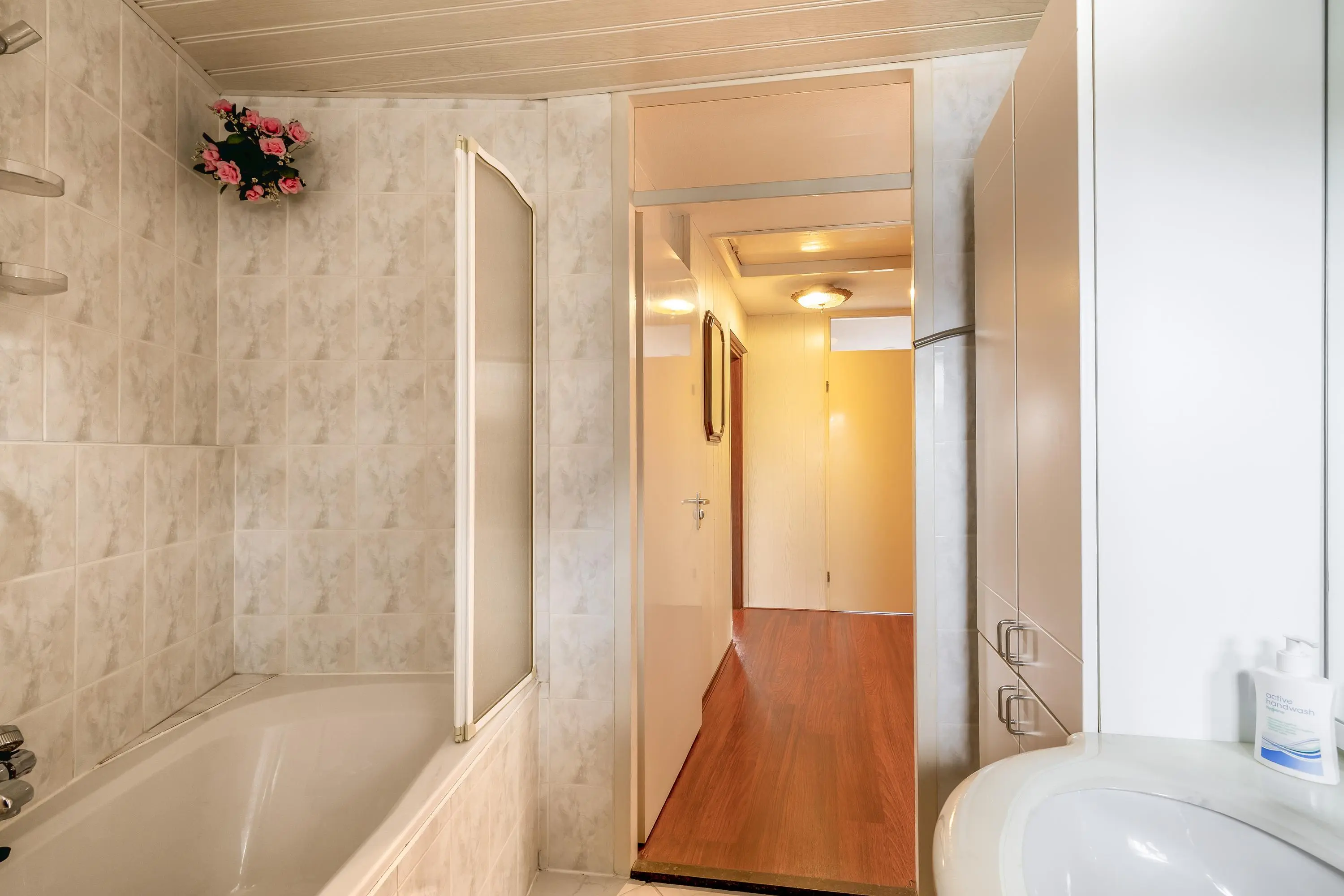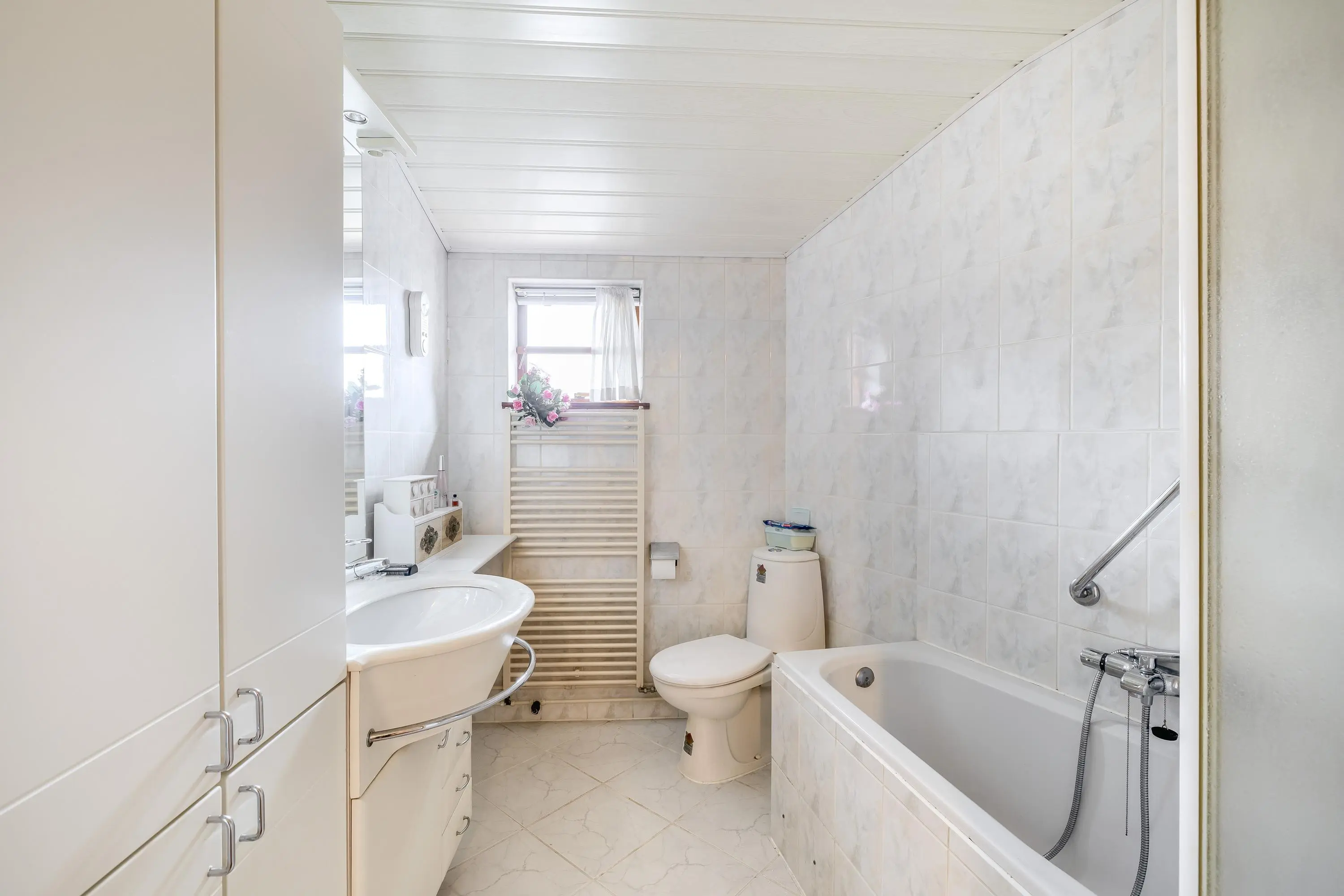 De volledig betegelde badkamer is uitgerust met een toilet, ligbad en een badkamermeubel.