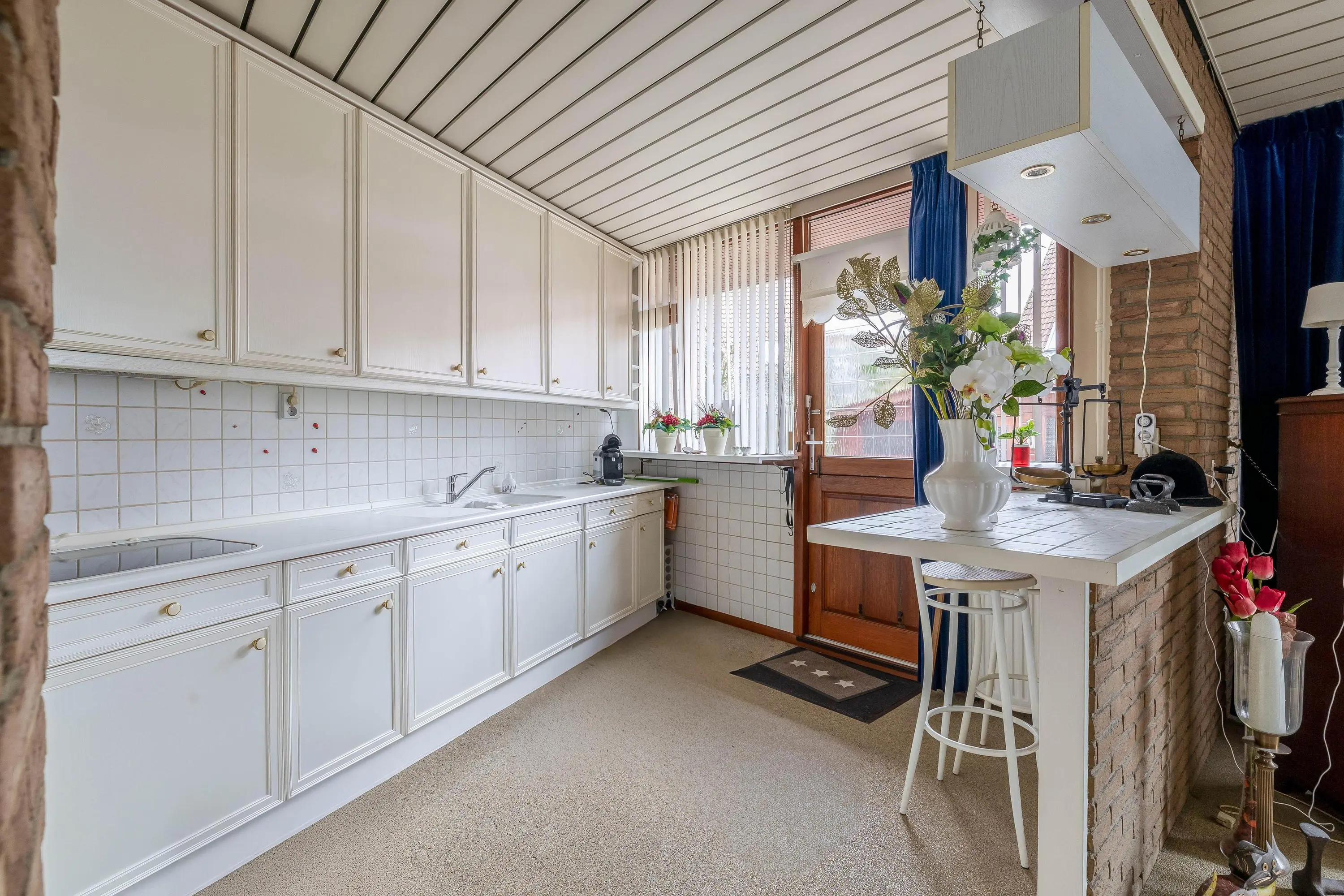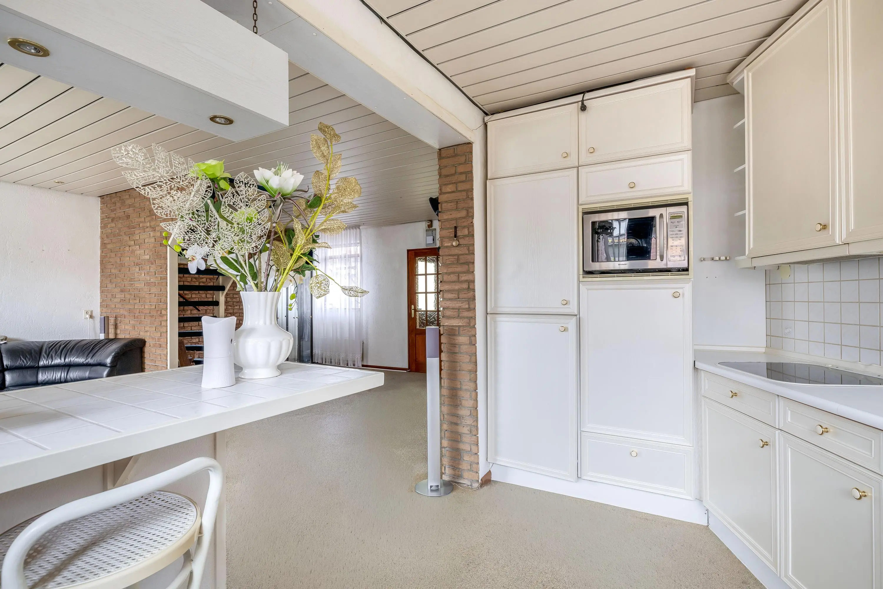 De halfopen keuken grenst direct aan de living en is uitgerust met een keramische kookplaat, afzuigkap, combimagnetron, vaatwasser, close-in boiler, koelkast en vriezer. Vanuit de keuken is de achtertuin via een enkele deur bereikbaar.
