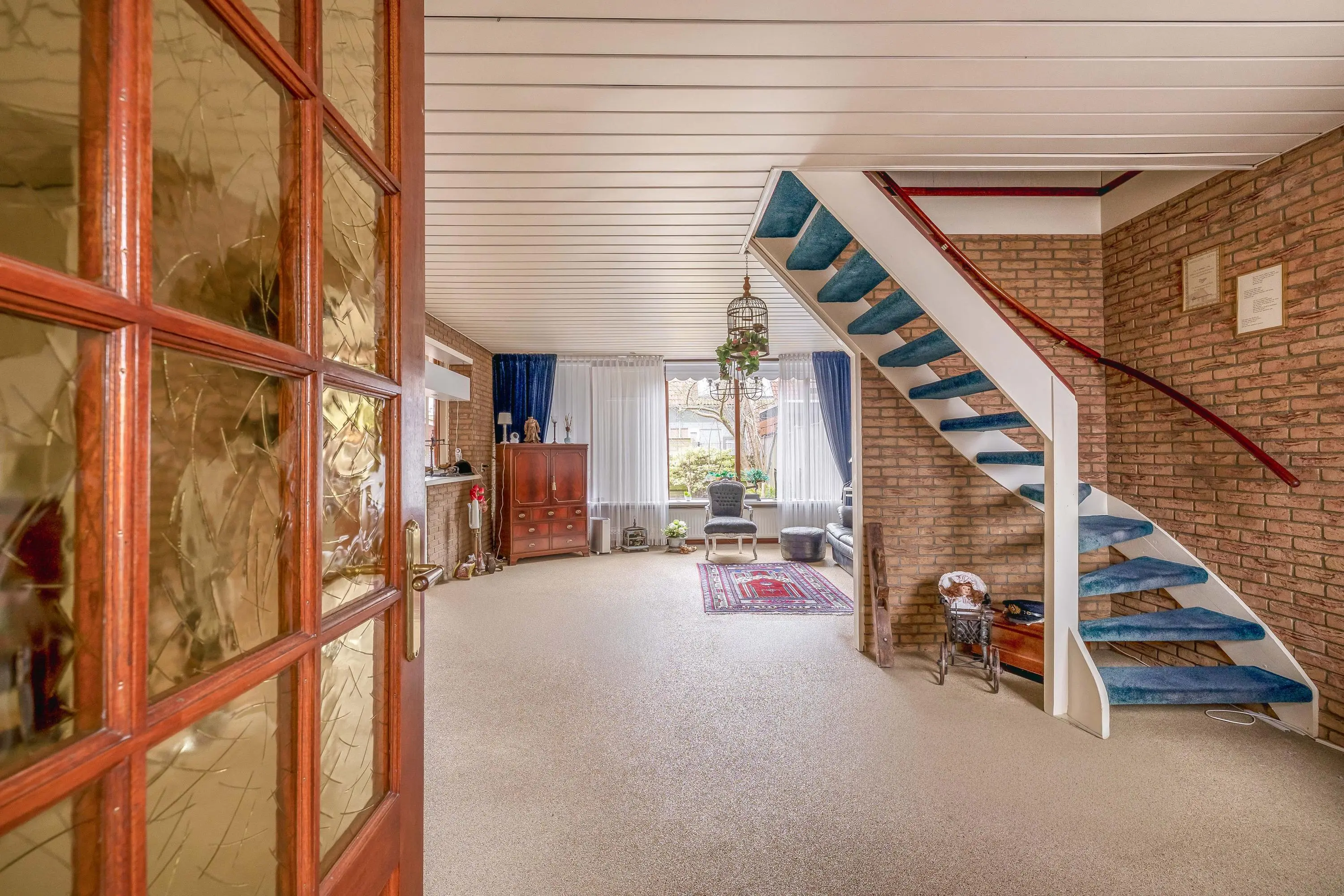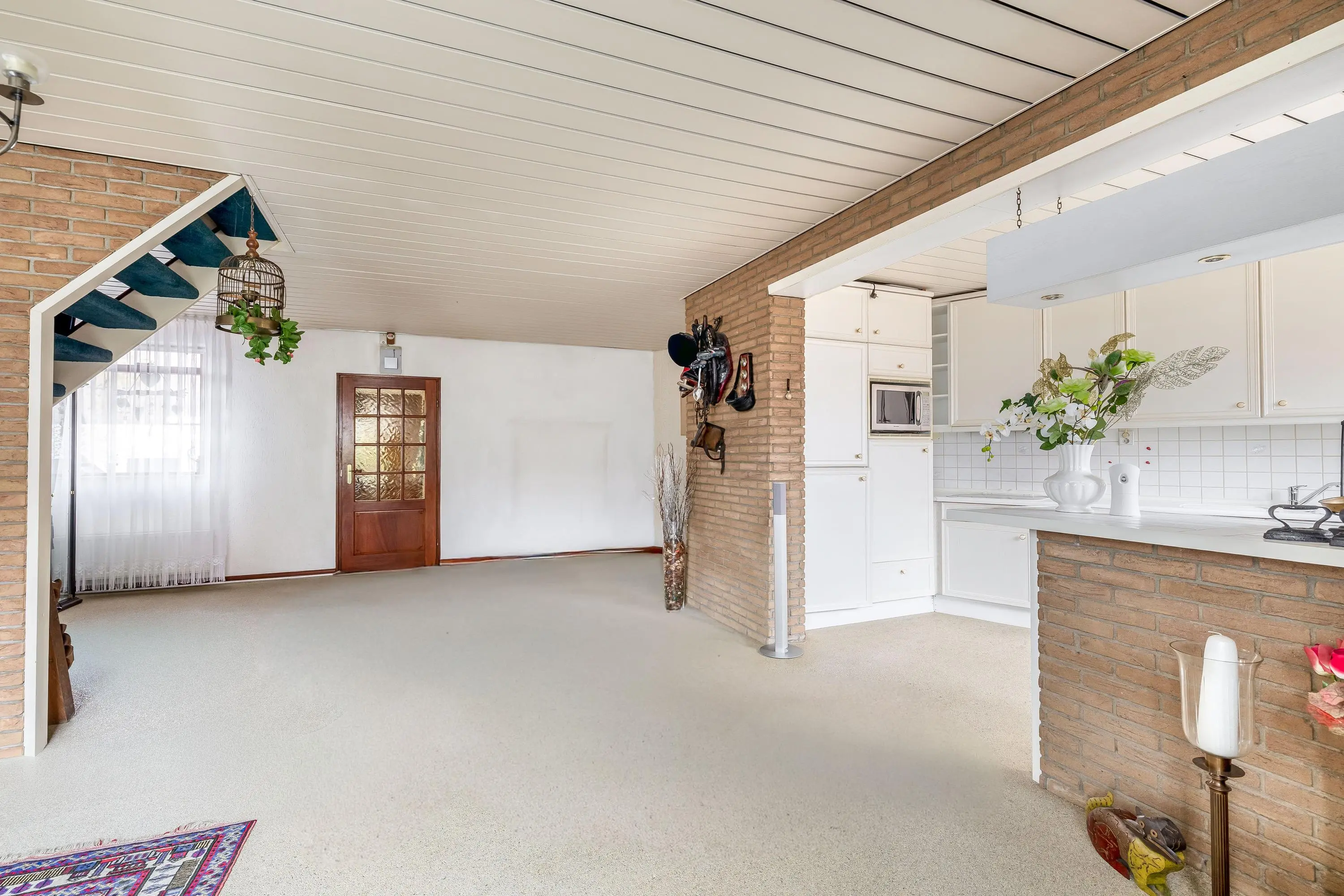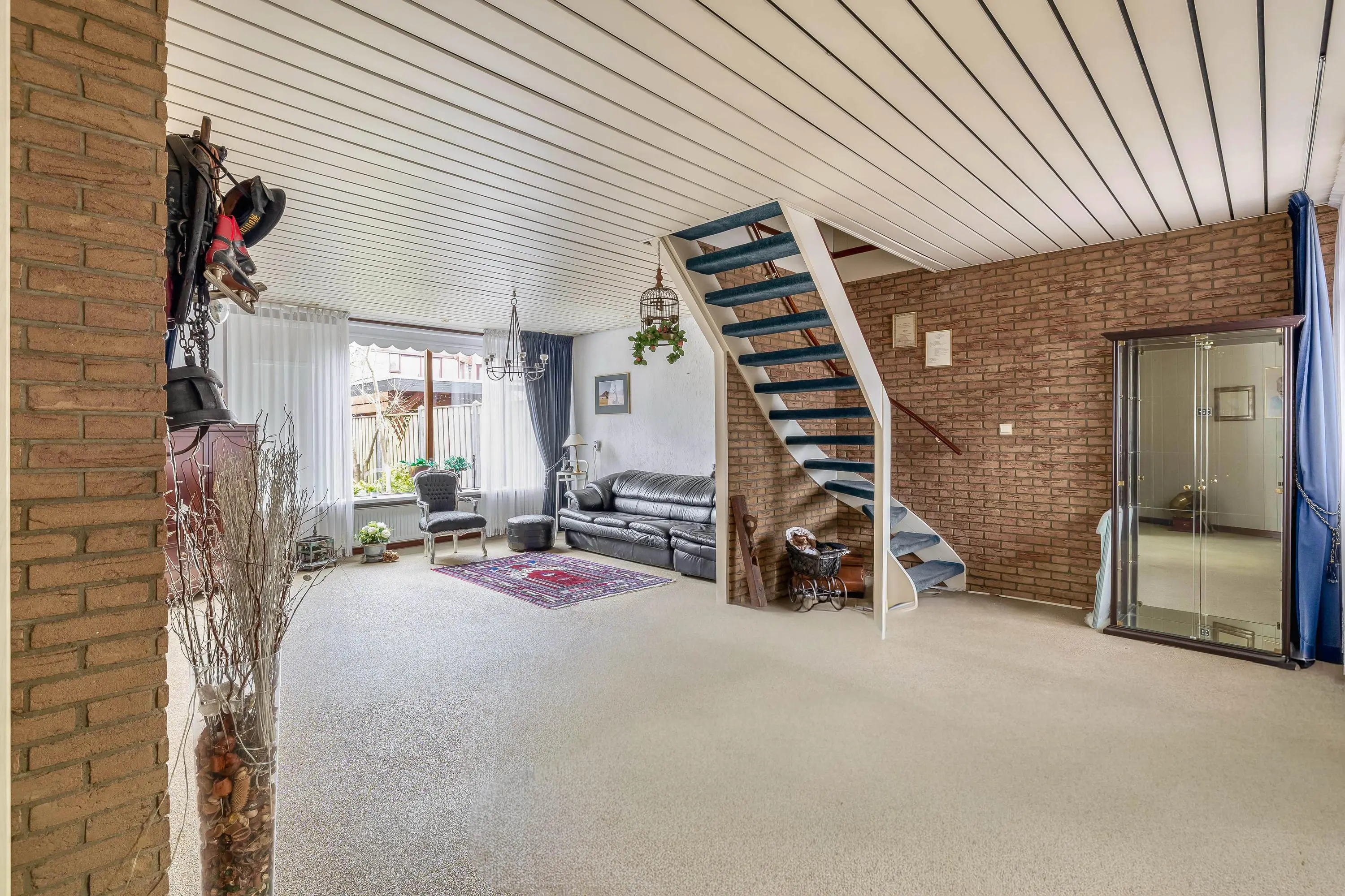 De open living is royaal van opzet, waardoor er eenvoudig een apart zit- en eetgedeelte gecreëerd kan worden. Grote raampartijen aan de achterzijde zorgen voor veel daglicht, terwijl het kleinere raam aan de voorzijde bijdraagt aan een knus en sfeervol karakter. Het raam aan de achterzijde is voorzien van een zonnescherm. De vloer is afgewerkt met een grindvloer, de wanden zijn deels voorzien van granol met sierstrips en het plafond bestaat uit aluminium lamellen. In de living bevindt zich tevens de trapopgang naar de eerste verdieping.