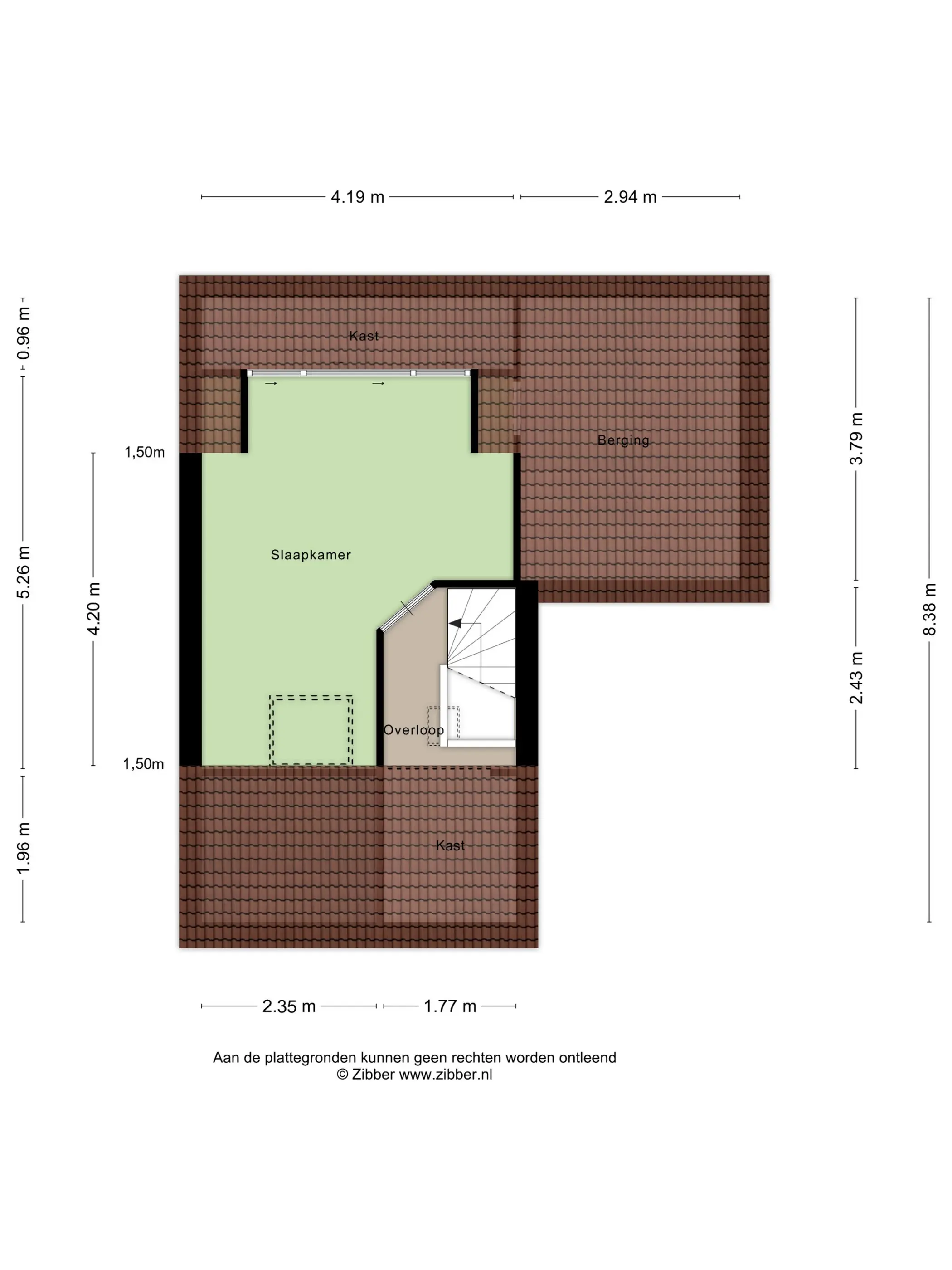 De zolderslaapkamer is door middel van een dakkapel uitgebouwd, waardoor er een ruime kamer is ontstaan van circa 17,5m². Deze kamer is voorzien van een nette laminaatvloer en beschikt over de omvormer van de zonnepanelen, de opstellingen van de cv-ketel en mechanische ventilatie, en de aansluitingen voor de wasmachine en droger. Daarnaast zijn er knieschotbergingen aanwezig en zorgt een dakraam aan de voorzijde voor extra lichtinval. Vanuit de slaapkamer is er toegang tot een kruipruimte die leidt naar een royale berging van circa 11m².