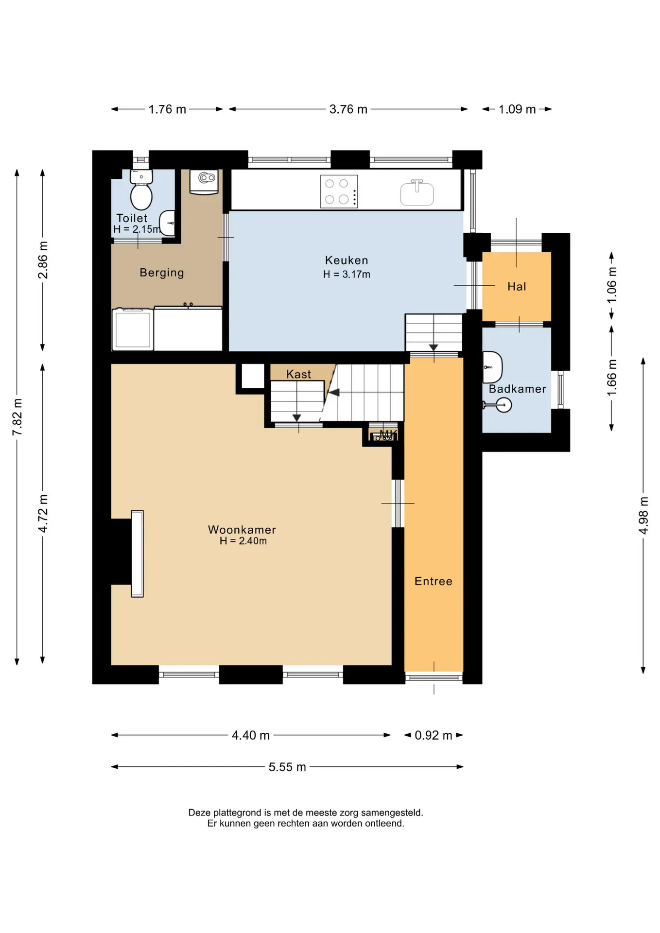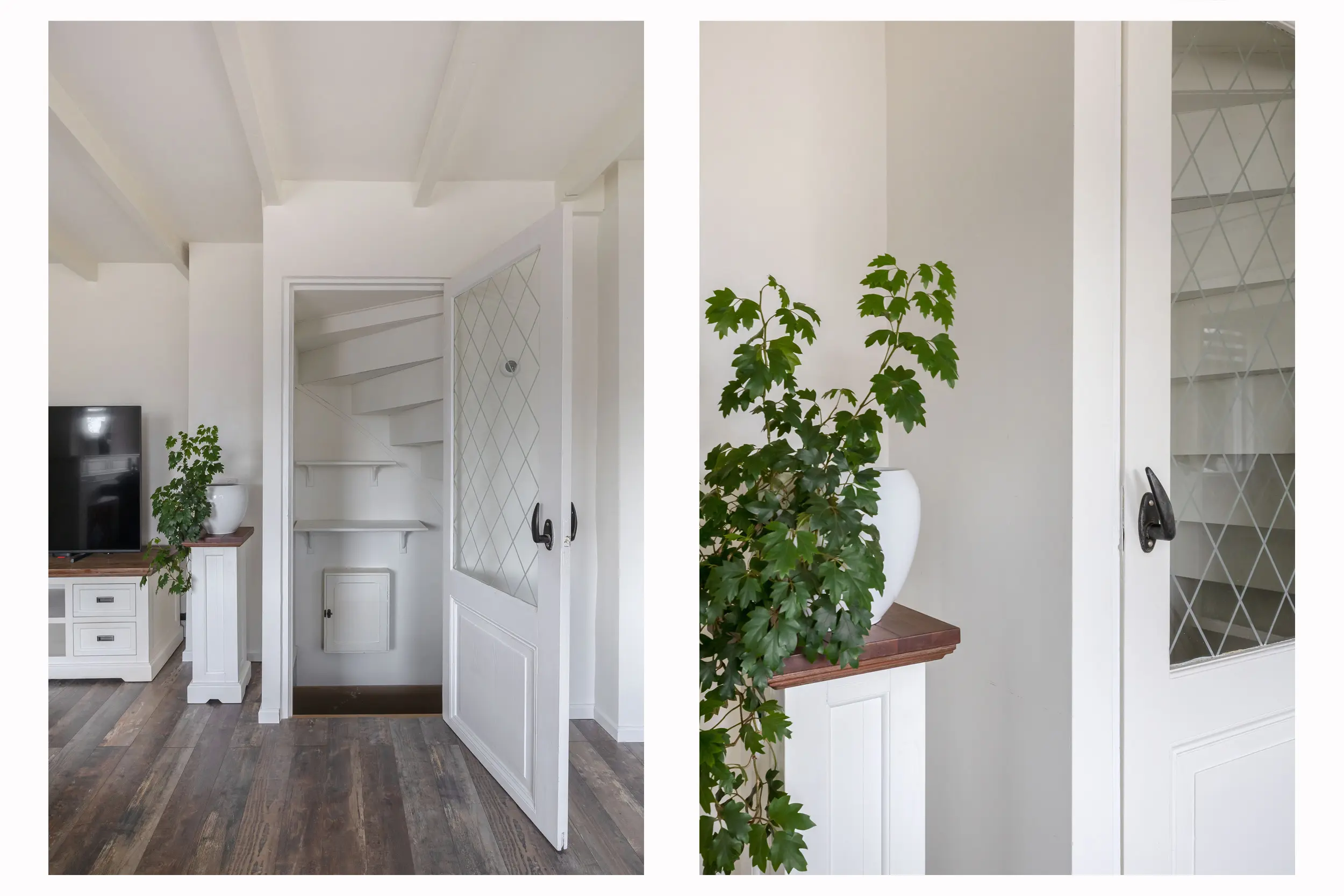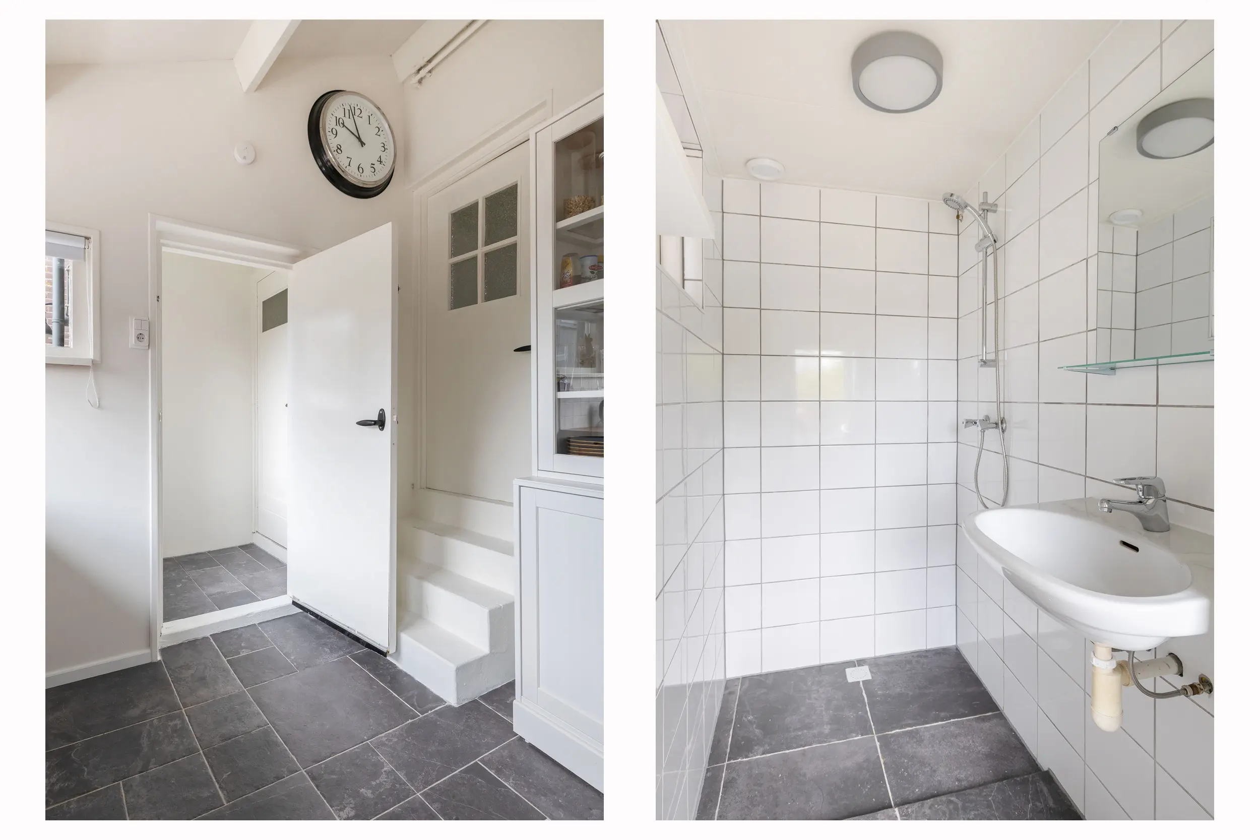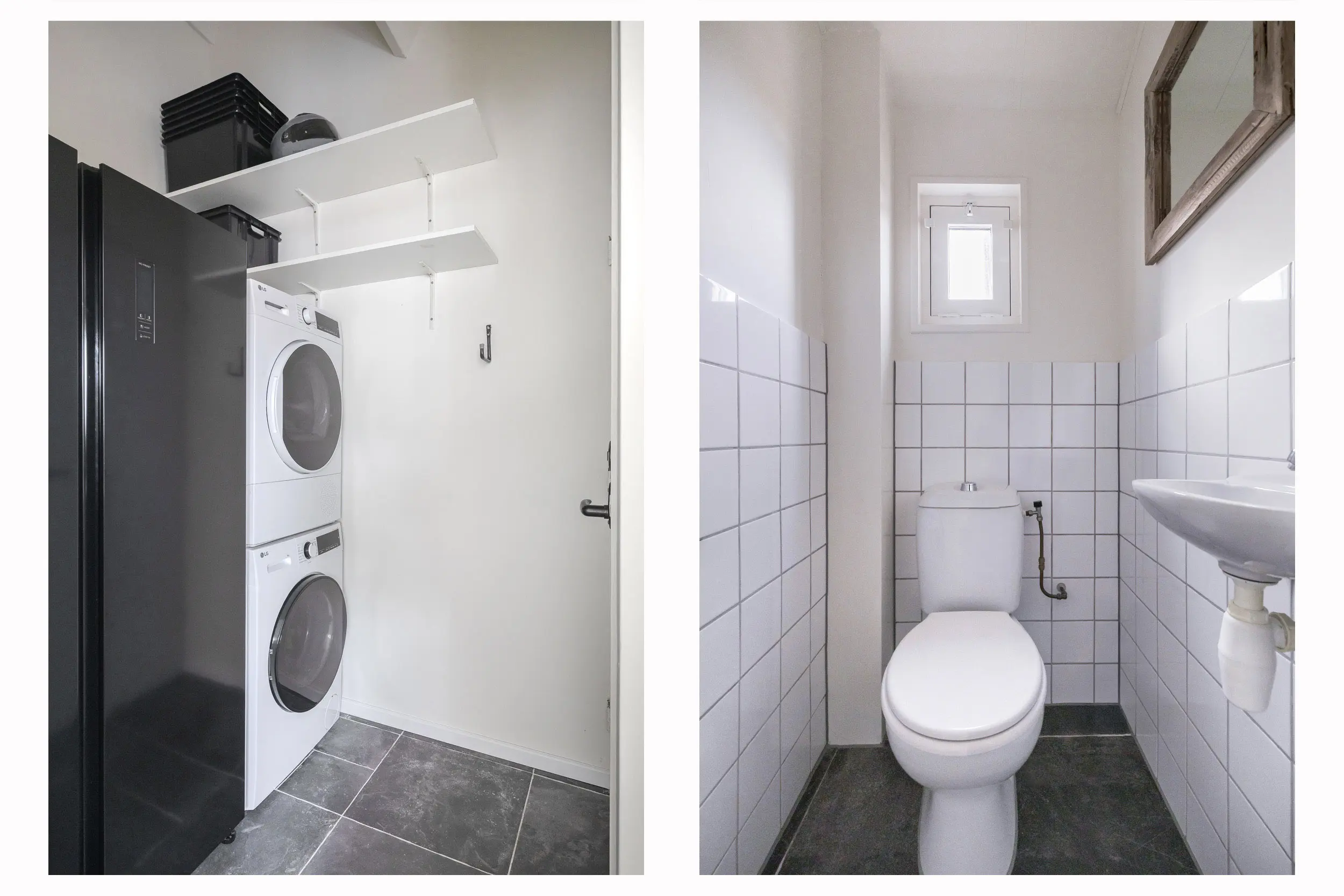 In de berging bevinden zich de aansluitingen voor de wasmachine en droger, evenals de cv-opstelling. Tevens is hier het separate toilet met fonteintje gesitueerd.